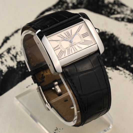 2005 Cartier Tank Divan 2612 with box, papers, and extra white leather strap