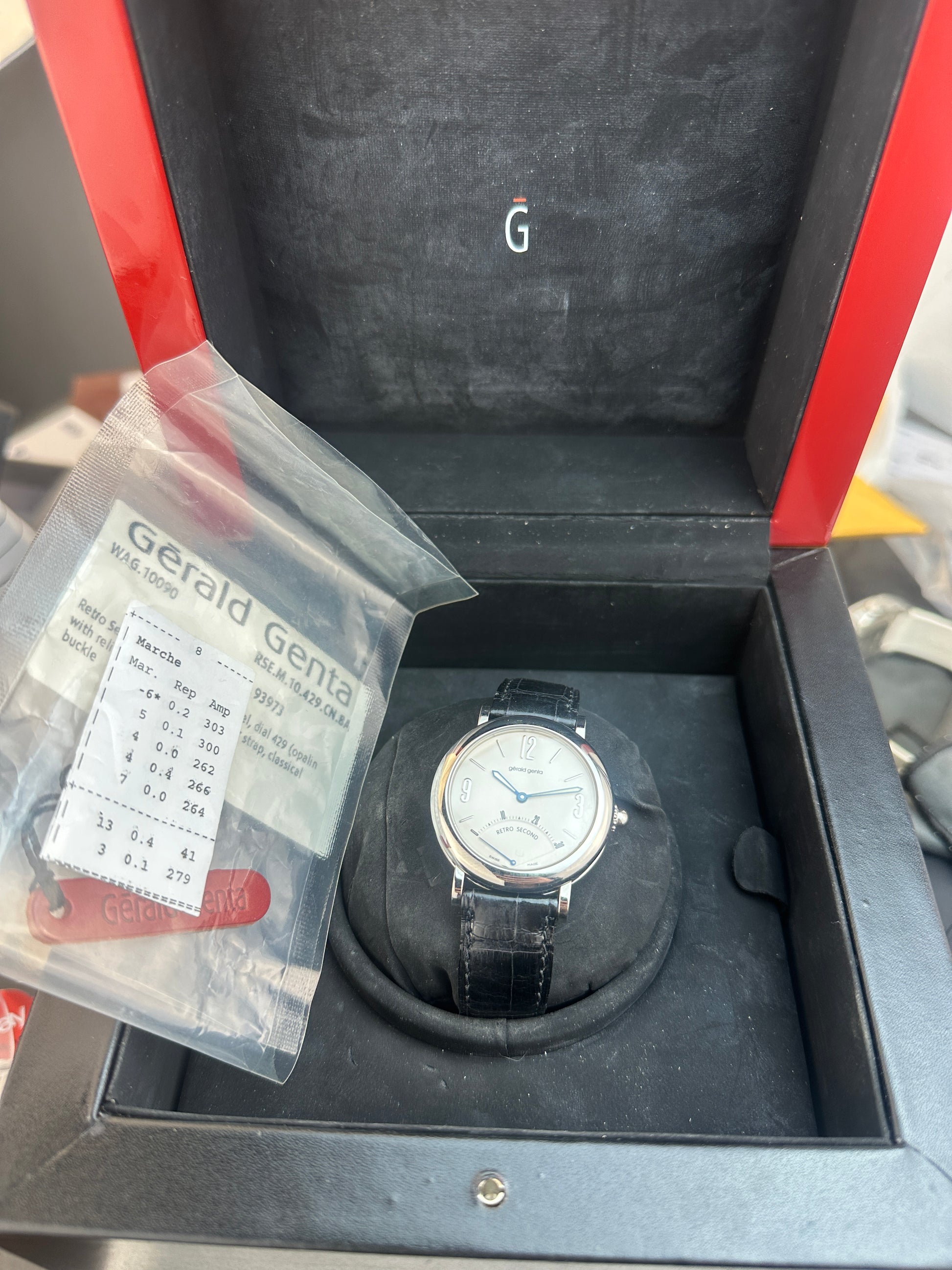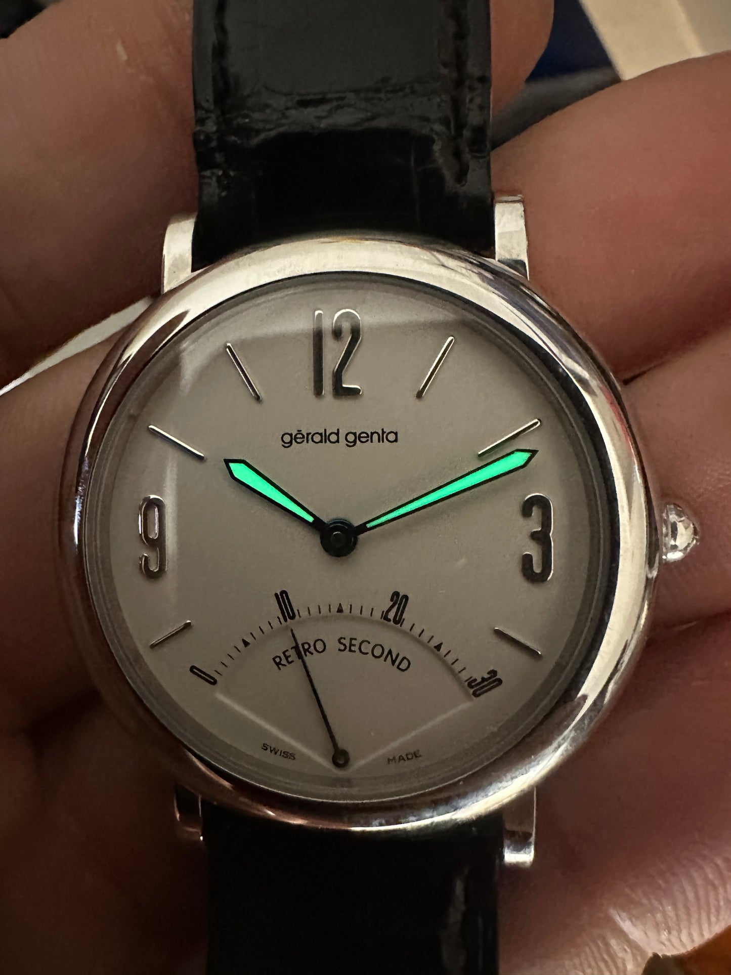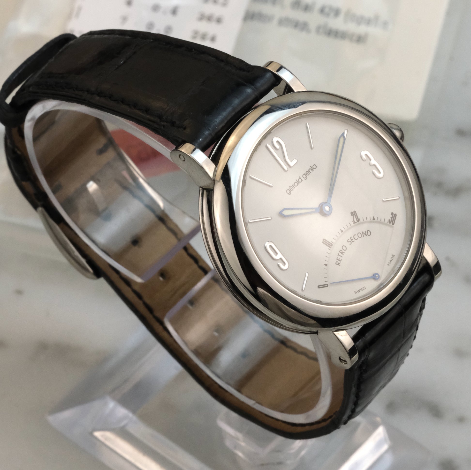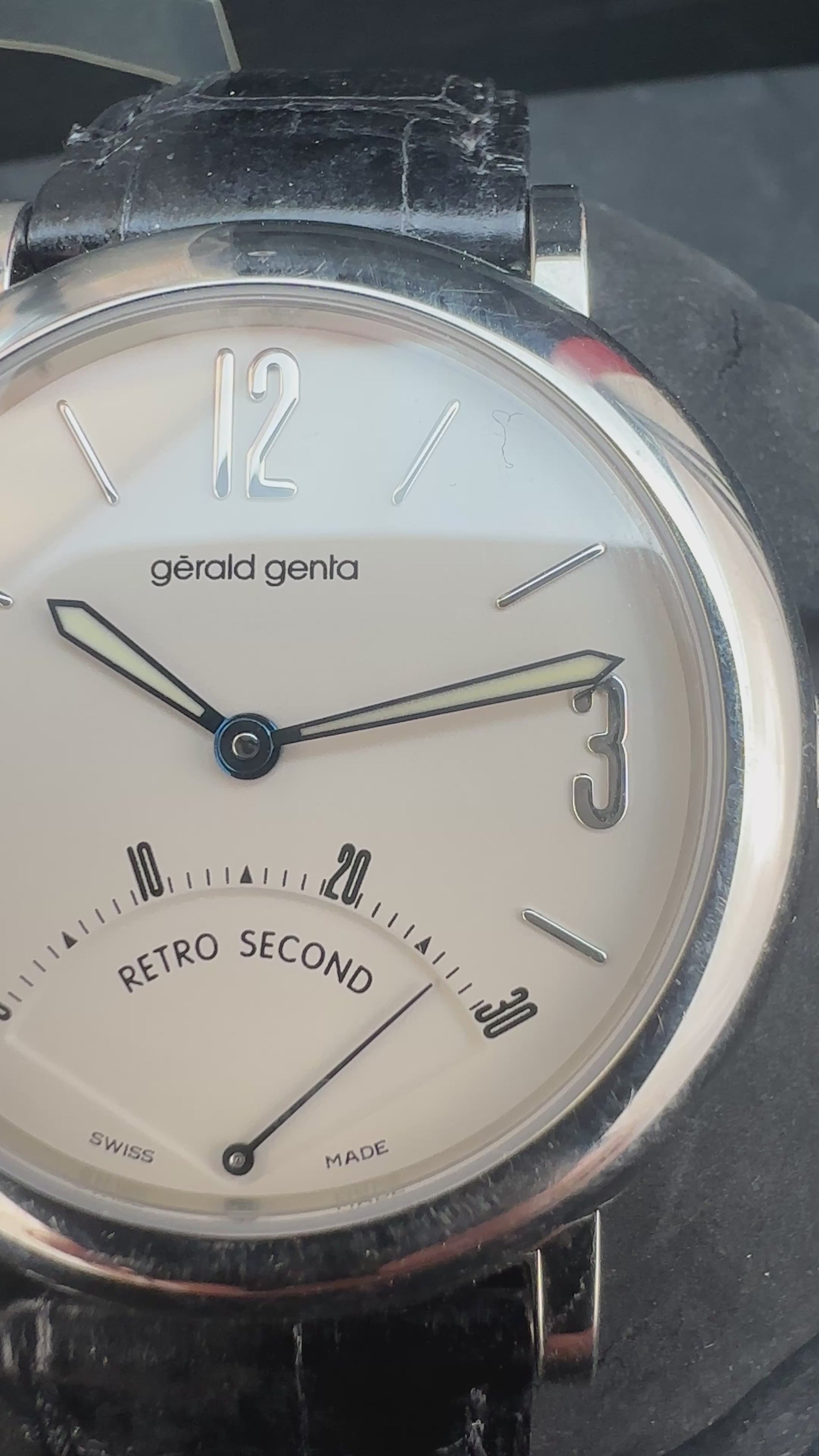 This watch includes its original Gerald Genta presentation box and hangtag—no papers. It's a rare piece from a now-defunct independent brand, and a meaningful link to one of the greatest watch designers in history.