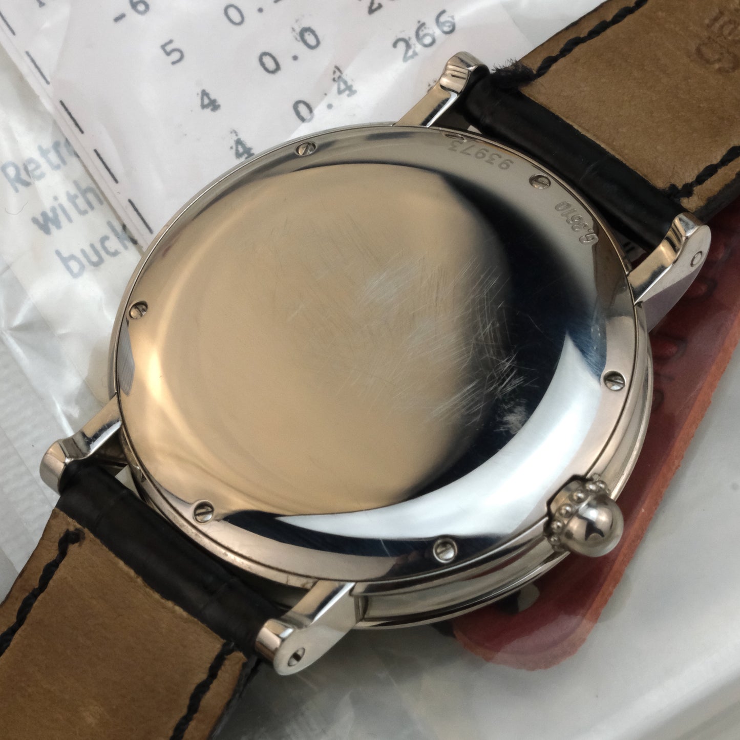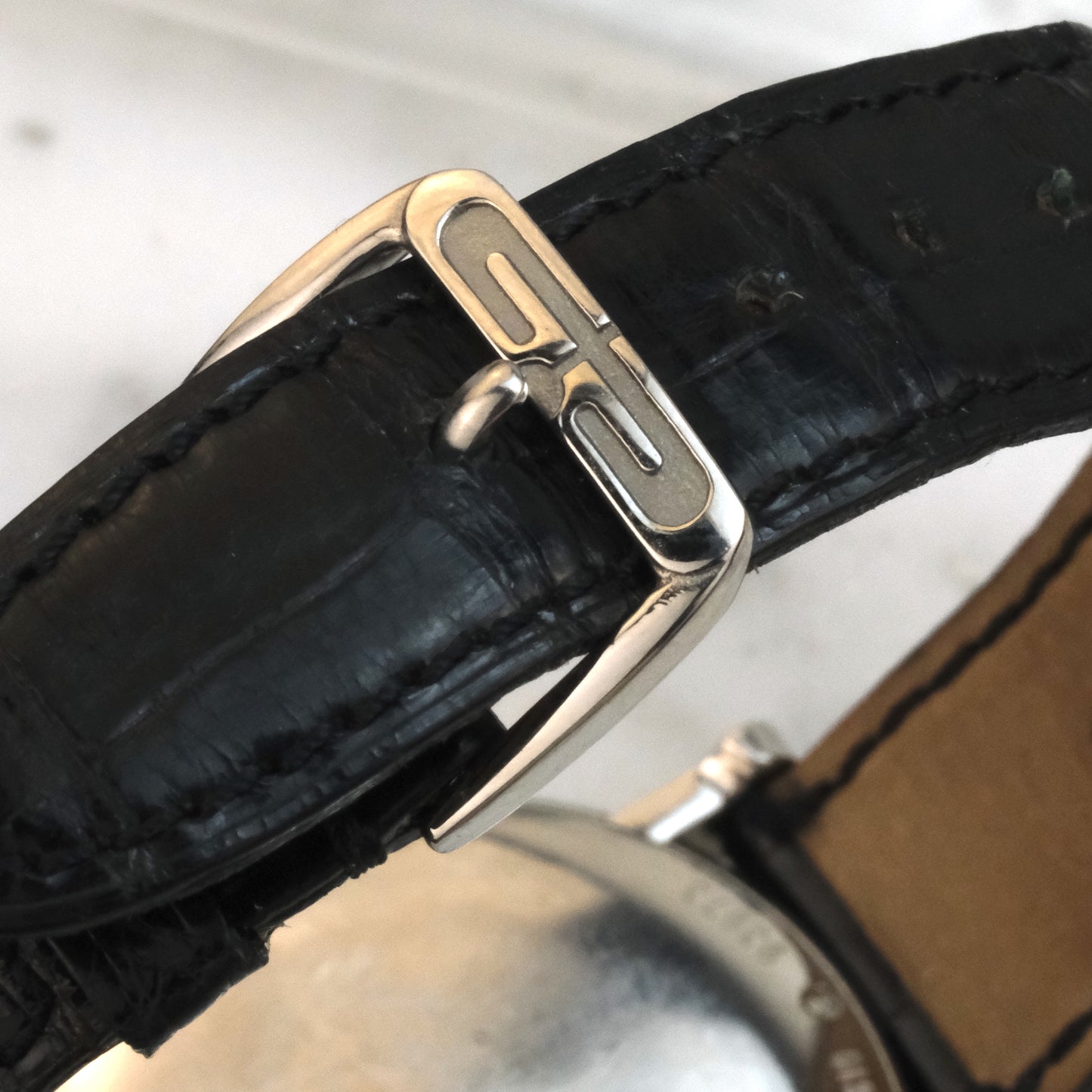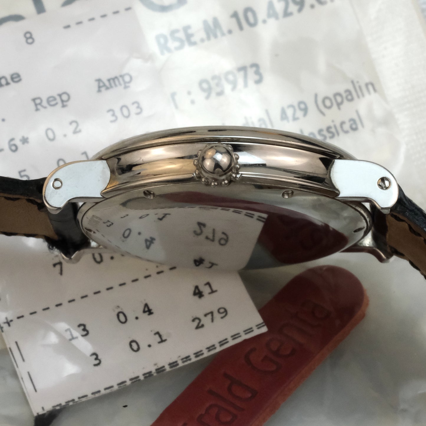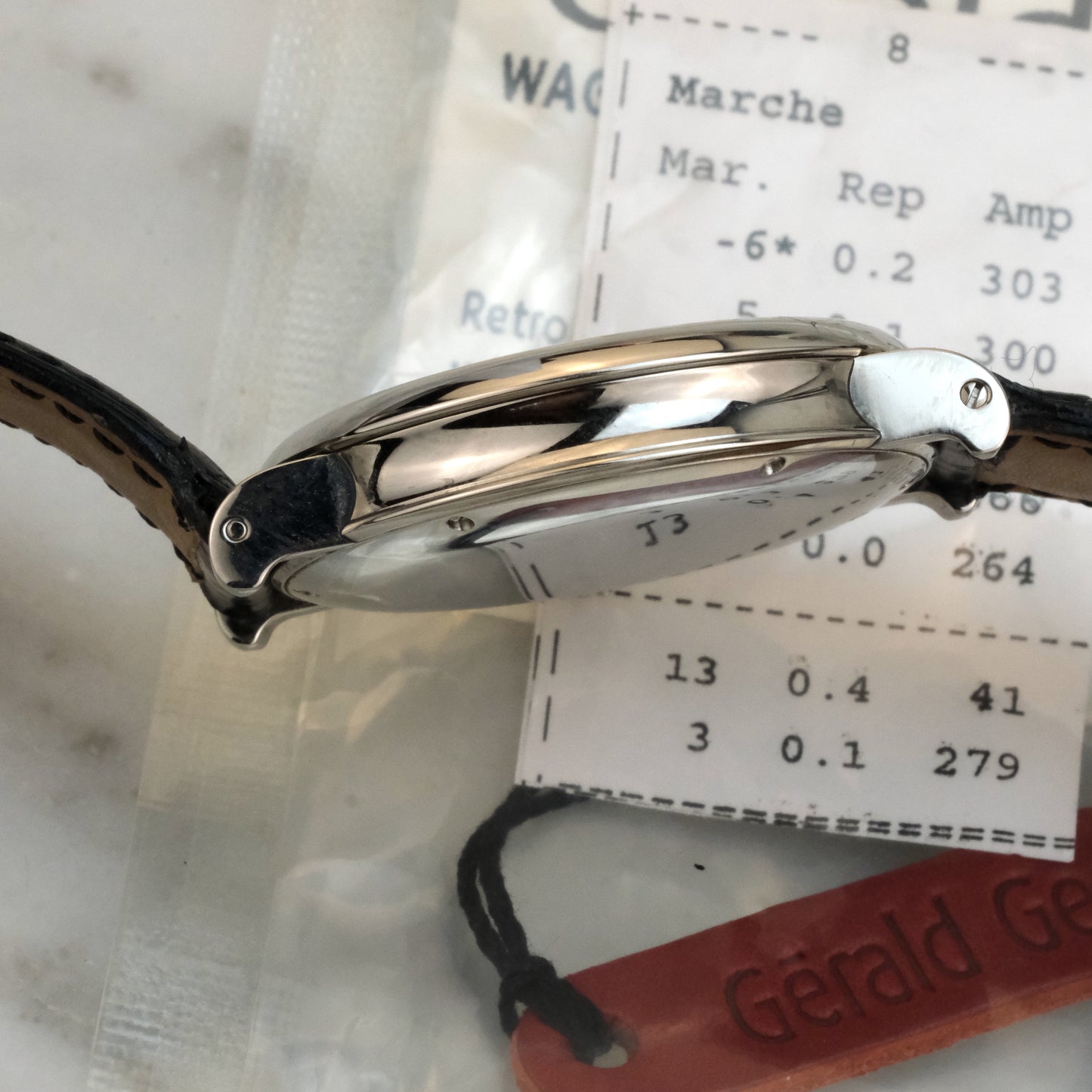 This watch includes its original Gerald Genta presentation box and hangtag—no papers. It's a rare piece from a now-defunct independent brand, and a meaningful link to one of the greatest watch designers in history.