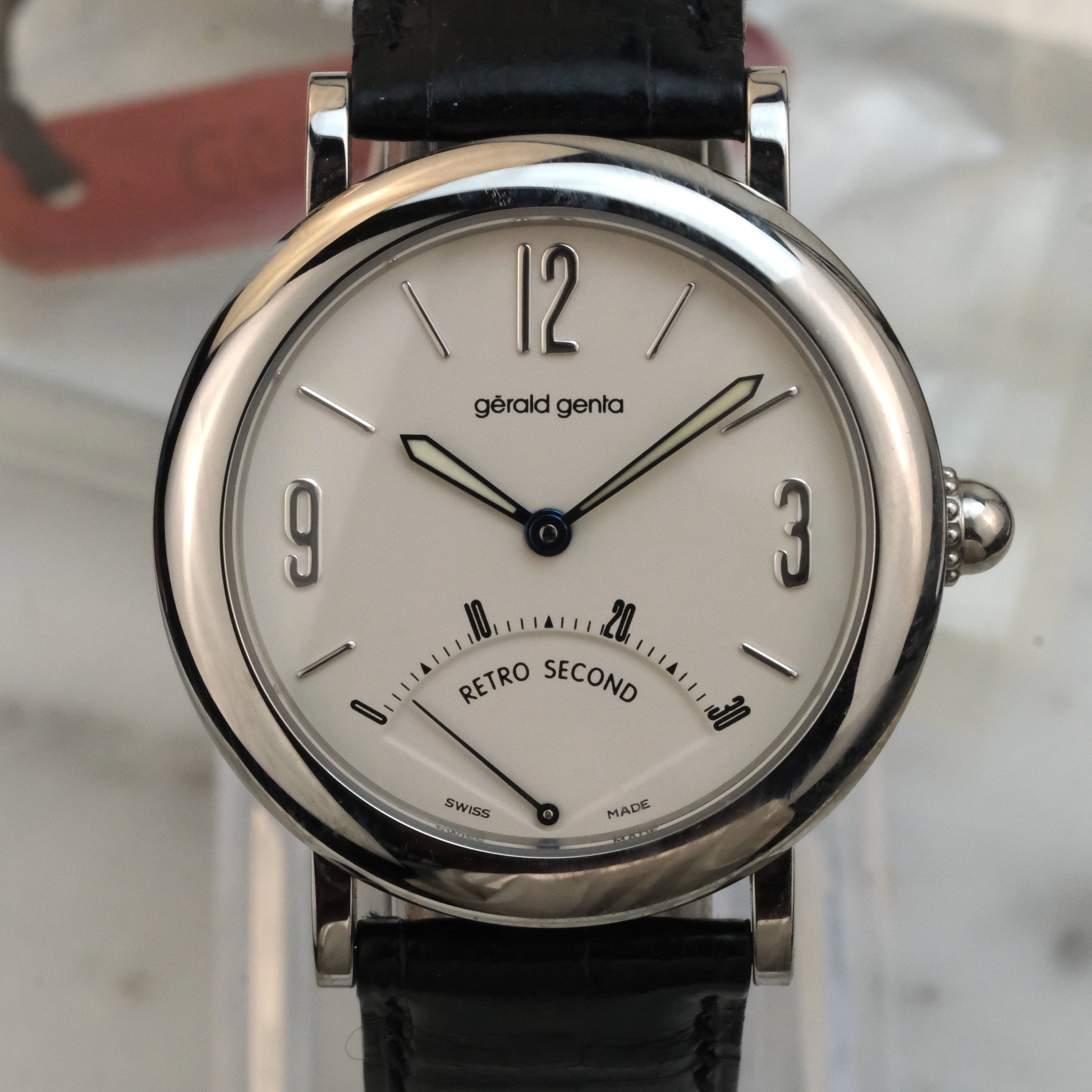 This particular example is beautifully preserved. The white dial features bold Arabic numerals and a retrograde seconds arc from 0 to 30 at 6 o’clock, with a slender blued hand sweeping upward before snapping back at the half-minute mark. A combination of classic layout and quirky detail, it epitomizes Genta's genius in blending tradition with play.