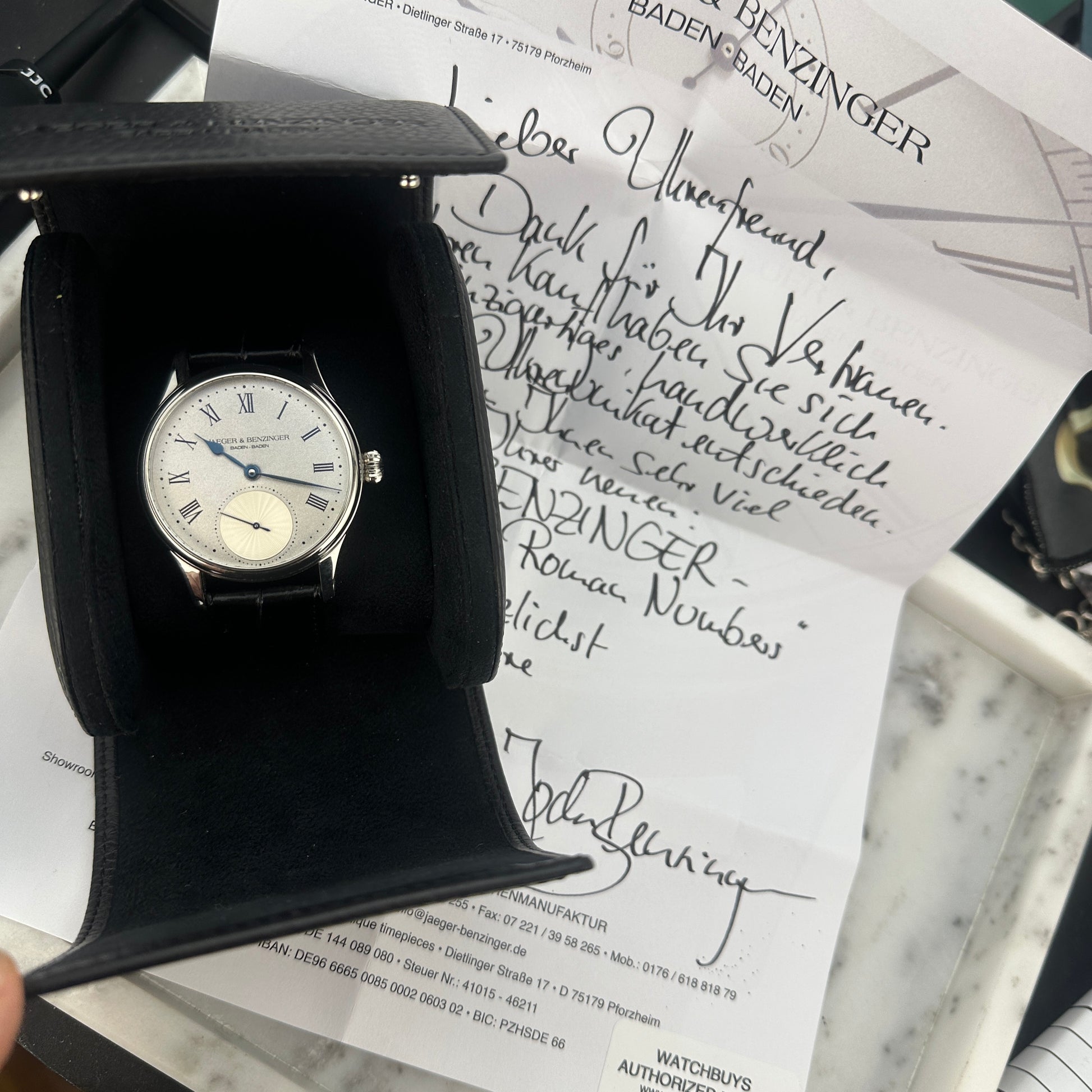 Condition: Very good condition overall with no significant marks. The titanium case shows minor wear consistent with age but retains its distinctive brushed finish. The matte silver dial has developed a subtle, even patina that adds character. The perforated leather strap shows normal use but remains supple and comfortable.