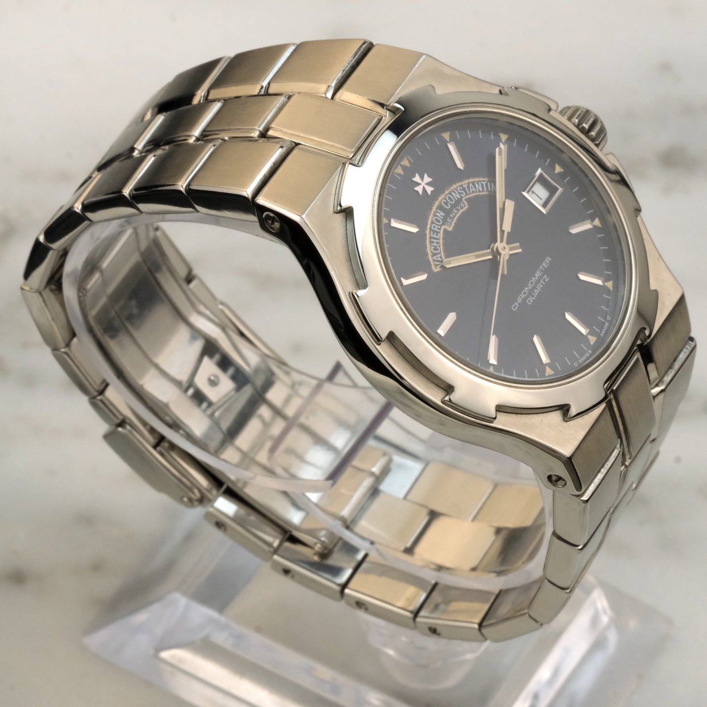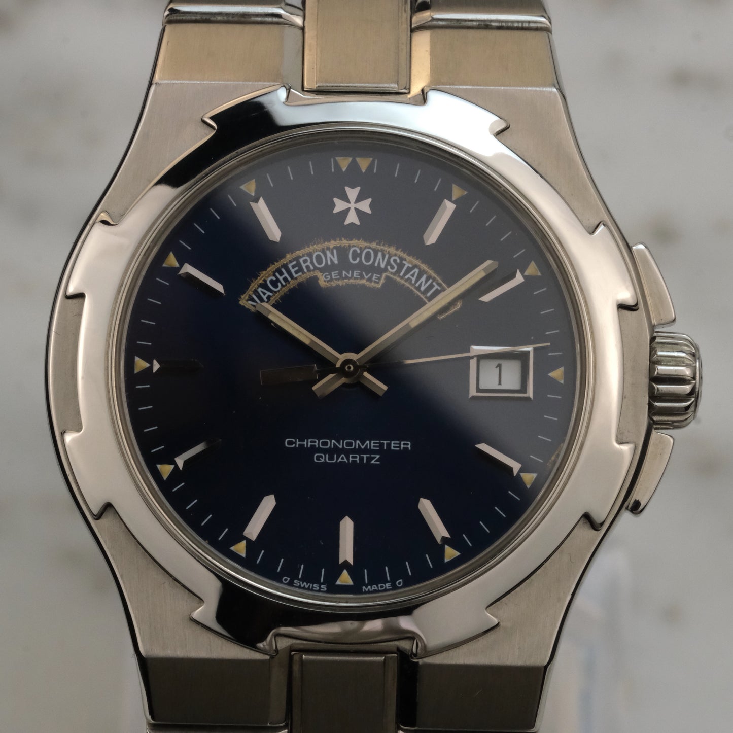 The deep blue dial features lumed hour markers, a date at 3 o’clock, and clean, elegant lines that highlight Vacheron's restrained aesthetic. The case construction is sharp and architectural, with a notched bezel and integrated stainless steel bracelet tapering neatly around the wrist.