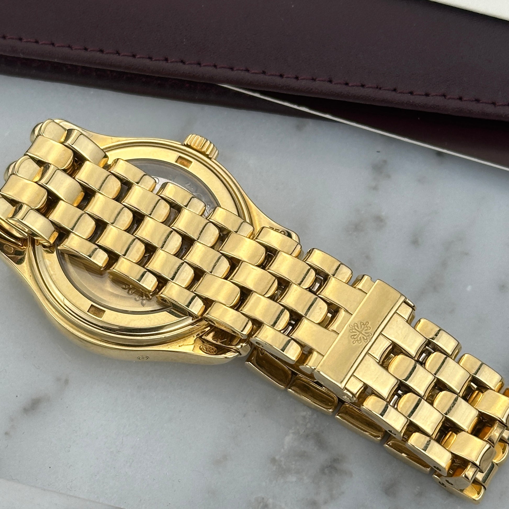 Includes: Full set: original Patek Philippe box (inner lining peeling), certificate of origin, papers, and booklets. Fits up to a 7.25" wrist.