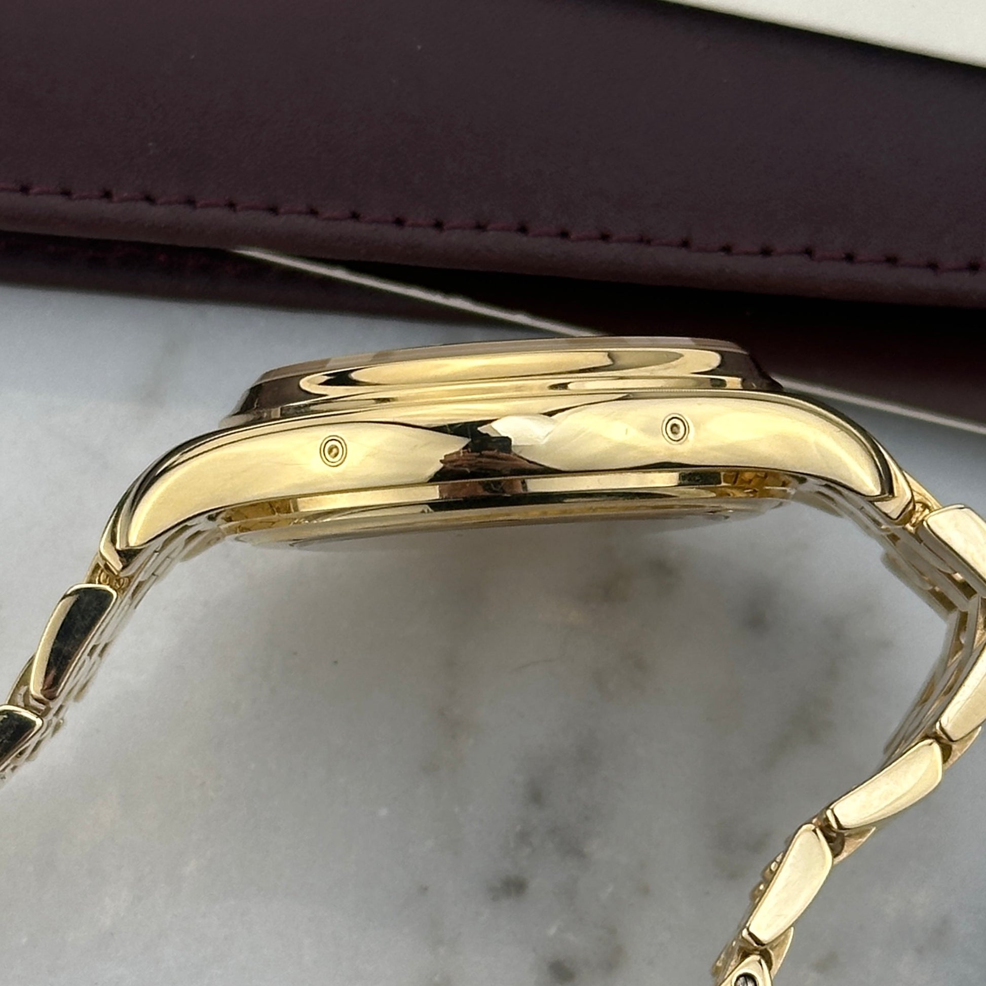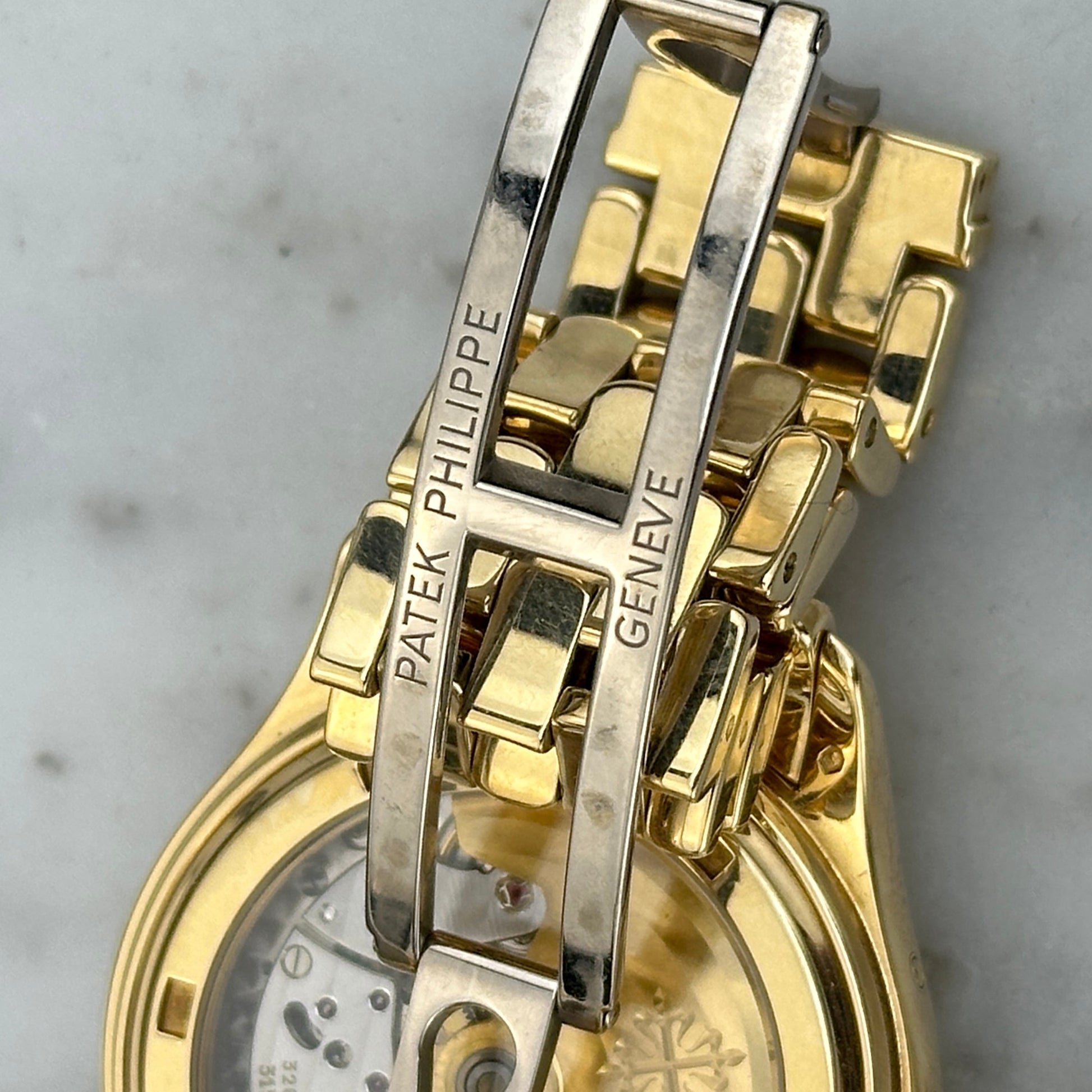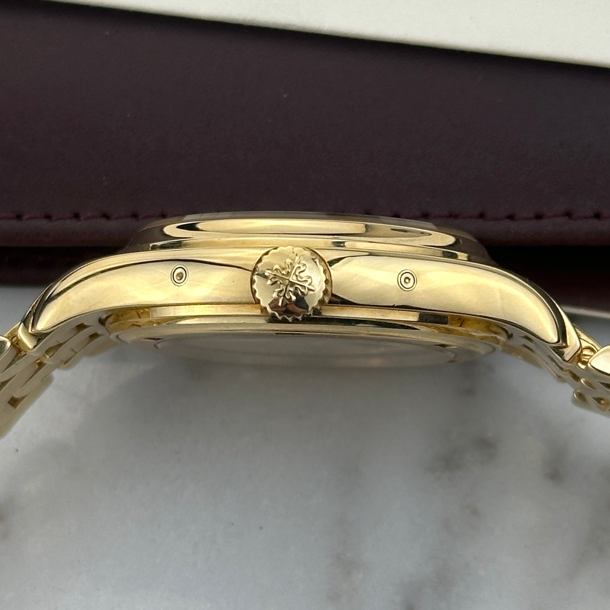 Crafted in 18k yellow gold, the watch features Patek’s signature fluted lugs, a concave bezel, and a silver opaline dial with applied gold Roman numerals. The calendar indications — day, date, and month — are arranged in three apertures across the upper half of the dial, while the moonphase and power reserve sit symmetrically below. The dauphine hands and railway minute track complete a look that’s understated, elegant, and quintessentially Patek.