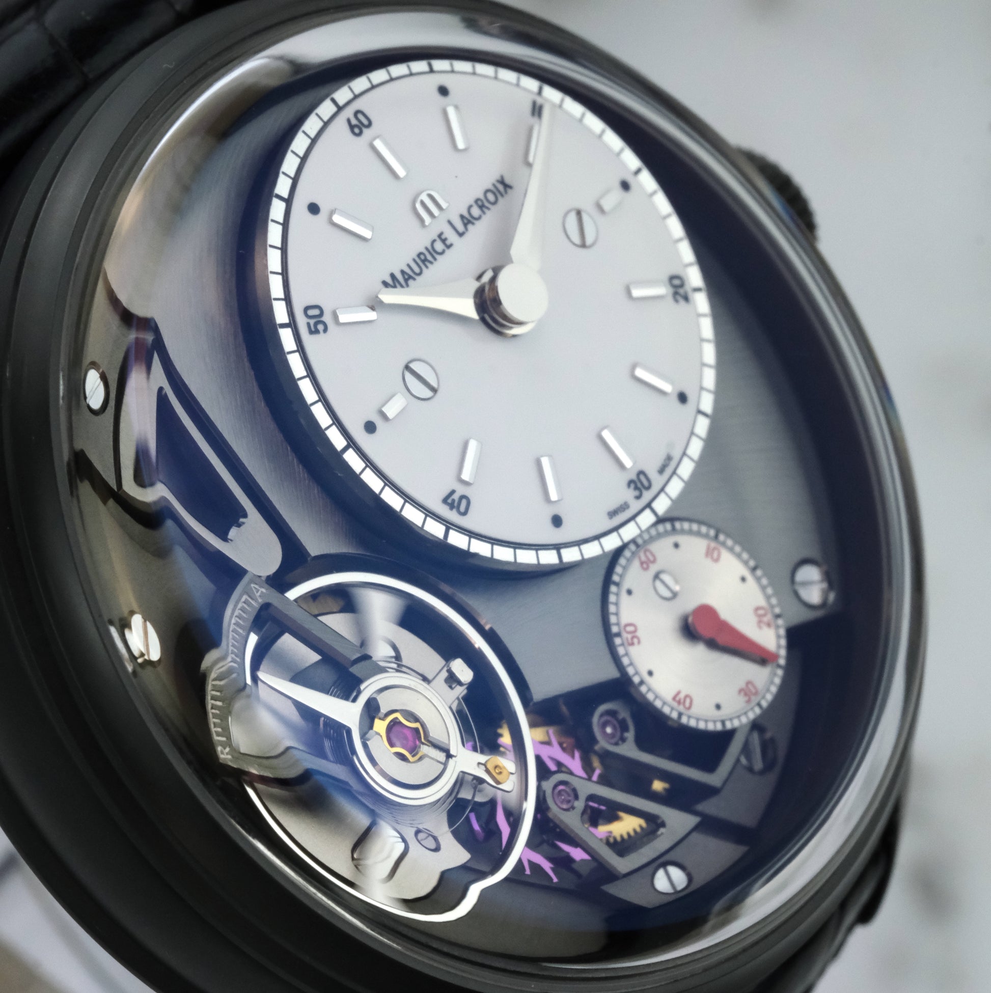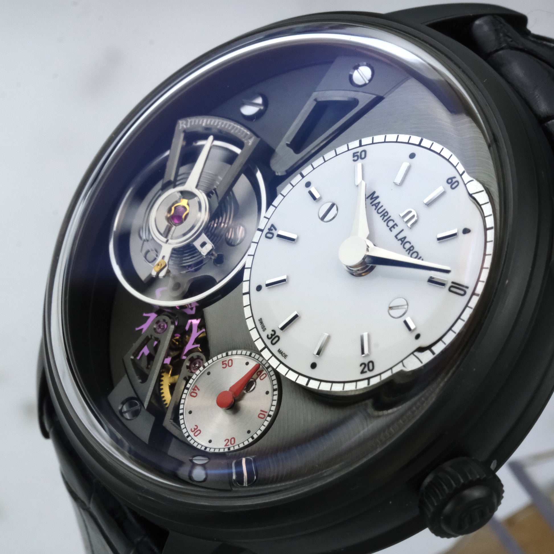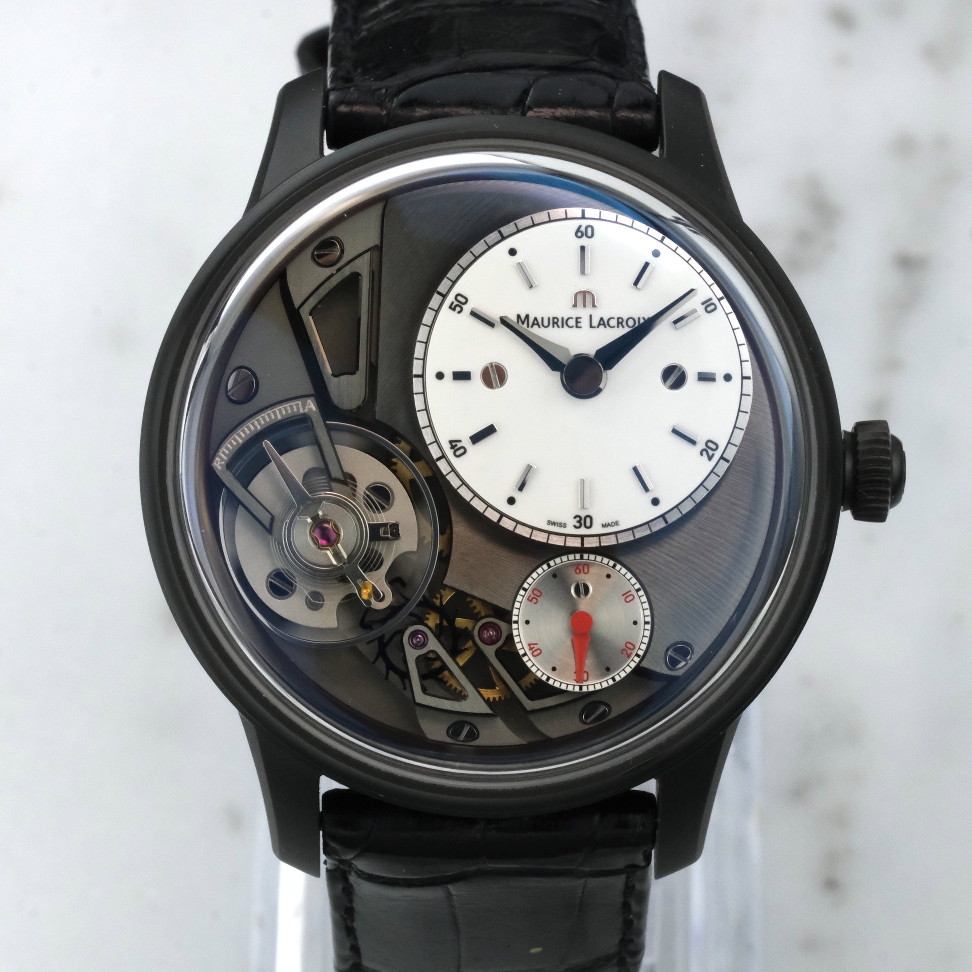The Watch: Anybody want a cheap Gruebel Forsey? The Maurice Lacroix Masterpiece Gravity stands as one of the brand’s most innovative creations, blending traditional horology with a bold, modern aesthetic. Launched in 2014, it was among the first timepieces to feature a fully exposed silicon assortment—lever, escape wheel, and balance spring—visible on the dial side. No surprise that Patrick Graells, product lead at Maurice Lacroix during development of this line, ended up at Gruebel Forsey.