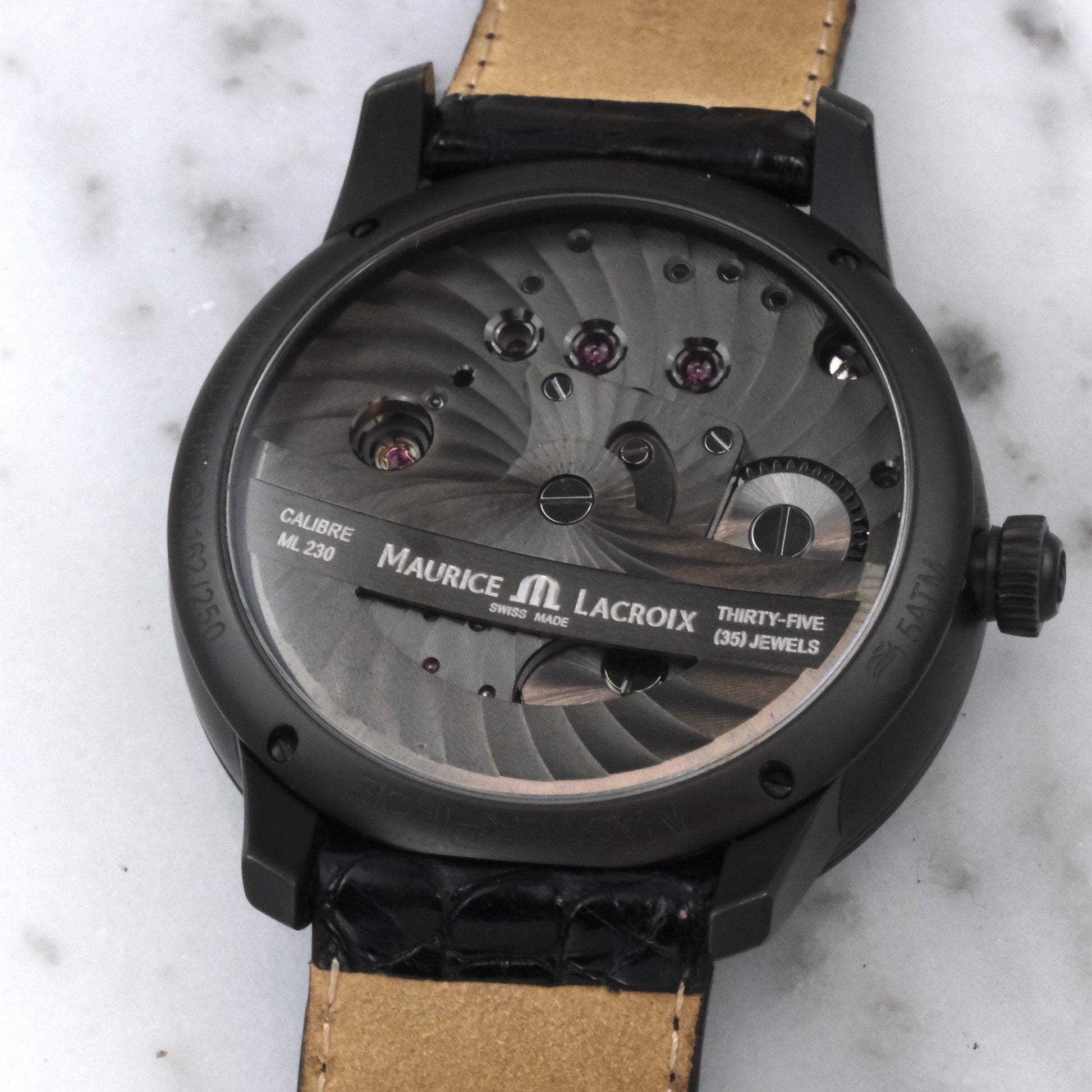 Inside beats the in-house Caliber ML230, an automatic movement with a 50-hour power reserve and silicon components that improve precision and reduce wear. The sapphire caseback reveals additional finishing details, including perlage and côtes de Genève.