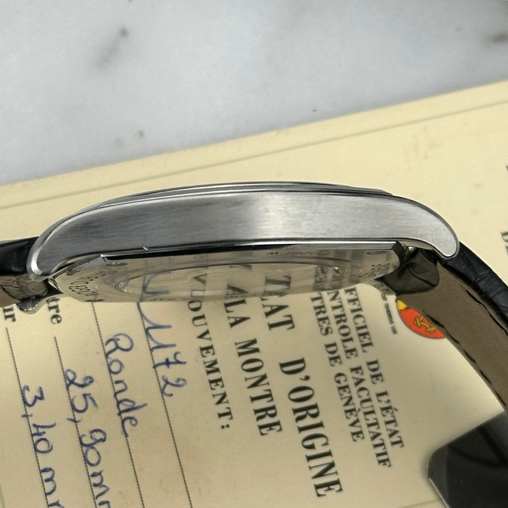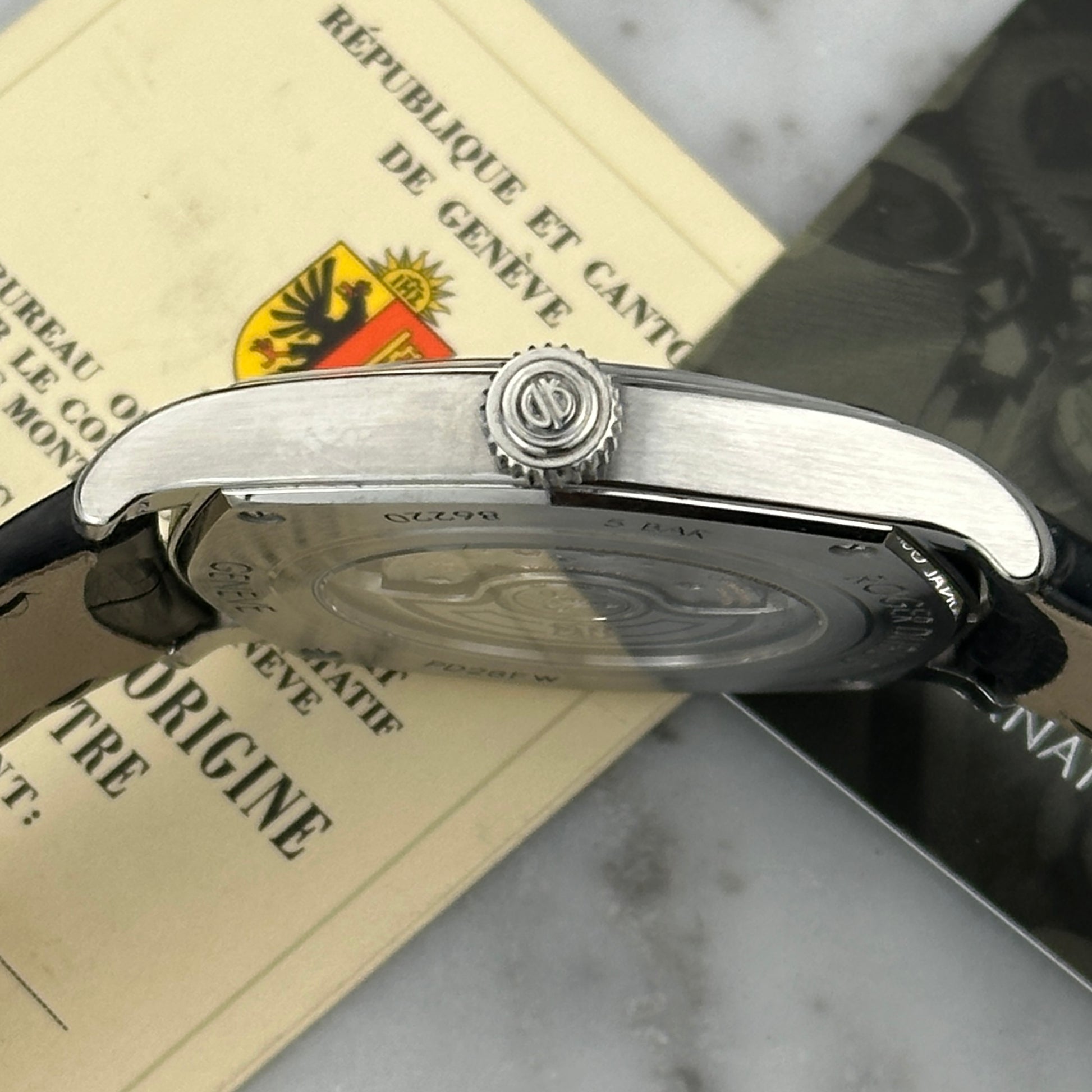 Powering this masterpiece is movement RD821, self-winding manufacture movement with frequency 28,800 vph (4Hz), 168 parts, 3.43mm thickness, Geneva Seal, 33 jewels, and 48 hours power reserve. The Poinçon de Genève (or Geneva Seal) is awarded to just a fraction of watches produced in Switzerland each year—according to Robert Dubuis, only 24,000 of over 20 million.