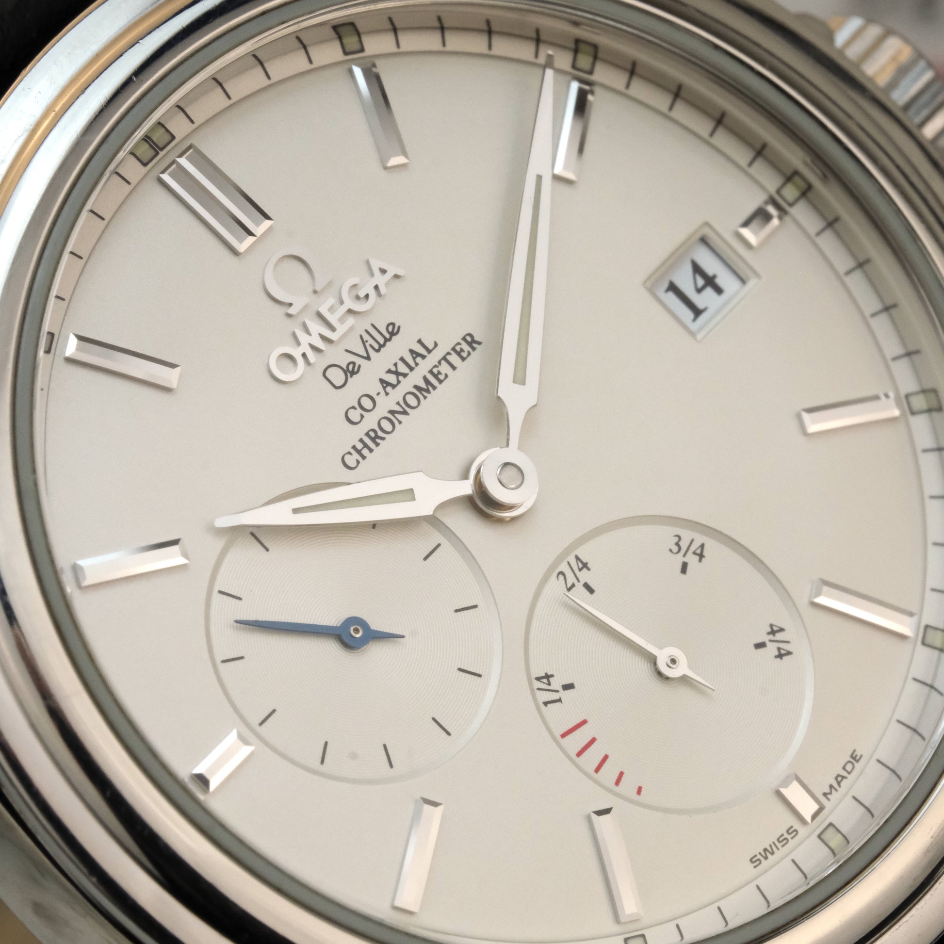 The Watch: Before the Aqua Terra took center stage, the De Ville line was OMEGA’s canvas for its most refined coaxial movements. This reference, 4832.31.32, features a 39mm stainless steel case and silver dial, framed by applied baton indices and a pair of engraved subdials—small seconds at 9, power reserve at 6.