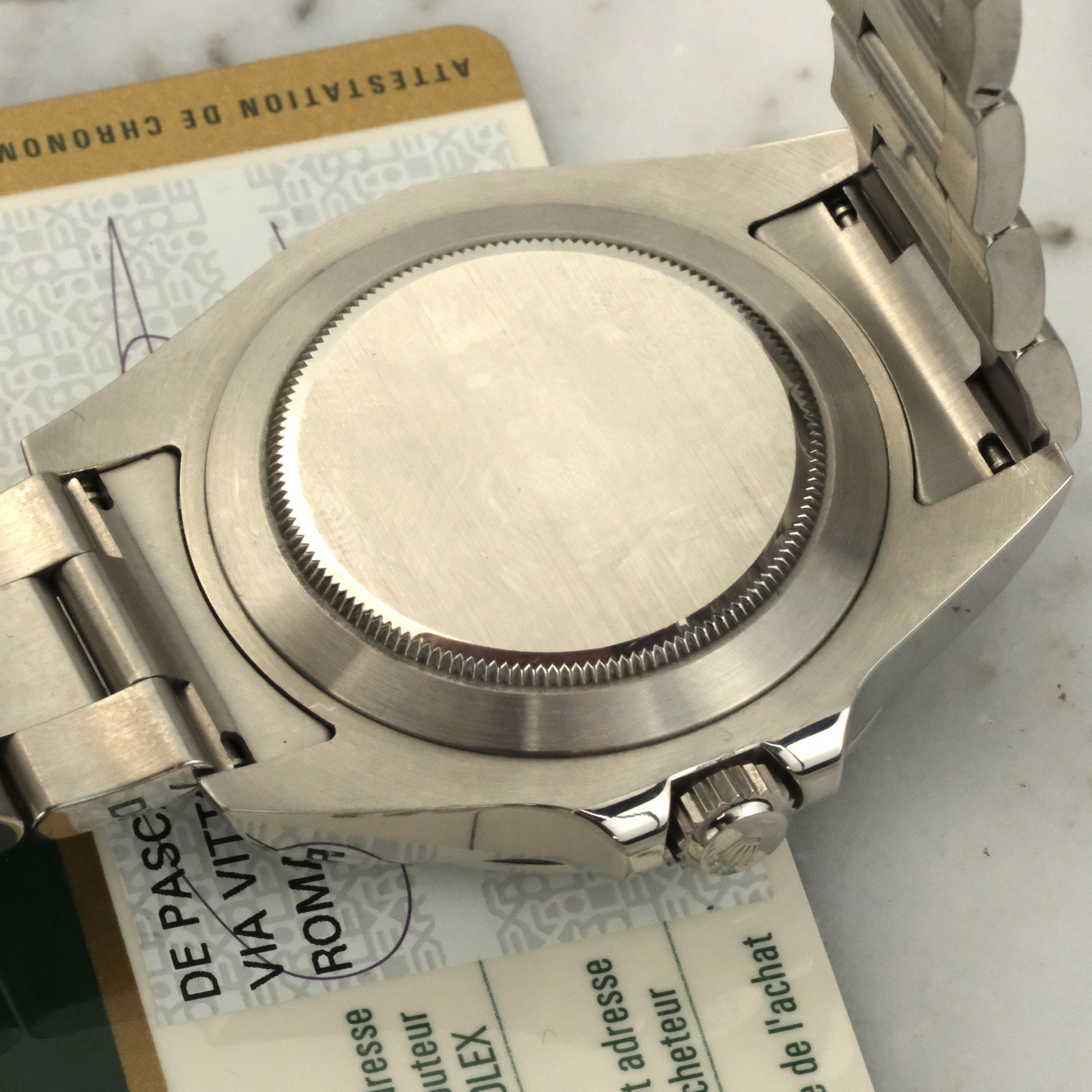 This example features the glossy black dial with applied Chromalight markers and the iconic oversized orange 24-hour hand, a nod to the original 1971 Explorer II “Freccione.” Powered by the Rolex Caliber 3187, it offers COSC-certified precision, Paraflex shock absorbers, and a 48-hour power reserve.