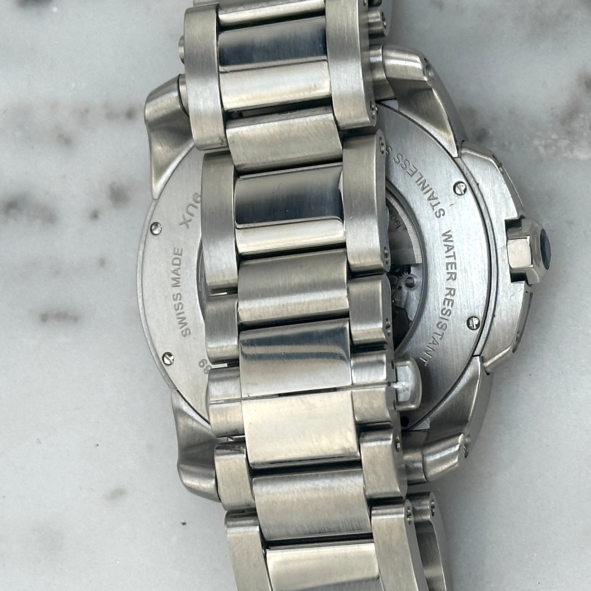 The Watch: The Calibre de Cartier Ref. W7100015 was Cartier’s bold entry into the modern sports-luxury category. With a 42mm stainless steel case, muscular lugs, and signature Roman numerals around a white dial, it balances Cartier’s historic design DNA with contemporary presence. The in-house Cartier 1904-PS automatic movement provides central seconds, a date window, and robust daily reliability.