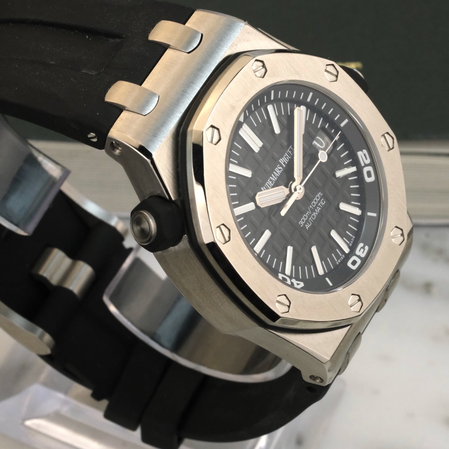 The Watch: The 15710ST represents the evolution of the Offshore Diver, keeping the clean lines and ISO-rated 300m water resistance of the original 15703, but adding a sapphire caseback and a refreshed dial layout with bolder lume plots and improved legibility.