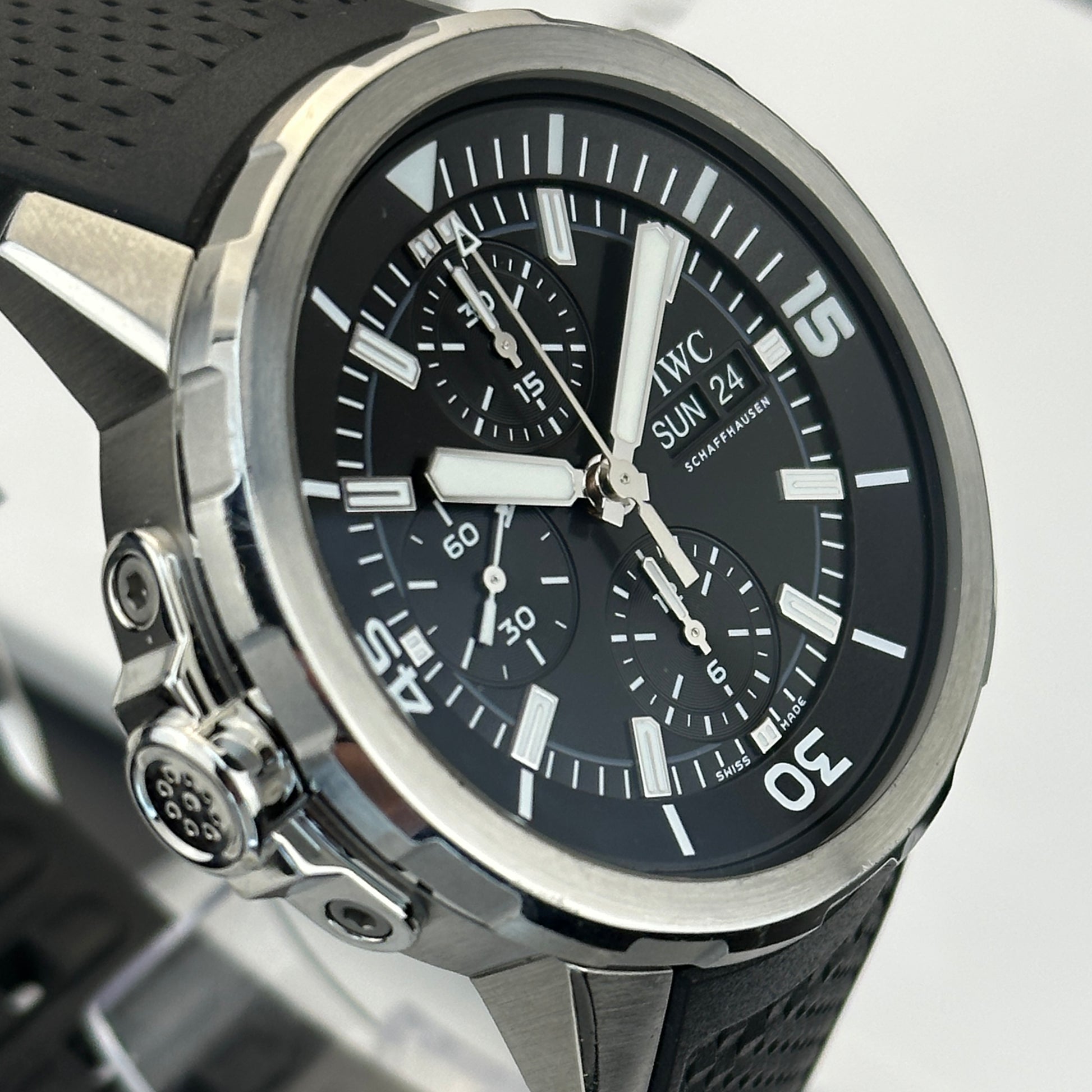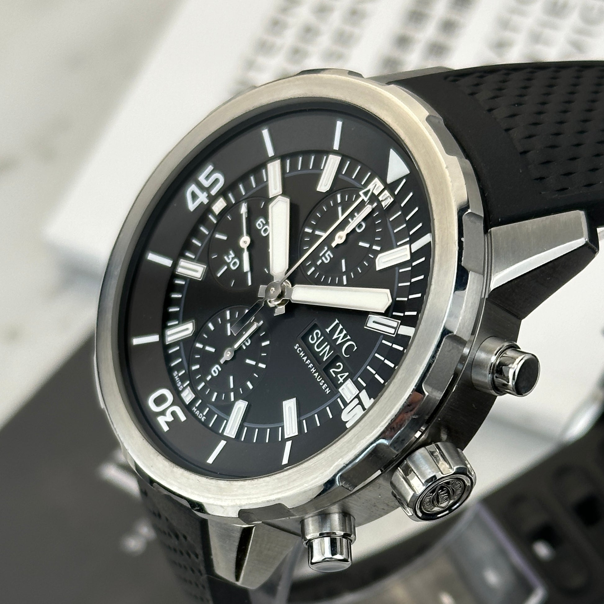 The Watch: The Jaeger-LeCoultre Aquatimer Chronograph Ref. IW376803 embodies the brand’s mastery of both mechanical precision and purposeful design. Released as part of JLC’s modern dive collection, this 44mm stainless steel chronograph offers 300 meters of water resistance and a distinctive internal/external rotating bezel system, allowing precise timing while maintaining full water integrity.