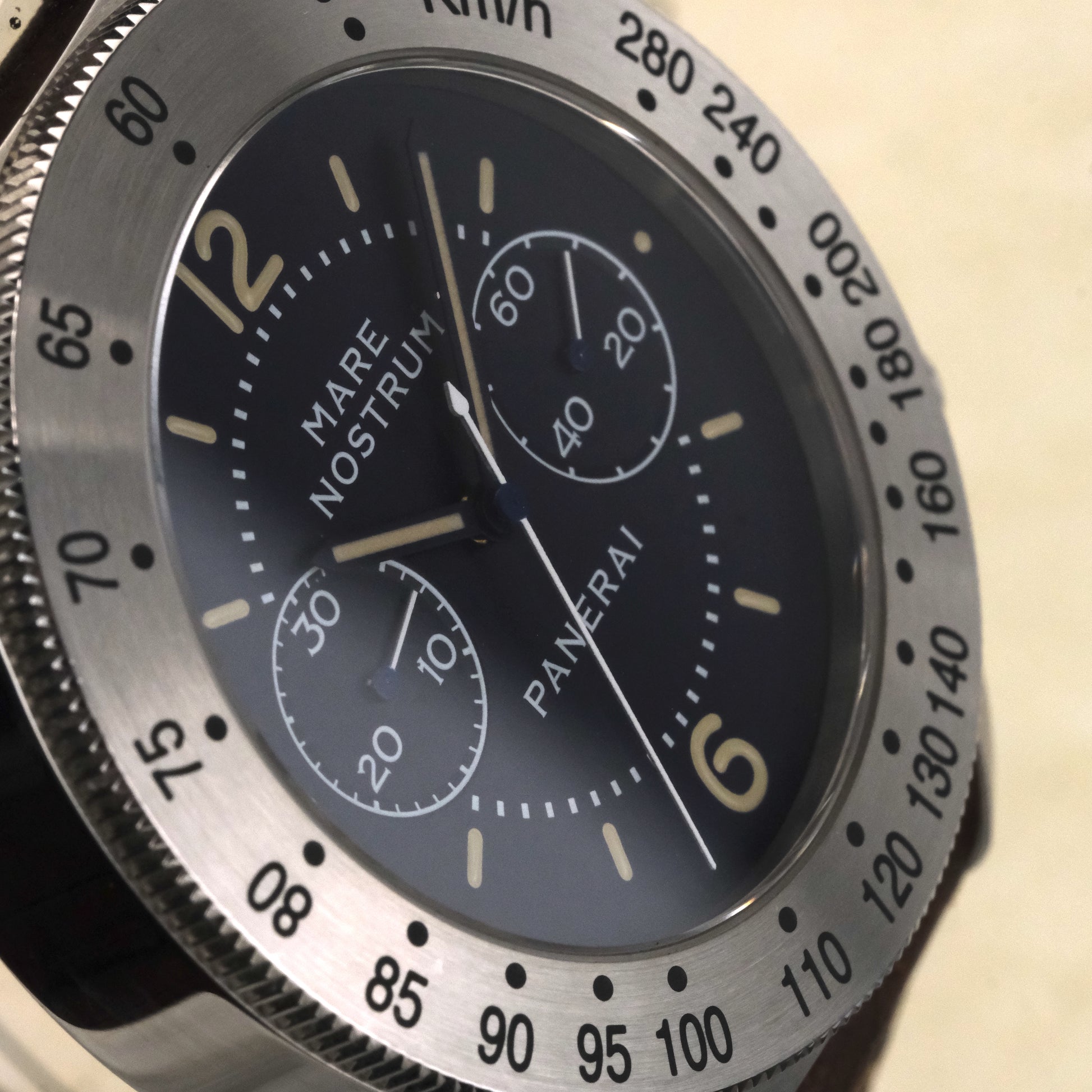 The Watch: The Panerai Mare Nostrum is one of the most historically significant models in Panerai’s archive. Originally conceived in 1943 as a chronograph for Italian naval officers, the design never reached mass production during the war. It remained a rare prototype until Panerai revived the concept in the 1990s as a modern homage to its maritime roots.