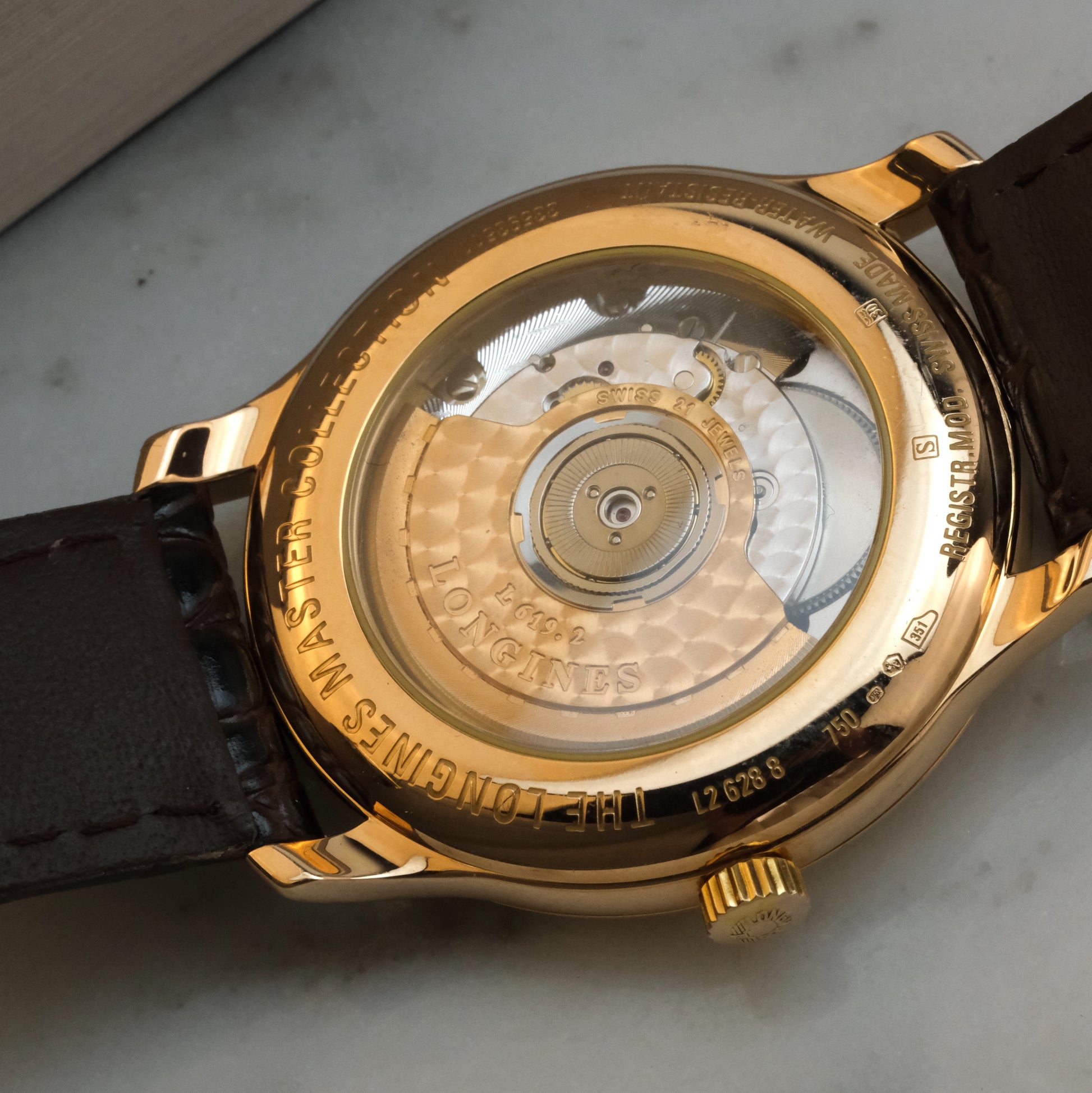 Powering the watch is the automatic Longines Caliber L619/888, based on the ETA 2892-A2. It features a 64-hour power reserve and is visible through the sapphire caseback.