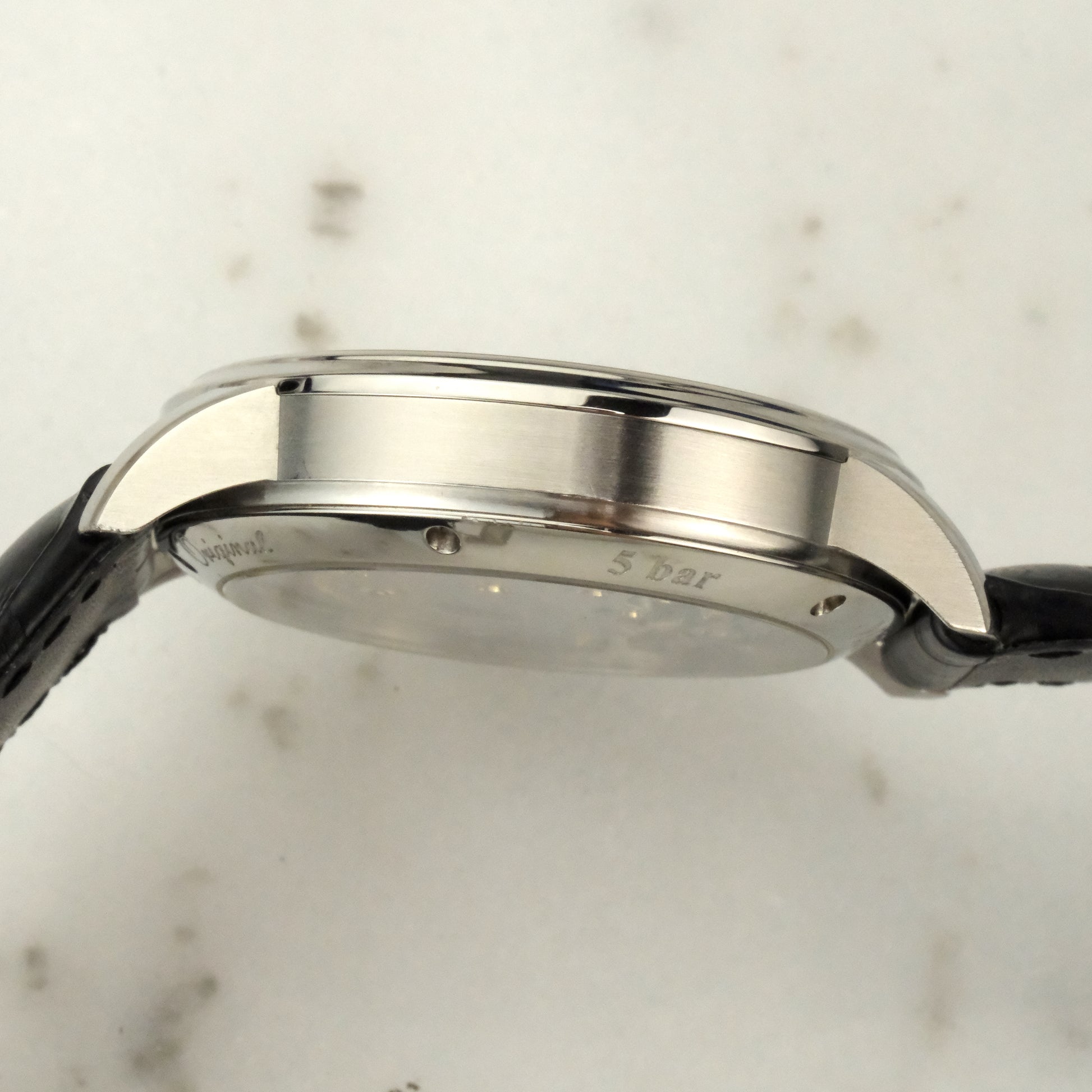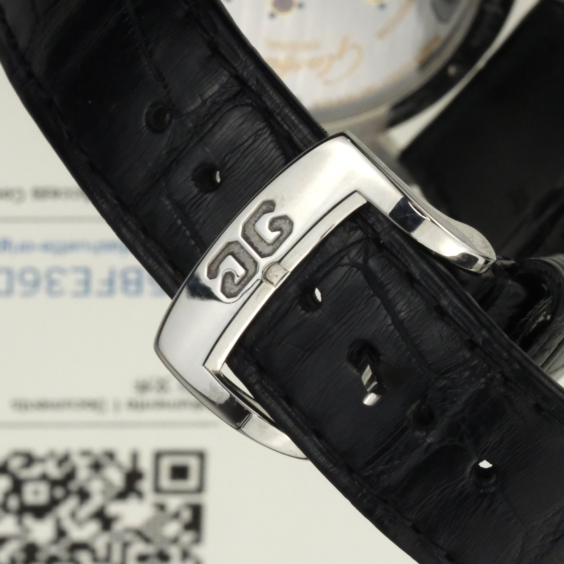 The Watch: This distinguished Glashütte Original PanoReserve exemplifies the Saxon manufacture's mastery of asymmetric dial design and mechanical innovation. The 40mm stainless steel case houses the hand-wound manufacture caliber 65-01, featuring an impressive 42-hour power reserve. The silver-grained dial showcases Glashütte Original's signature off-center layout with the iconic panorama date display at 4 o'clock and linear power reserve indicator arcing elegantly along the right side. Blued steel hands, applied Arabic numerals, and the subsidiary seconds at 7 o'clock create perfect visual balance. The sapphire case back reveals the exquisitely finished movement with Glashütte three-quarter plate, hand-engraved balance cock, and traditional Glashütte stripes. Fitted with a black leather strap and stainless steel buckle, this 2021 example represents German watchmaking at its finest.