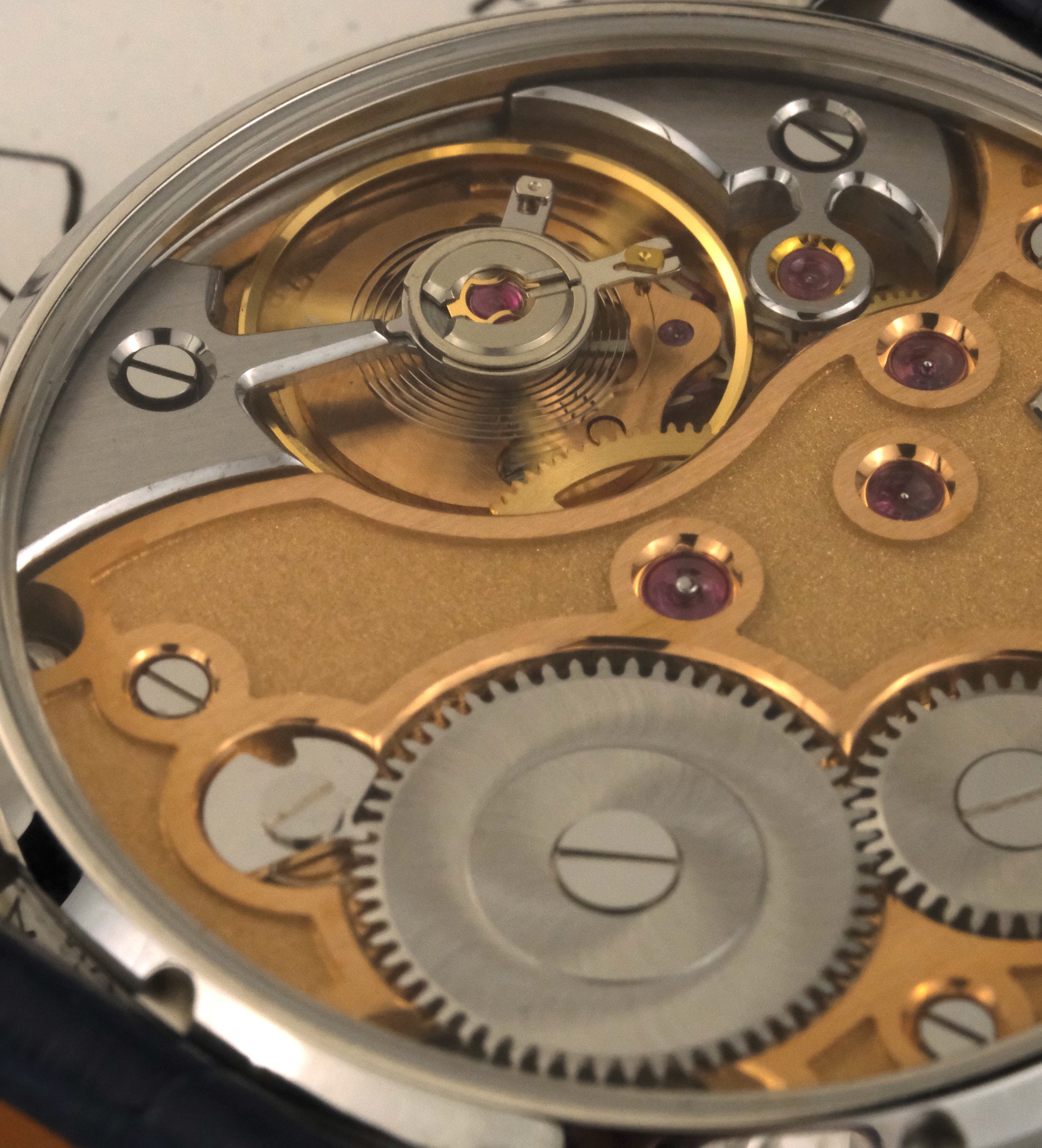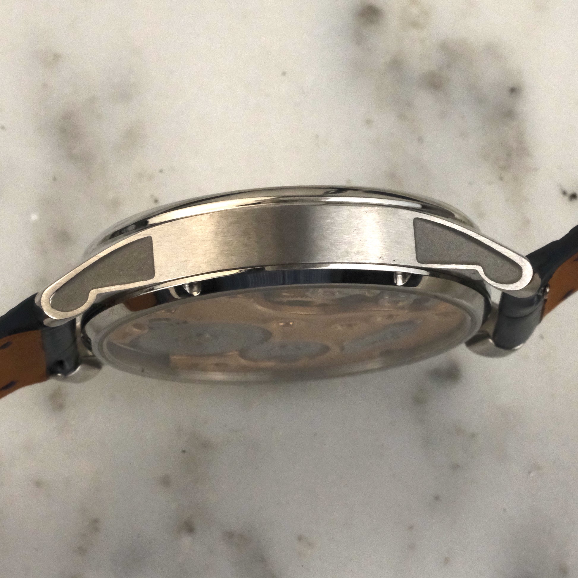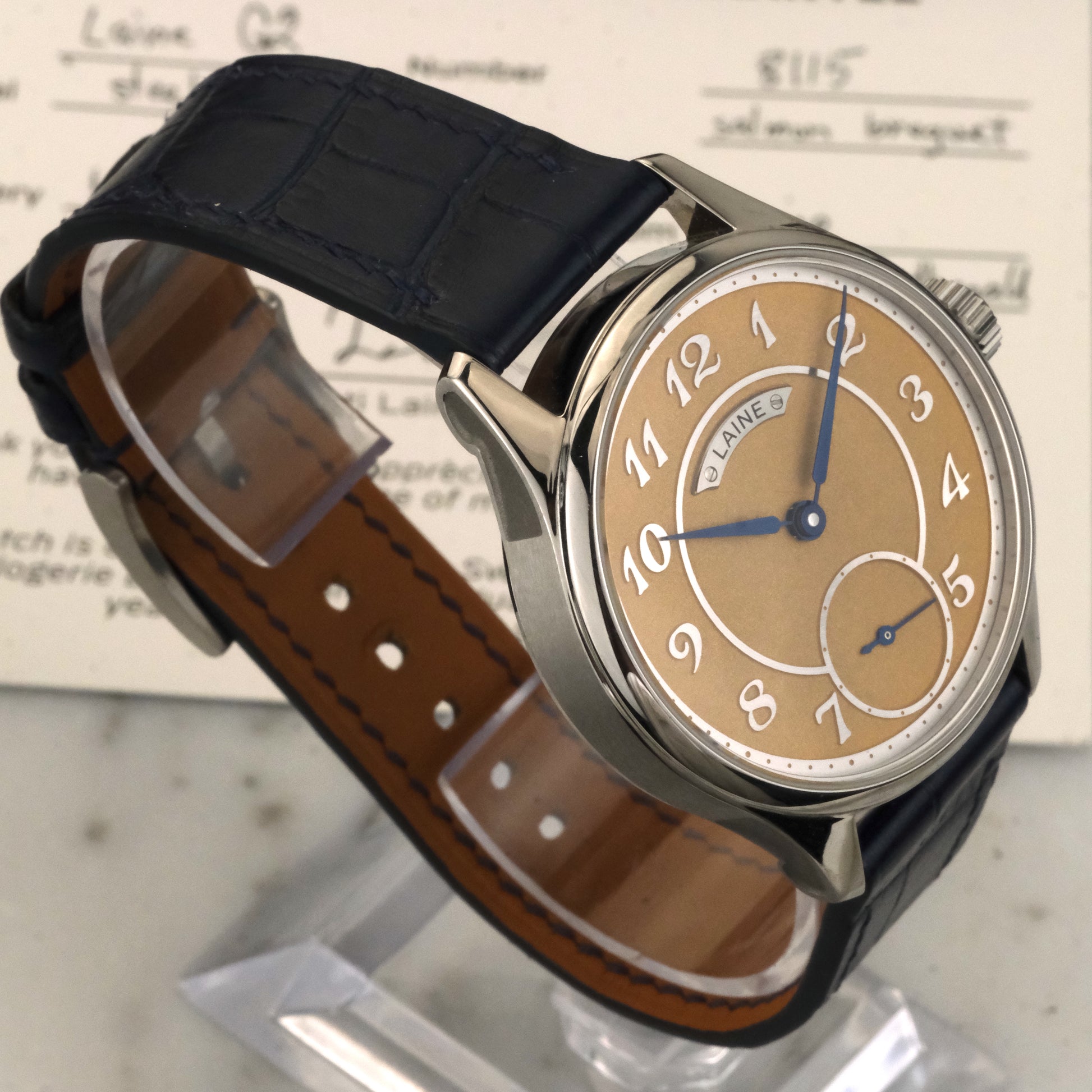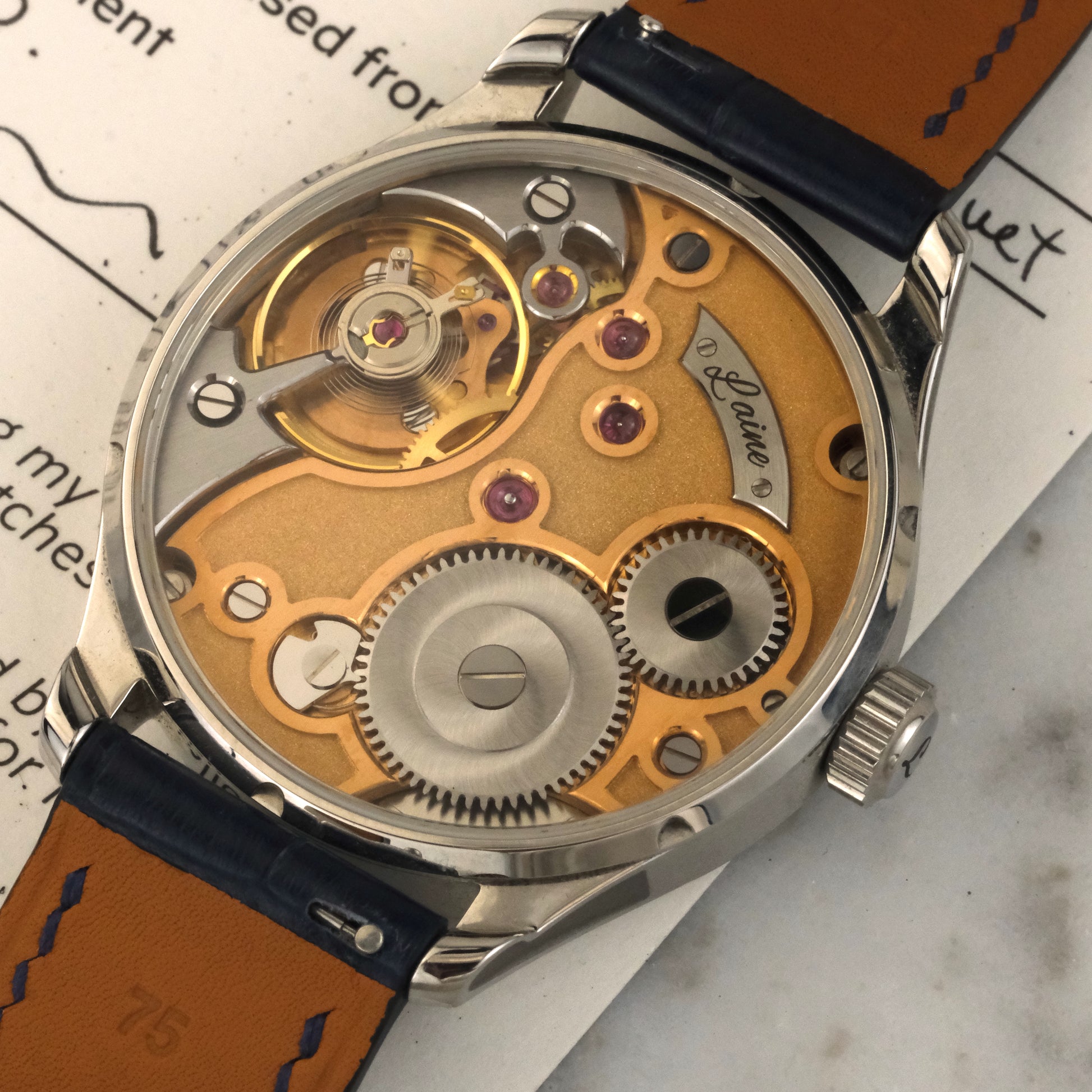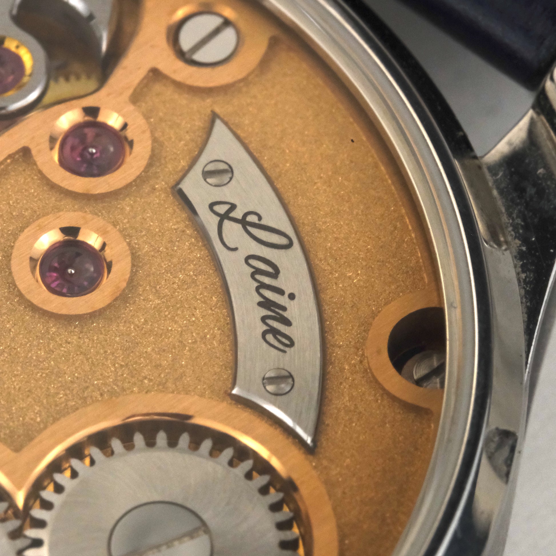 Inside is the Laine-modified ETA 6498 base movement, heavily reworked with frosted bridges, polished bevels, perlage, and hand-applied details. The movement is manually wound, reliable, and beautifully finished to the standards of haute horlogerie.