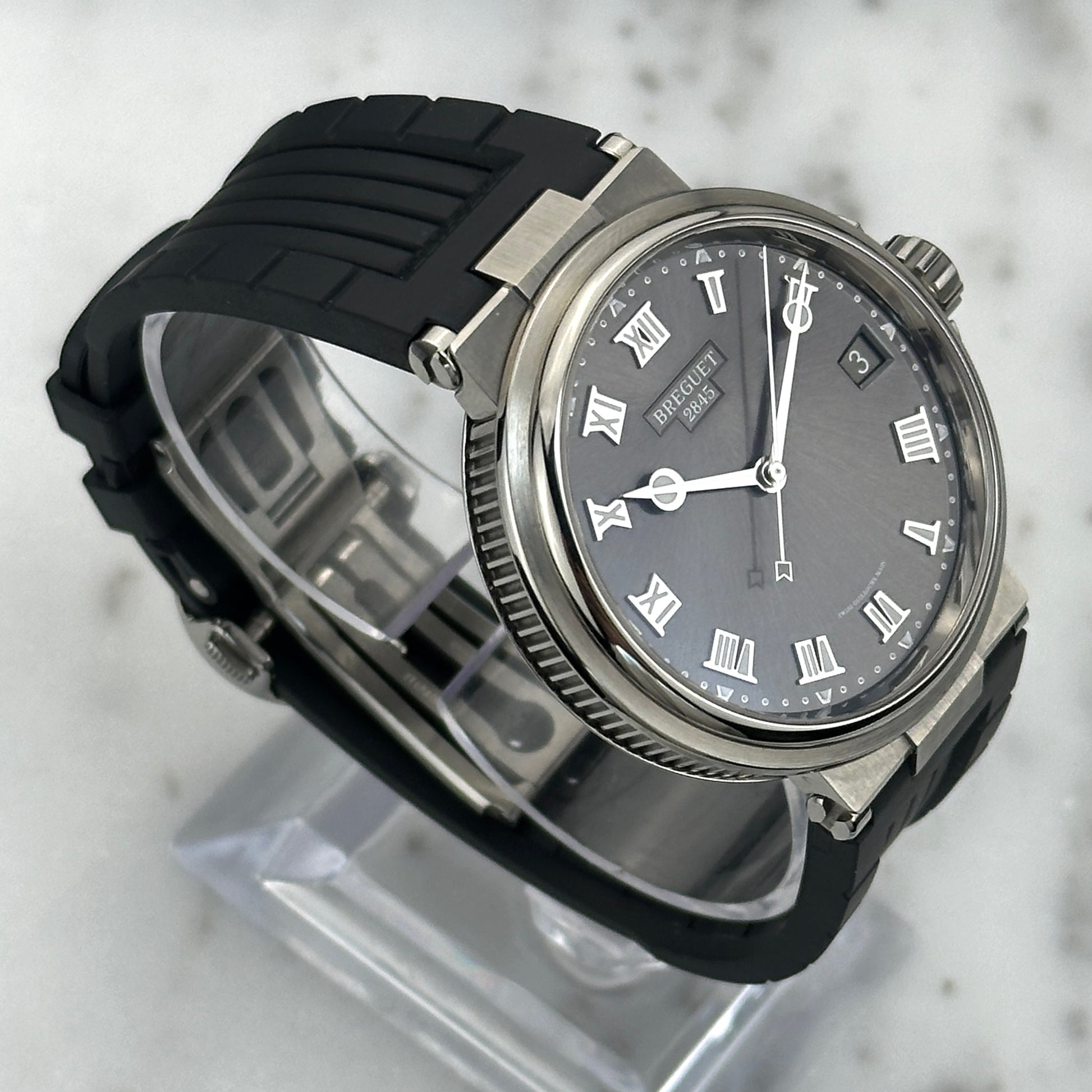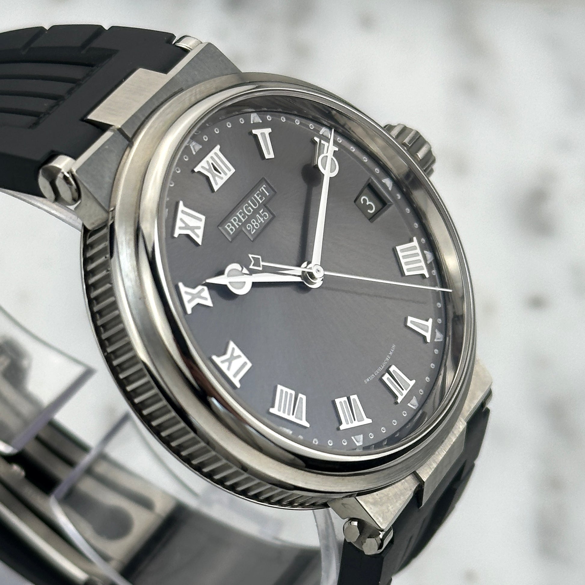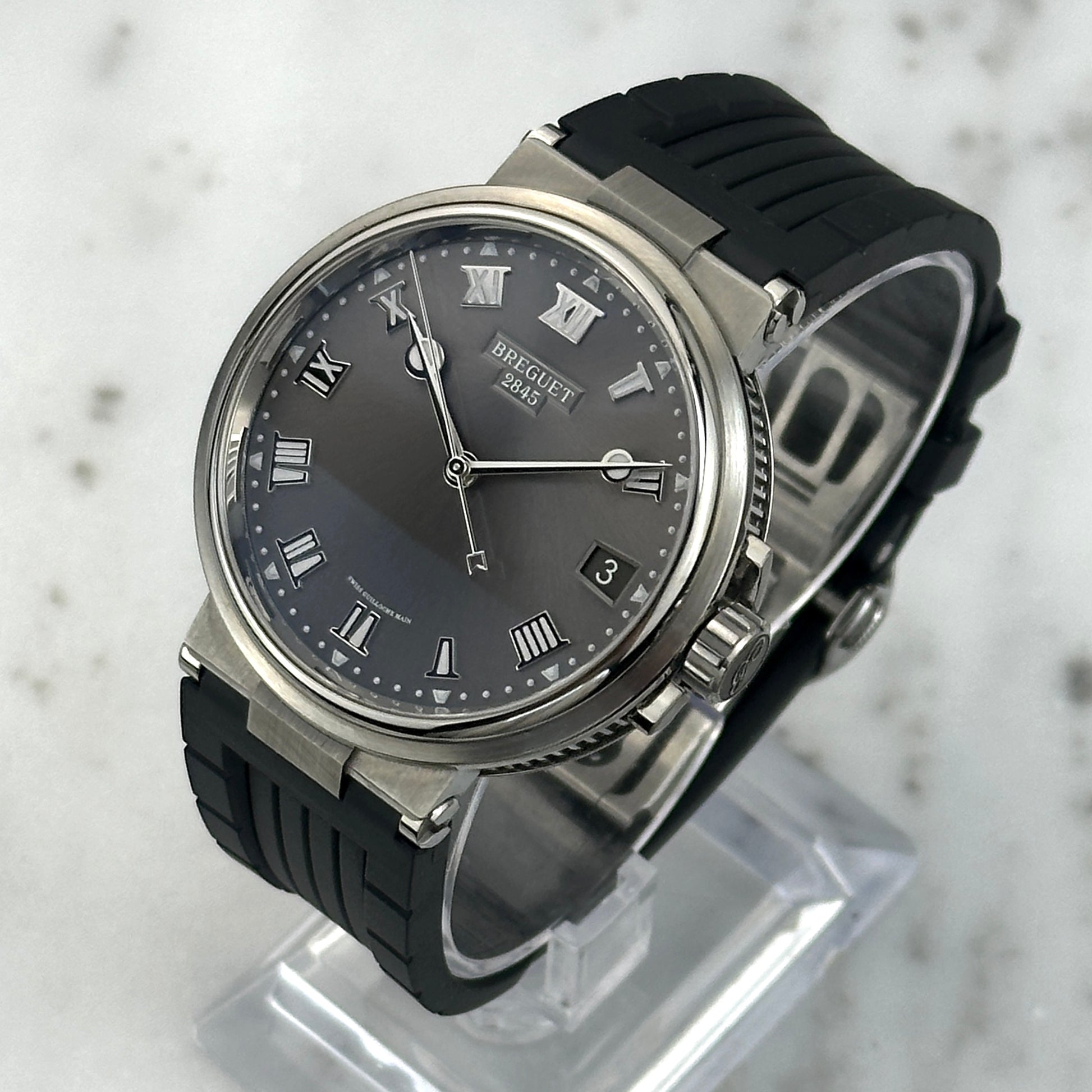 The Watch: The Breguet Marine 5517 in titanium is a contemporary reinterpretation of the maison’s centuries-old nautical legacy. Introduced as part of the revamped Marine collection, the 5517 pairs Breguet’s refined aesthetic language with modern materials and robust specifications. The 40mm titanium case paired with a Breguet rubber strap is lightweight yet durable, offering daily wear comfort. The dial is finished in slate grey sunburst, accented with applied Roman numerals, luminous hands, and a discreet date aperture at 3 o’clock.