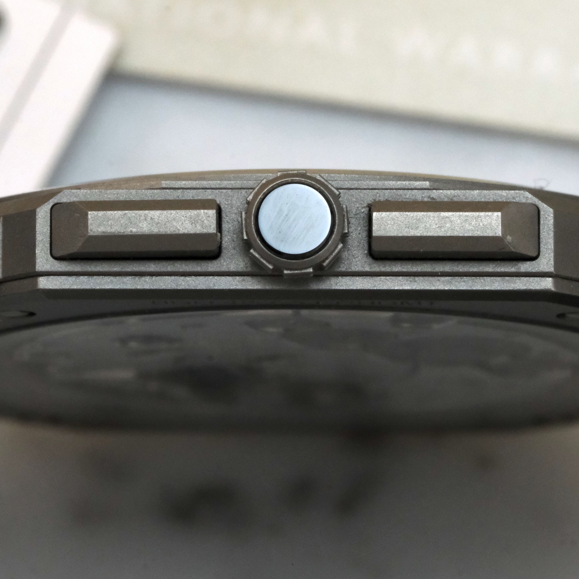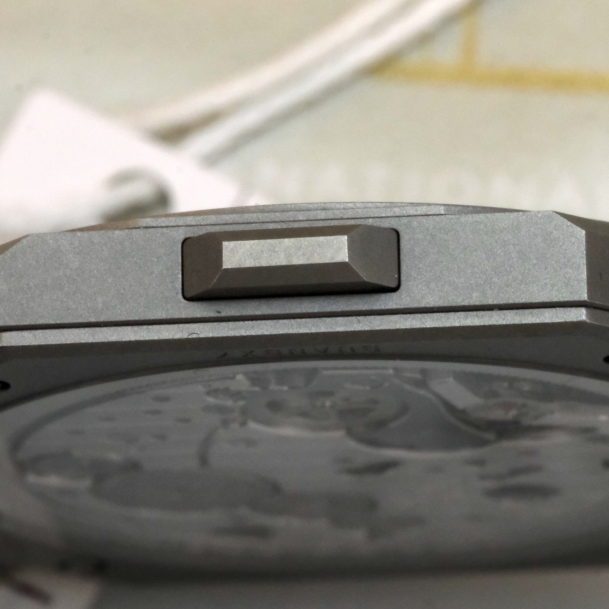 It’s fitted to a black fabric strap with a titanium pin buckle—lightweight, low profile, and suited to the architecture of the case.