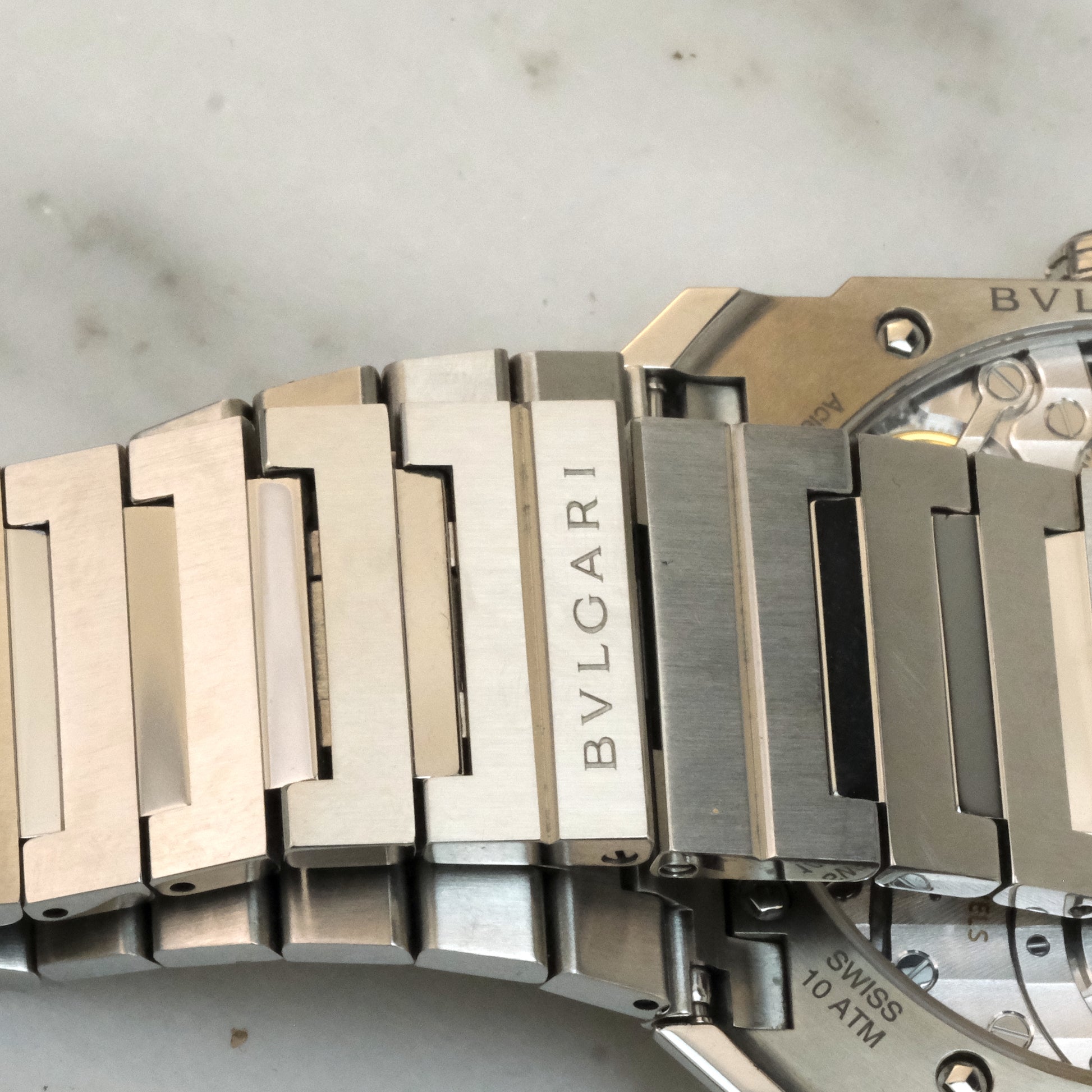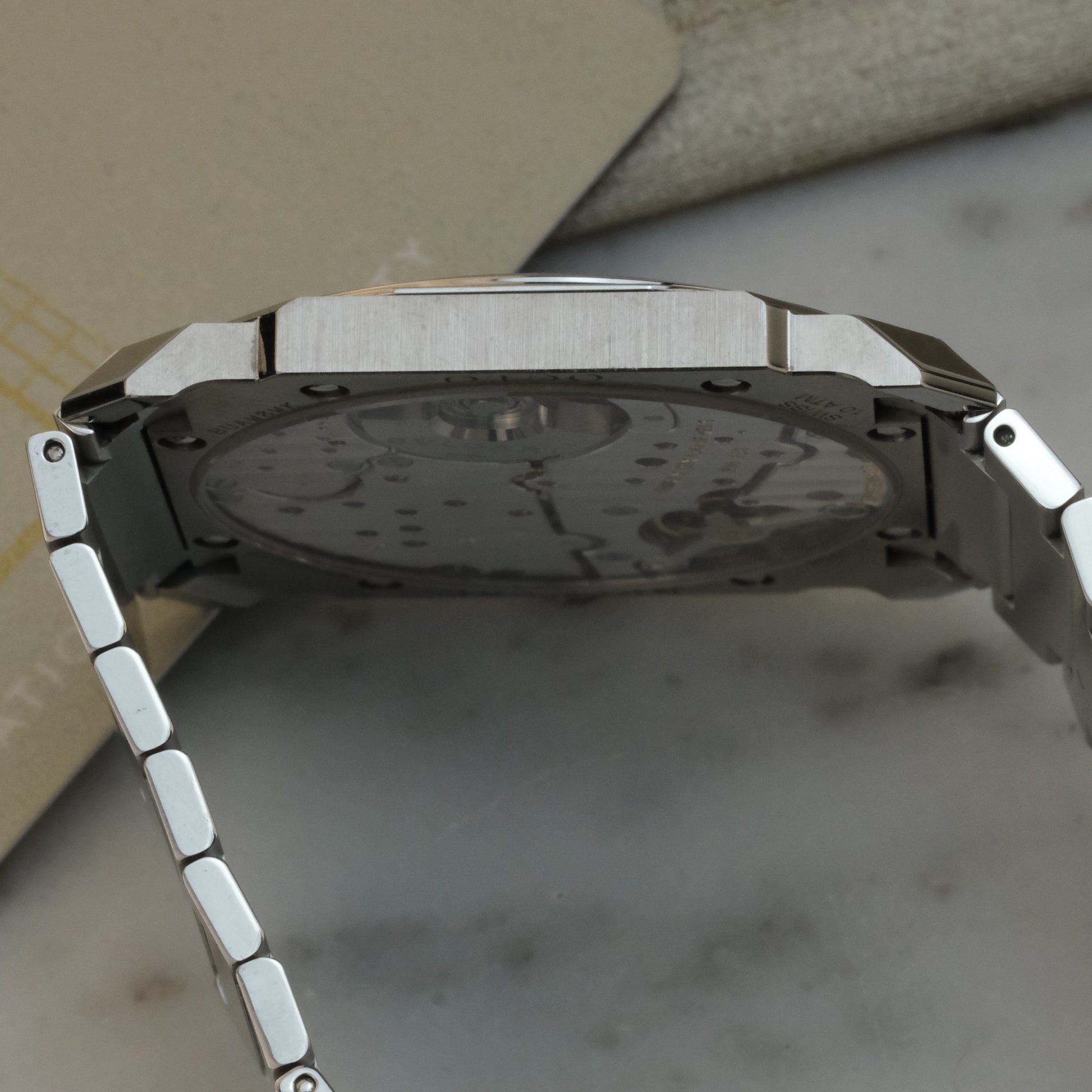 The Watch: The Octo Finissimo 103431 is what happens when modern watchmaking meets modern design. At just 6.4mm thick, the brushed stainless steel case is razor-thin, but its angular facets and architectural presence give it surprising wrist presence. The deep blue sunburst dial adds warmth and contrast to the otherwise monochrome steel build.