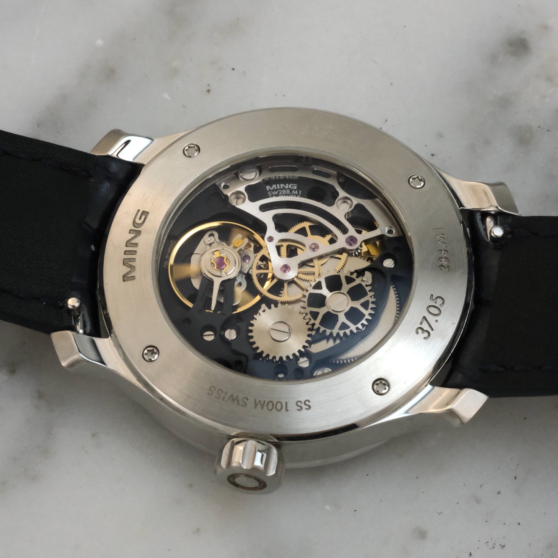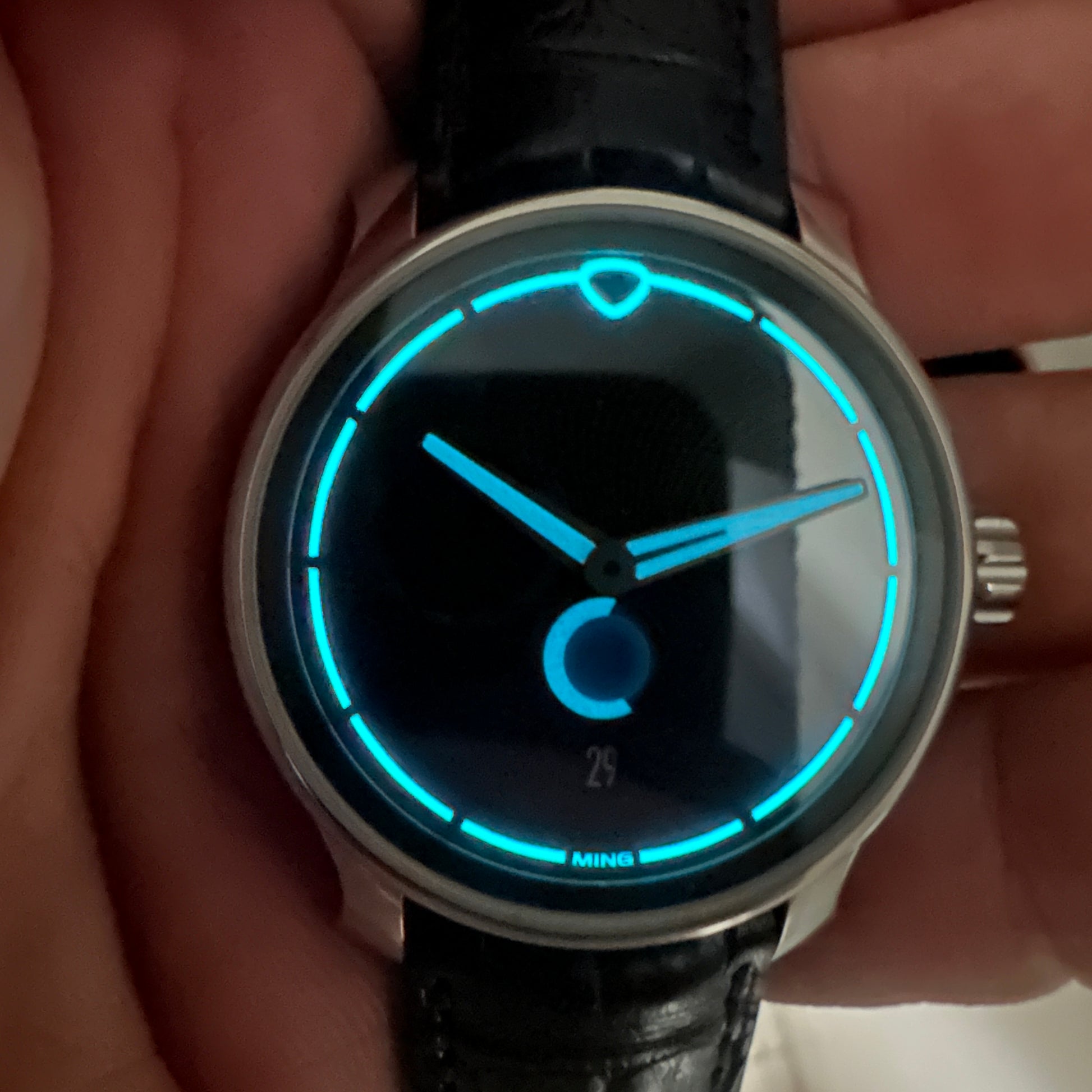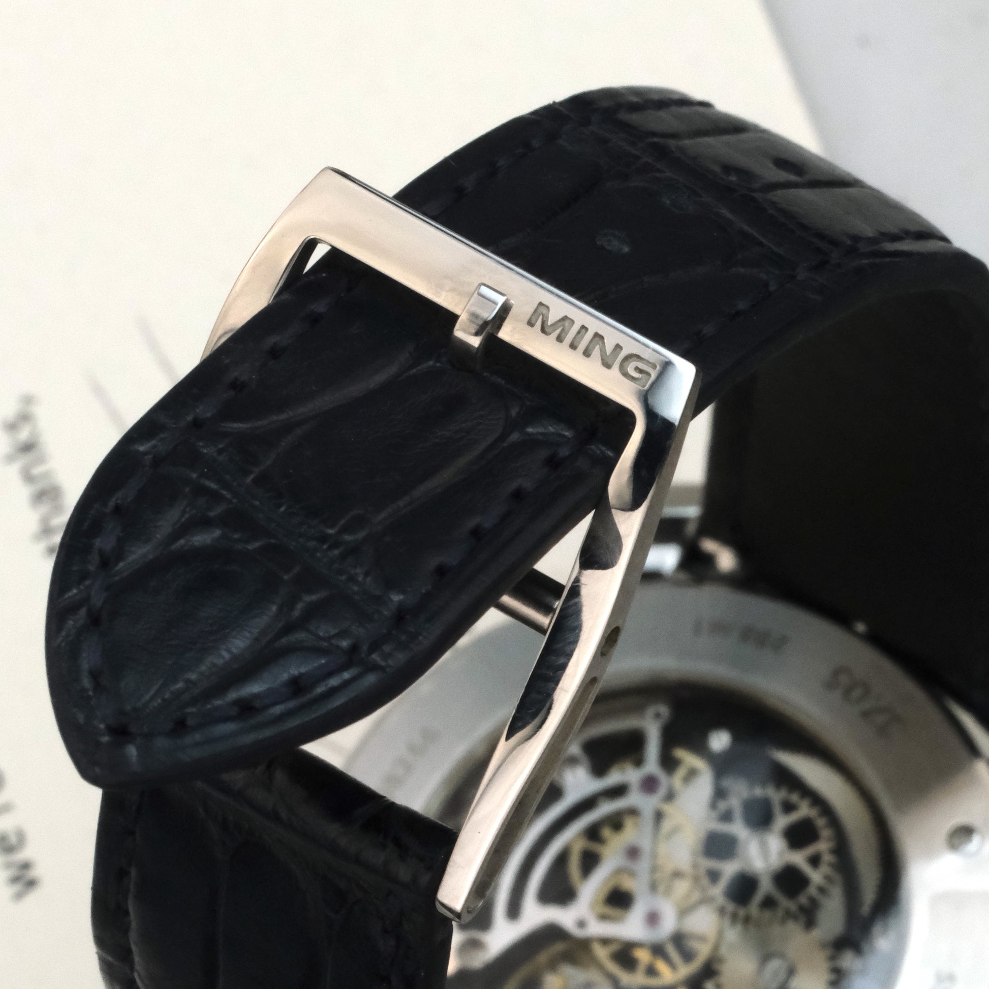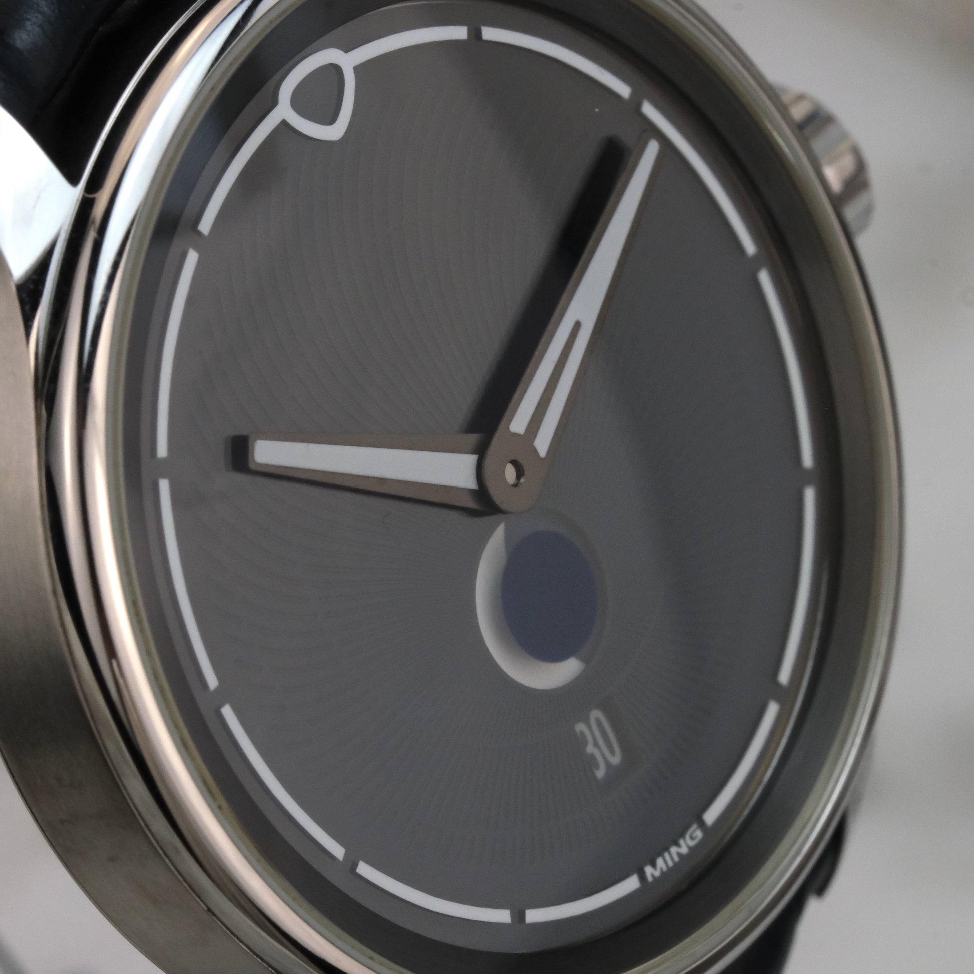 Inside is the Sellita SW288-1 automatic movement, modified by Schwarz-Etienne for Ming to include a moonphase complication and a 40-hour power reserve. The movement is visible through a sapphire caseback, finished with Ming’s typical contemporary detailing.