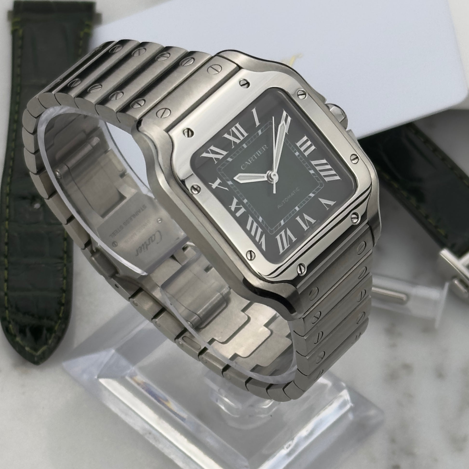 The Watch: Even with its illustrious history notwithstanding, the Santos de Cartier is an outstanding piece, and this is a beautiful new introduction to the line. The stainless steel timepiece cuts a striking figure with its deep green dial, lumed hands, vertically brushed case complemented by its polished bezel and chamfered edges. The watch is similar to the Santos Galbée XL, measuring 35x42. This mechanical watch is powered by the Cartier caliber 1847 MC, an automatic movement with 42 hours of autonomy 23 jewels, and a frequency of 28,800 vph - rock solid. The Santos De Cartier is a worthy rival to watches such as the Rolex Datejust, with incredible industrial design. Over a century later, the Santos feels relevant, sophisticated, and above all else, timeless.