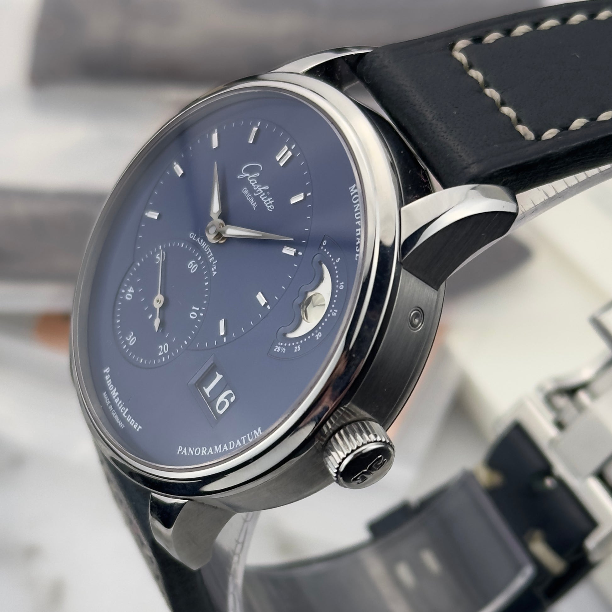 The blue dial on this reference is galvanic, with applied silver indices and white gold hands. The auxiliary dials for the time display and small seconds feature a vinyl-type decorative pattern that creates subtle reflections as the light shifts. The panorama date uses white numerals on a dark blue ground for strong contrast, and the moon phase disc is crafted in-house: the moons are milled and then polished with a diamond-tipped tool for a domed, high-brilliance finish, set against a deep blue galvanized night sky. Each dial goes through roughly 40 separate work steps at Glashütte Original's own dial manufacture in Pforzheim.