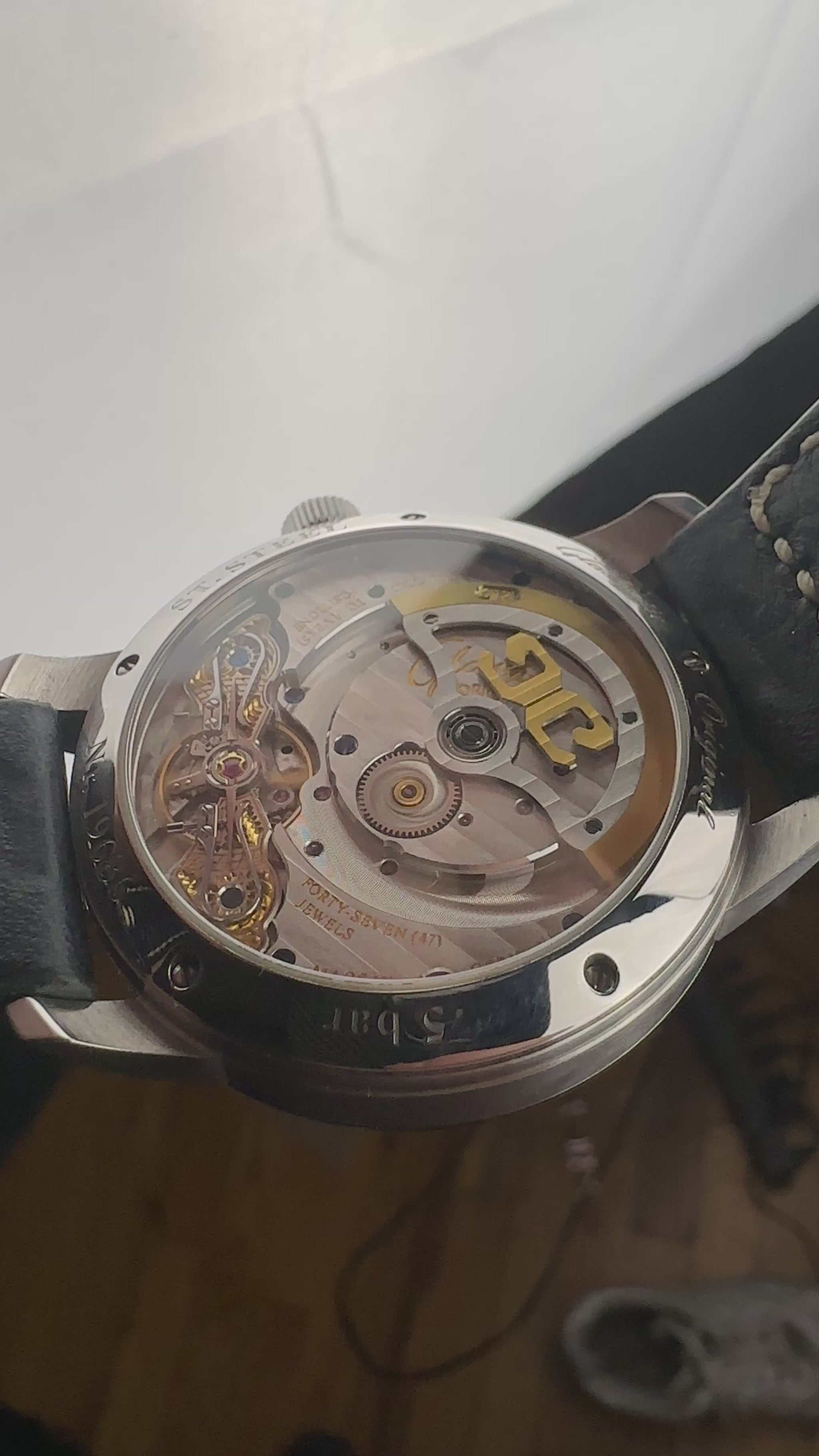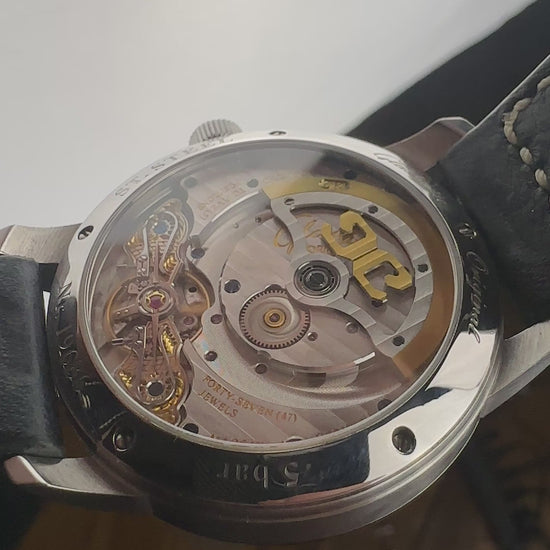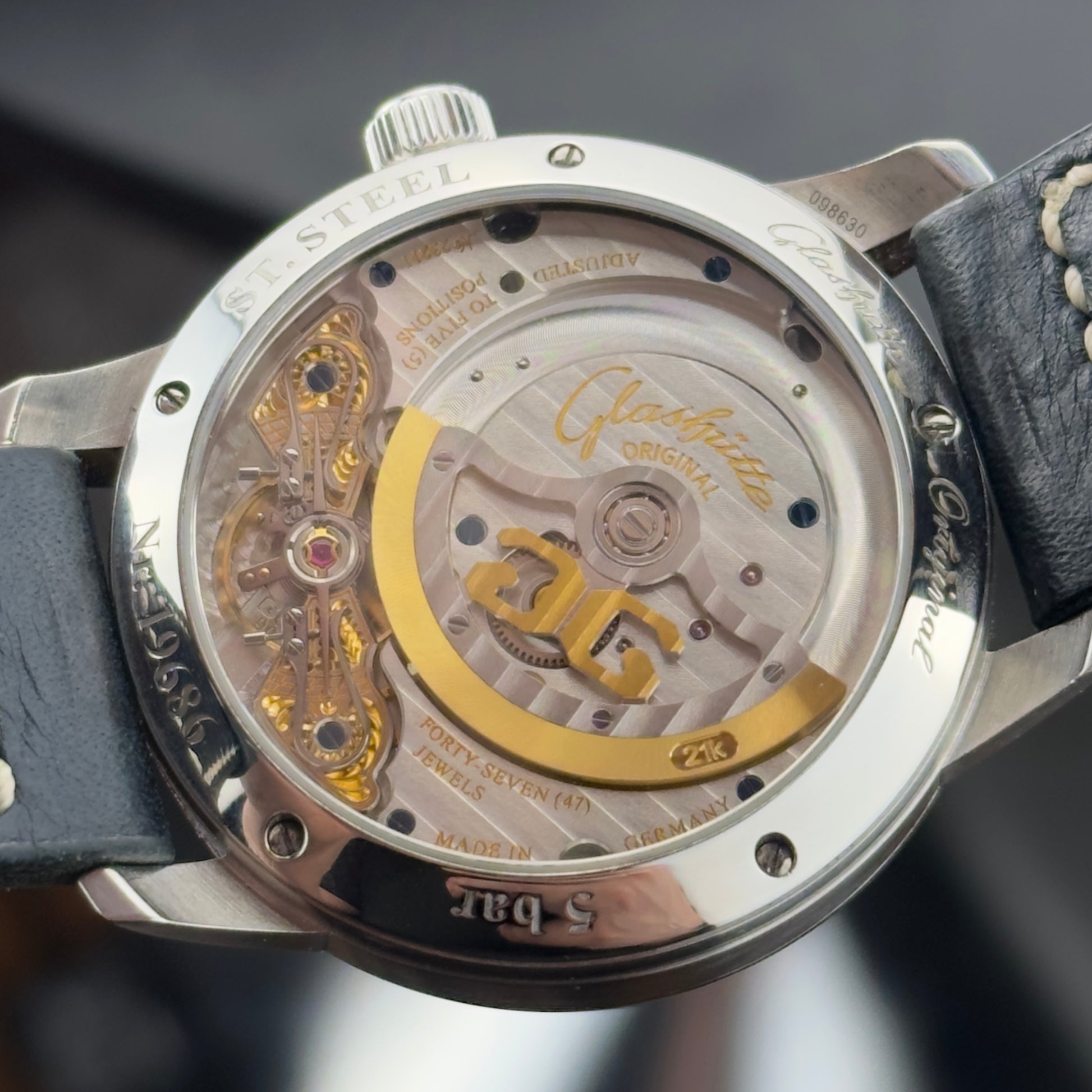 The 40mm stainless steel case is 12.7mm thick, and the sapphire caseback reveals the caliber 90-02. This is where the German finishing tradition shows itself: a Glashütte three-quarter plate, skeletonized off-center rotor with stripe finish, blued screws, polished steel components, and the brand's signature duplex swan's neck fine adjustment. The movement runs at 28,800 vph with a 42-hour power reserve.