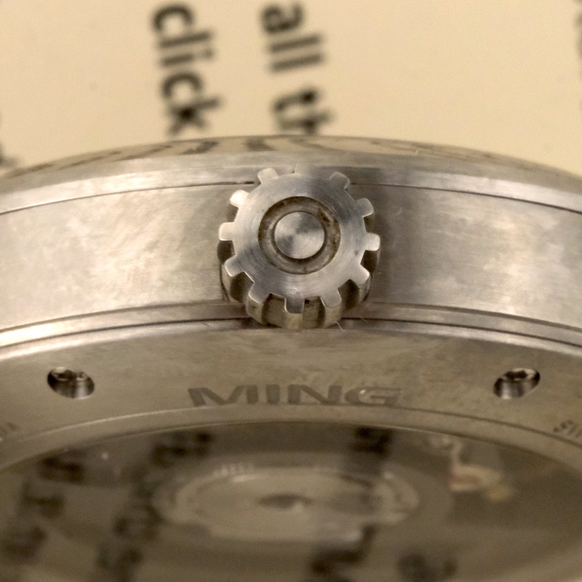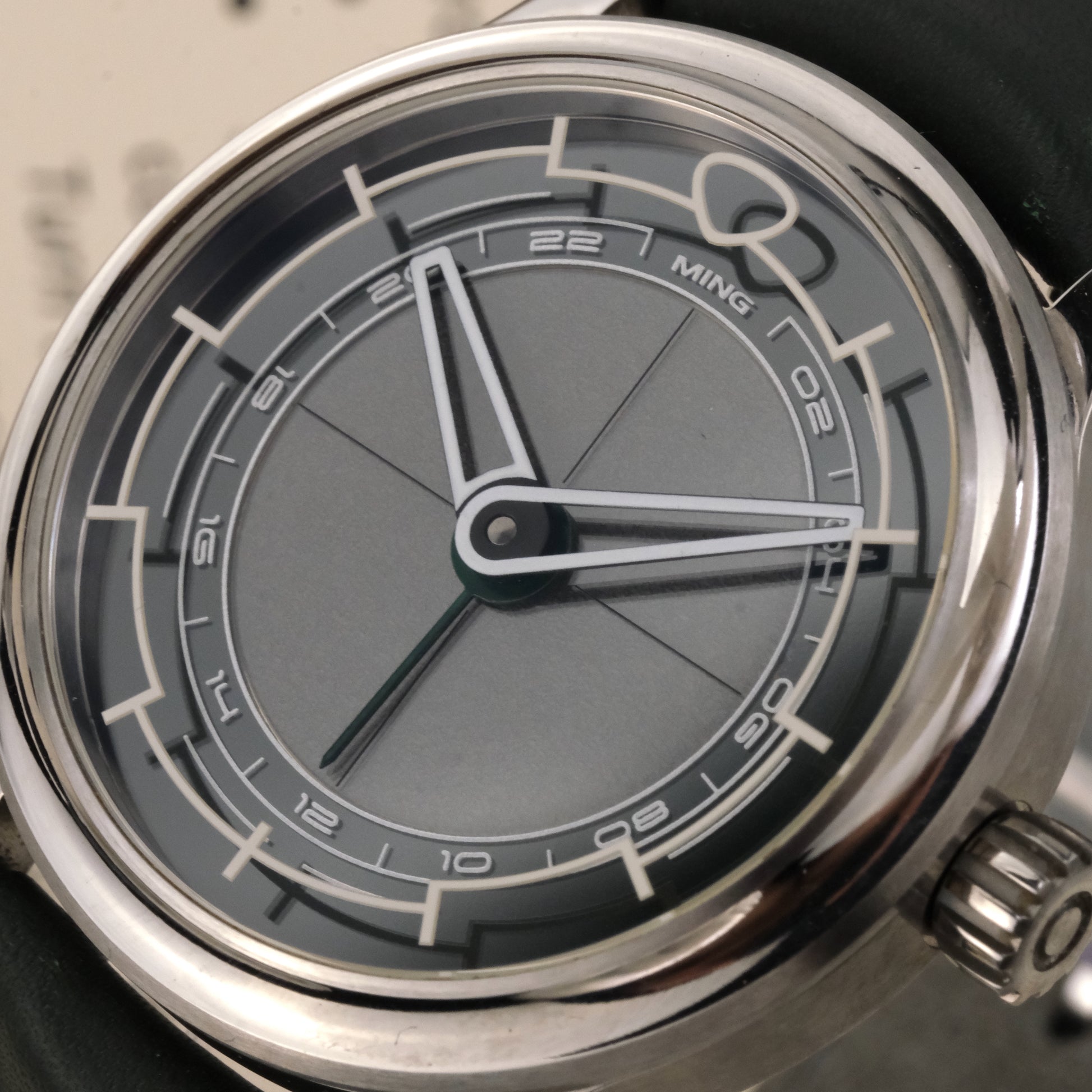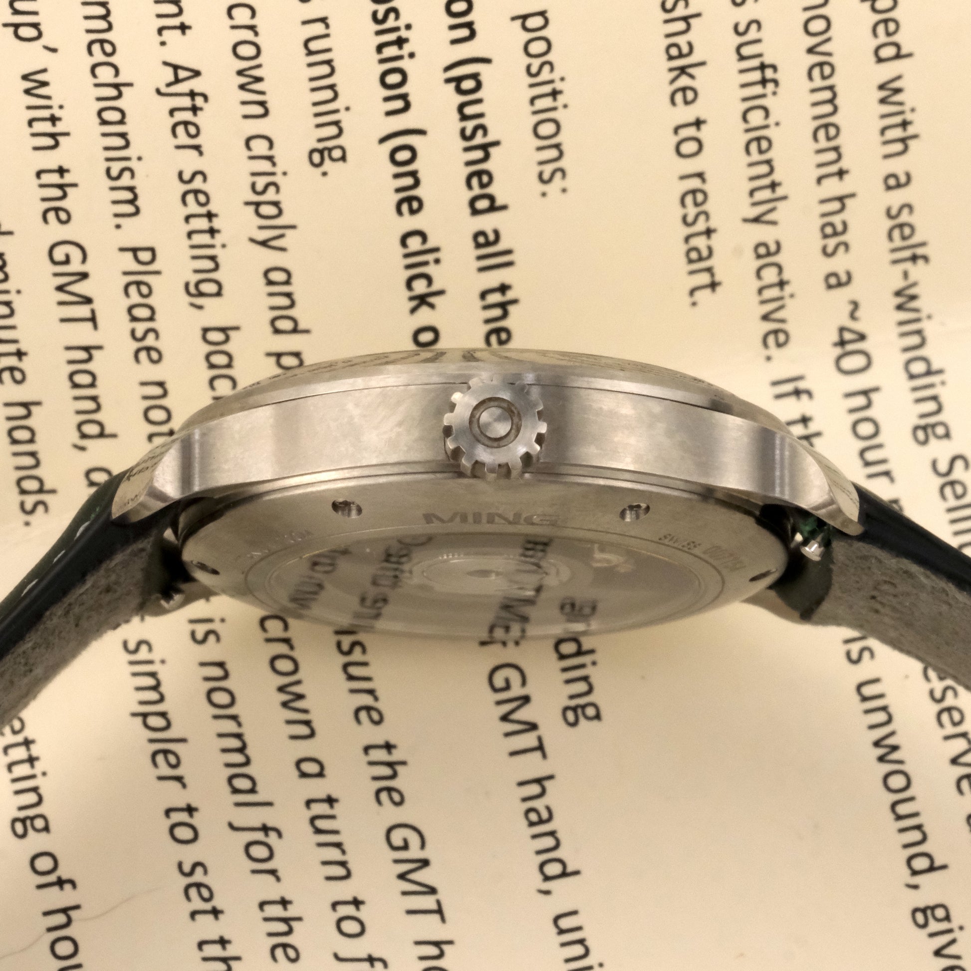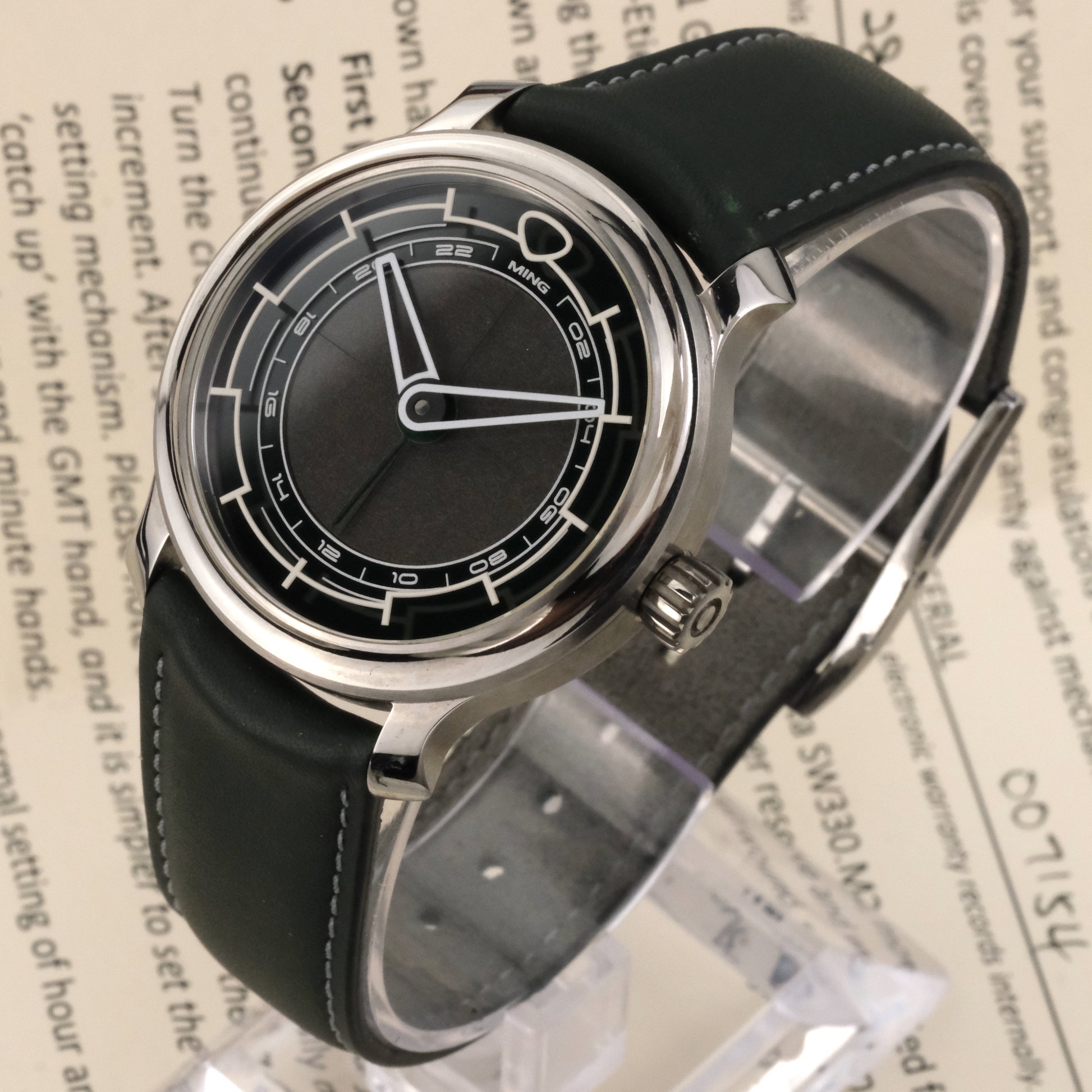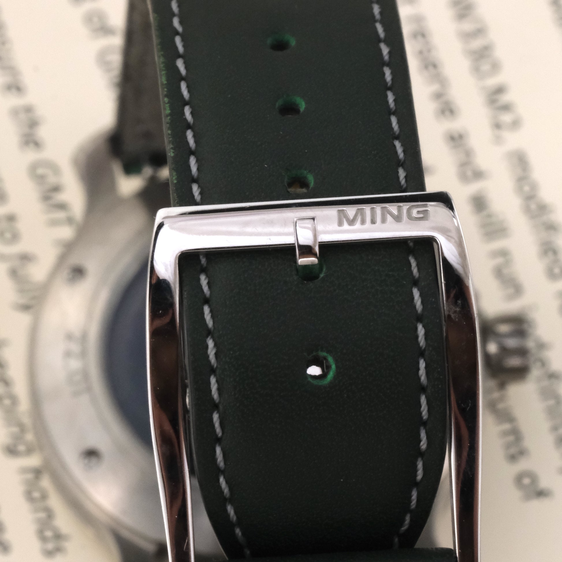 The sapphire ring carries the 24-hour GMT markings, rendered in luminous print and used in conjunction with the independent 24-hour hand to track a second timezone. Like many of Ming's releases, this one was produced in extremely limited numbers and sold out immediately on release.