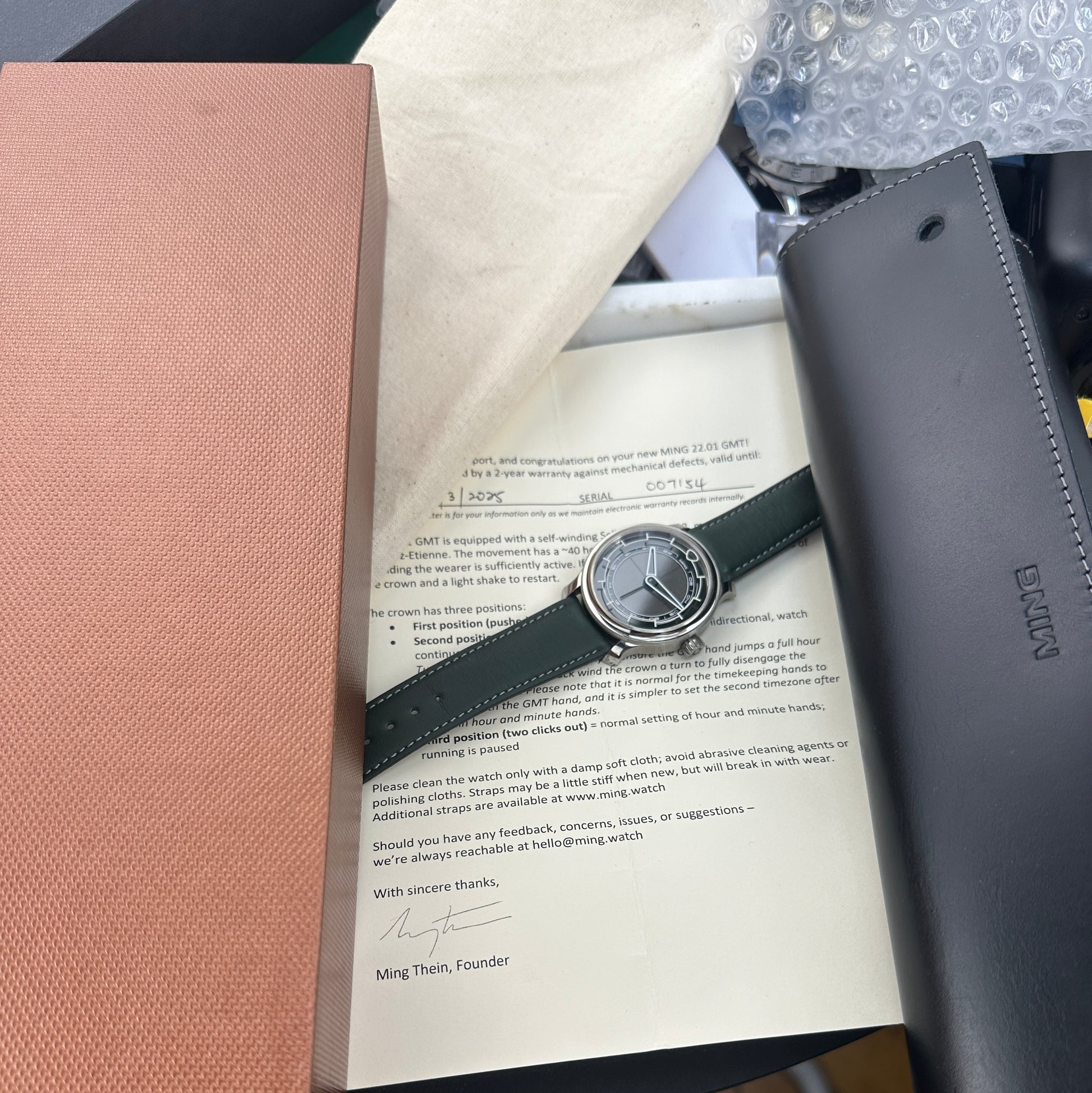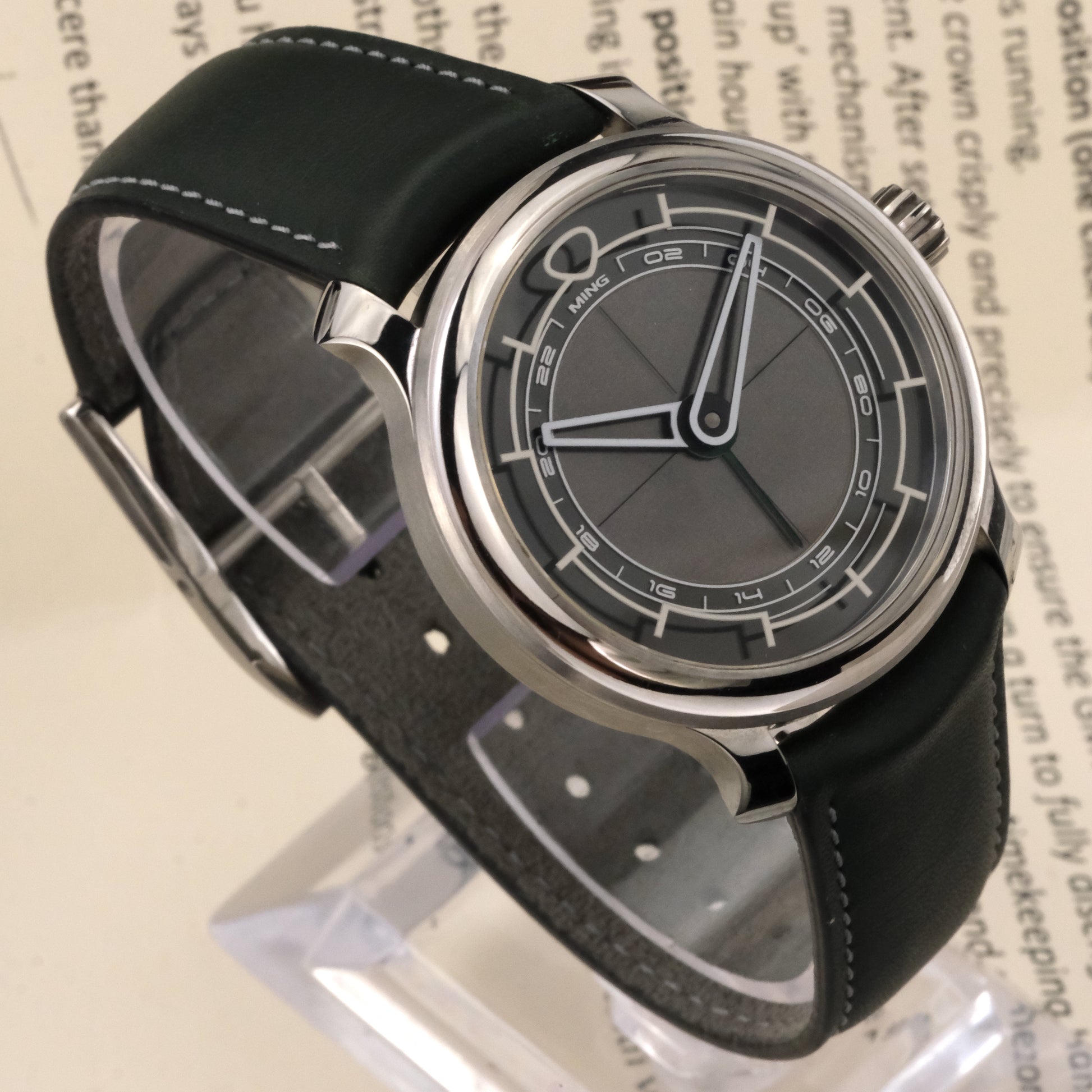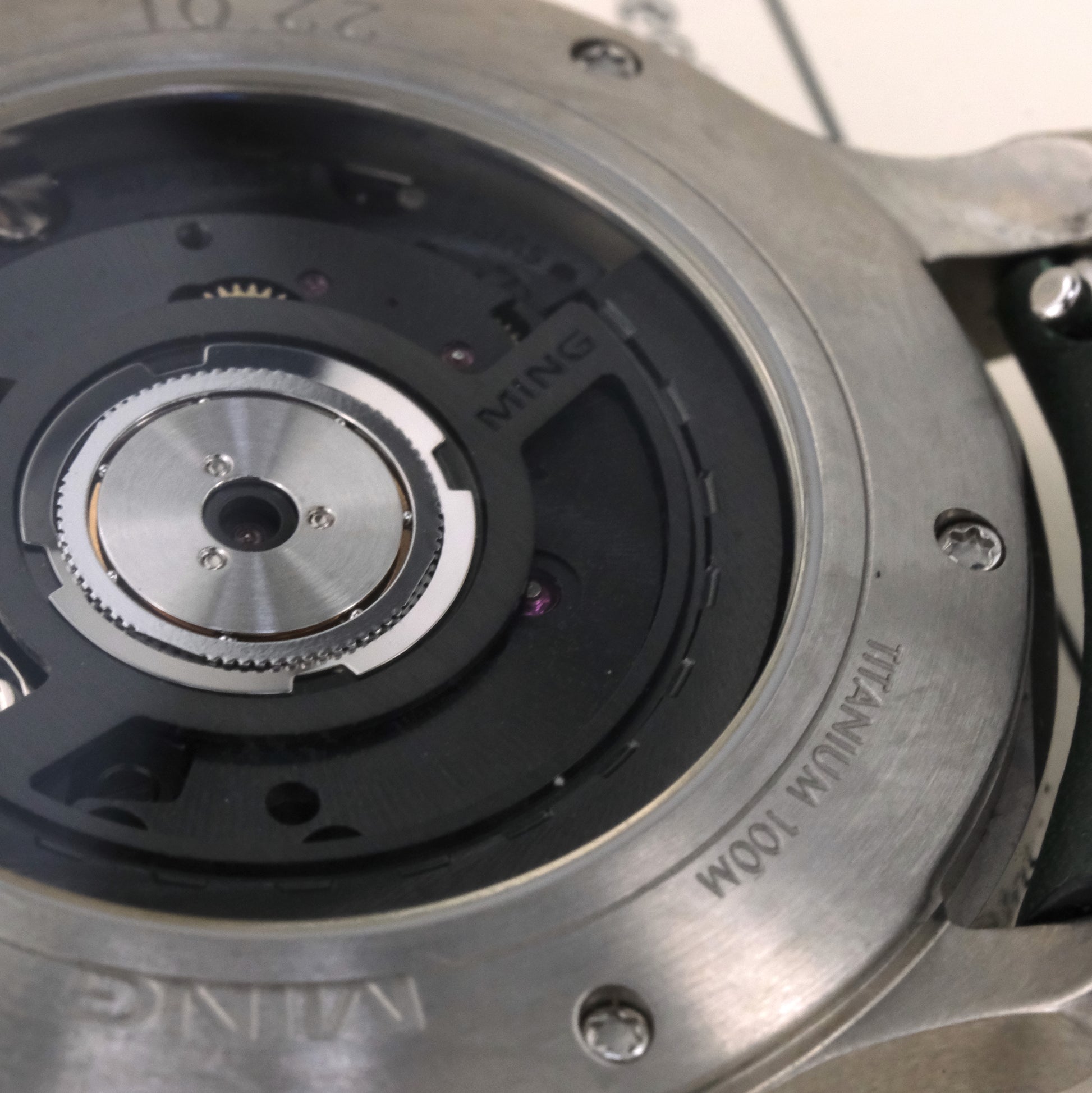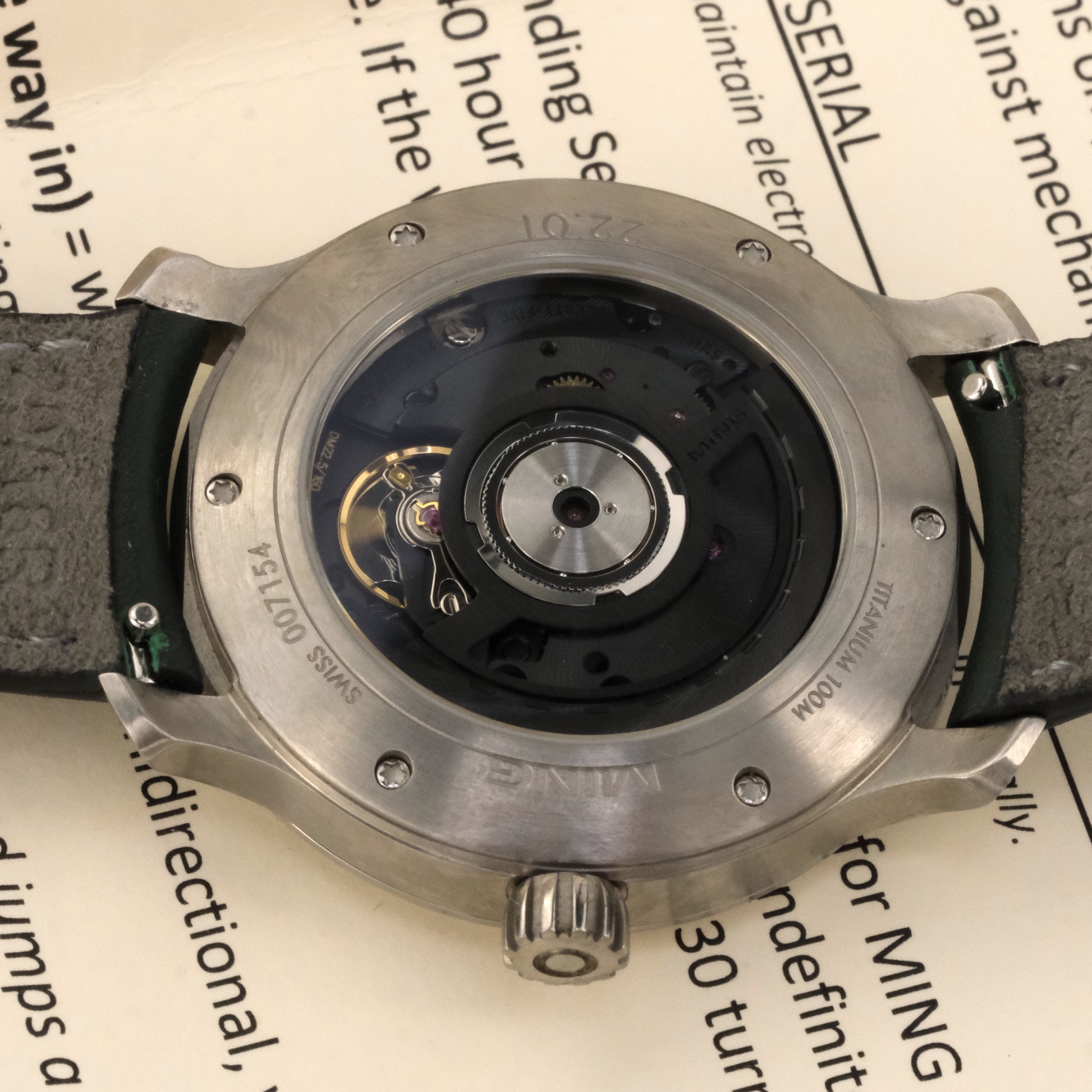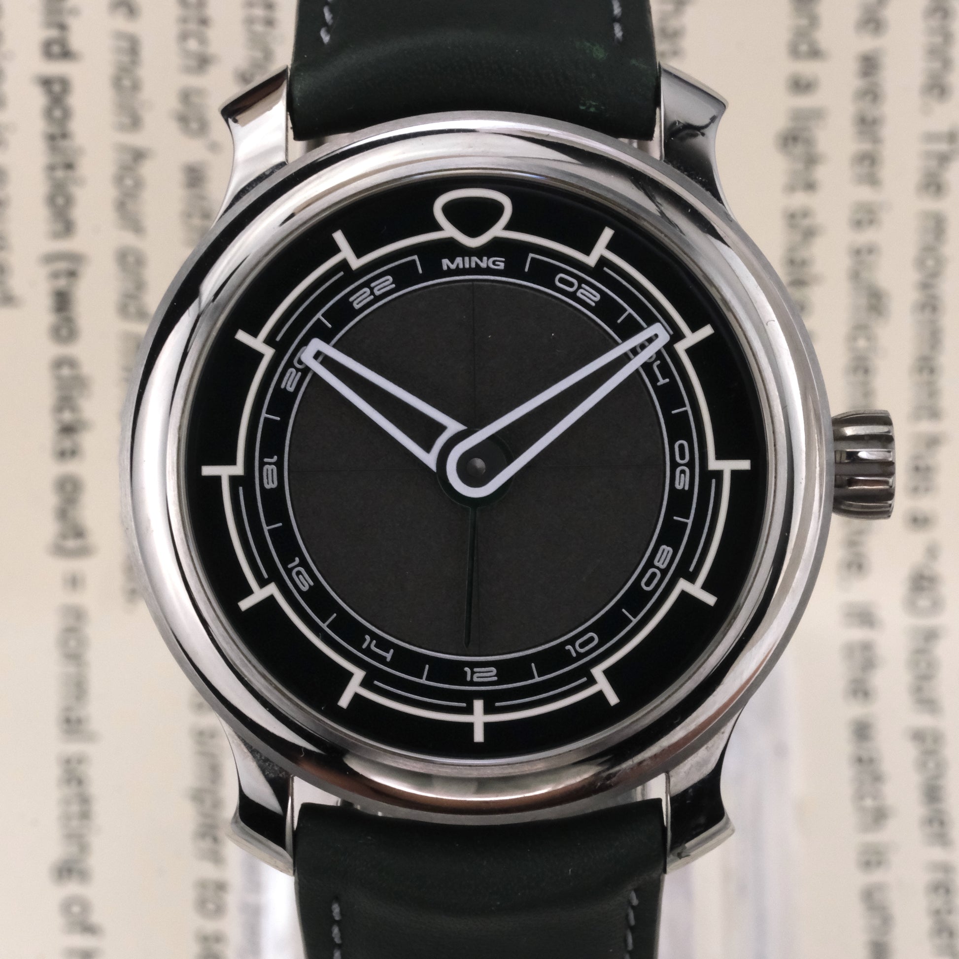 The sapphire ring carries the 24-hour GMT markings, rendered in luminous print and used in conjunction with the independent 24-hour hand to track a second timezone. Like many of Ming's releases, this one was produced in extremely limited numbers and sold out immediately on release.