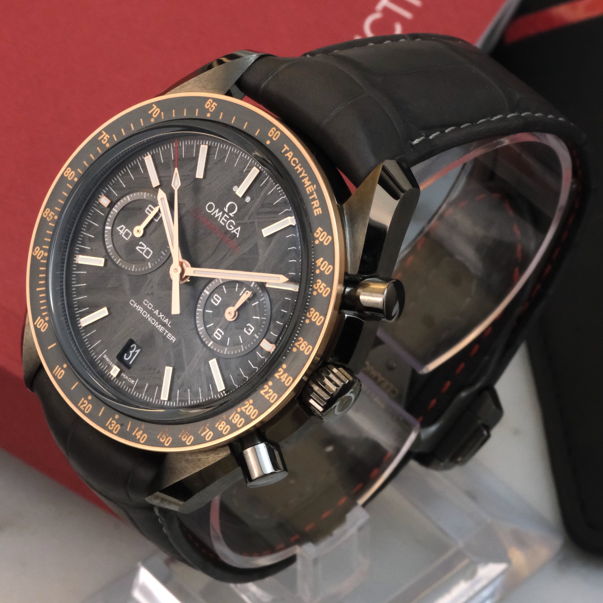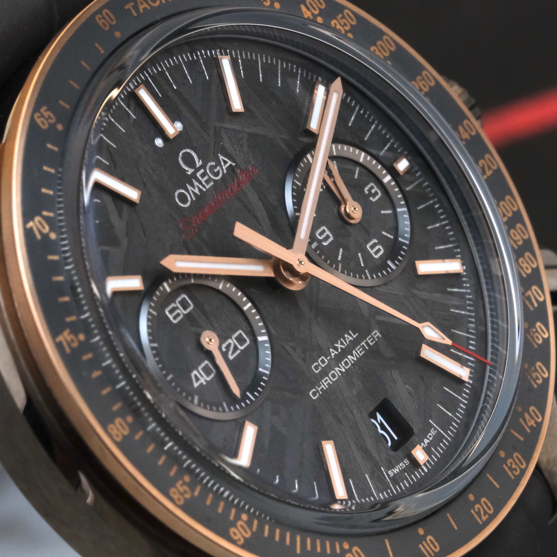 The Watch: The Grey Side of the Moon Meteorite is one of the most visually striking Speedmasters ever made, combining a full sandblasted ceramic case with a dial cut from a solid piece of meteorite, complete with the natural Widmanstätten pattern that only occurs in extraterrestrial iron, and rose gold accents.