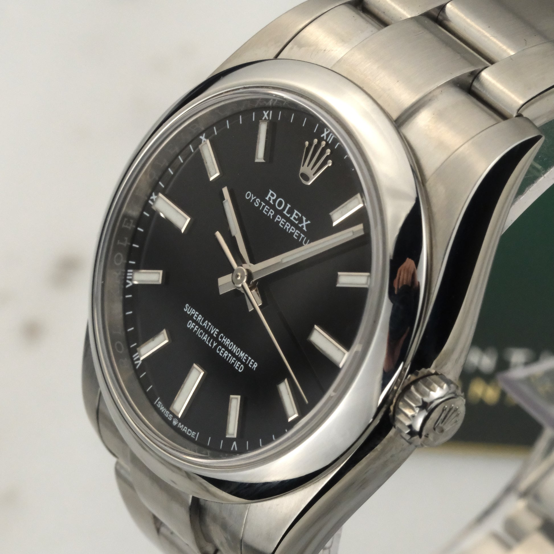 The Watch: The Rolex Oyster Perpetual 34 (Ref. 124200) in black is one ofthe purest expression of the Rolex design language: timekeeping stripped to its essentials, executed with flawless precision. The 34mm Oystersteel case features polished and brushed surfaces that highlight the brand’s unmatched finishing standards, paired with a smooth bezel and the signature Oyster bracelet with full links intact.