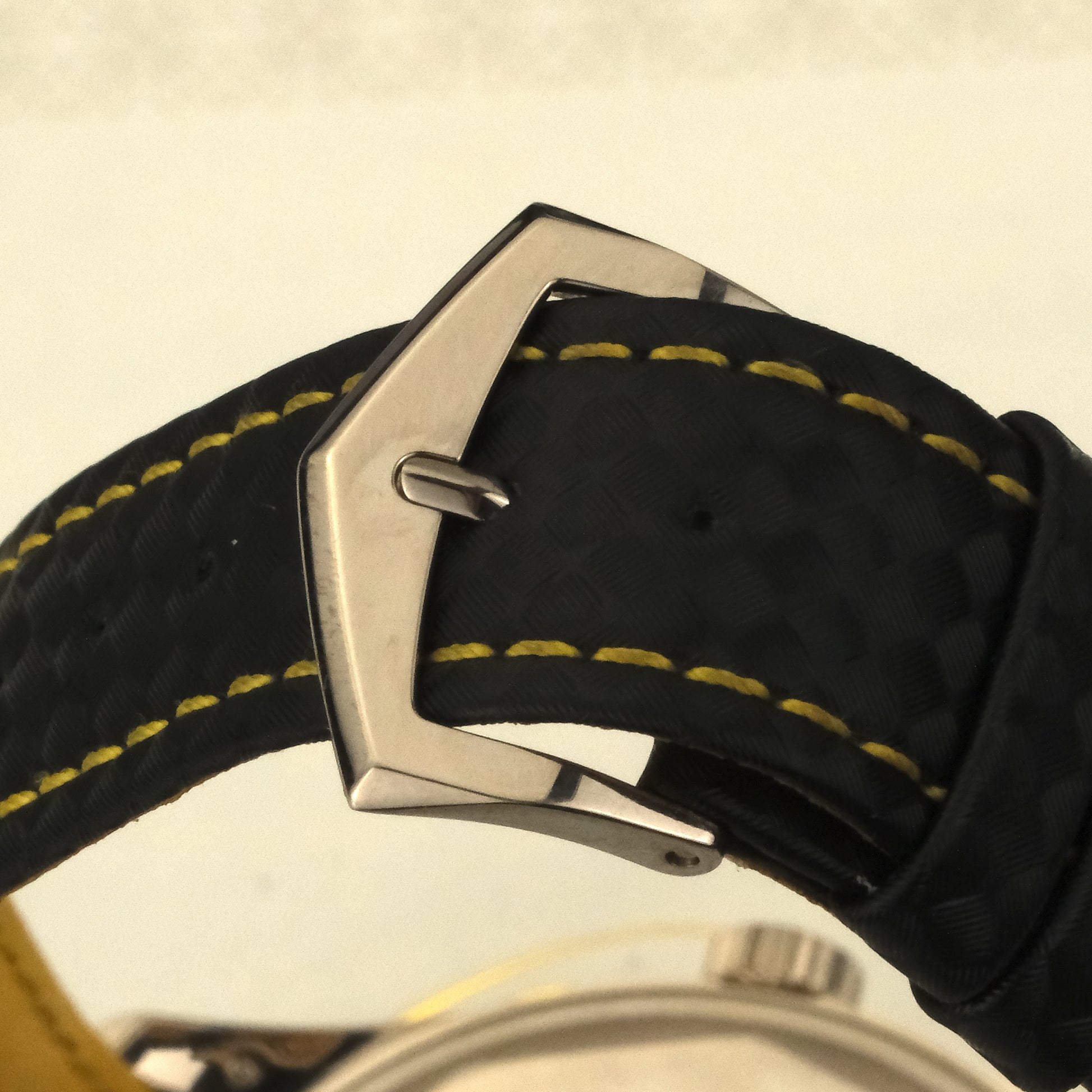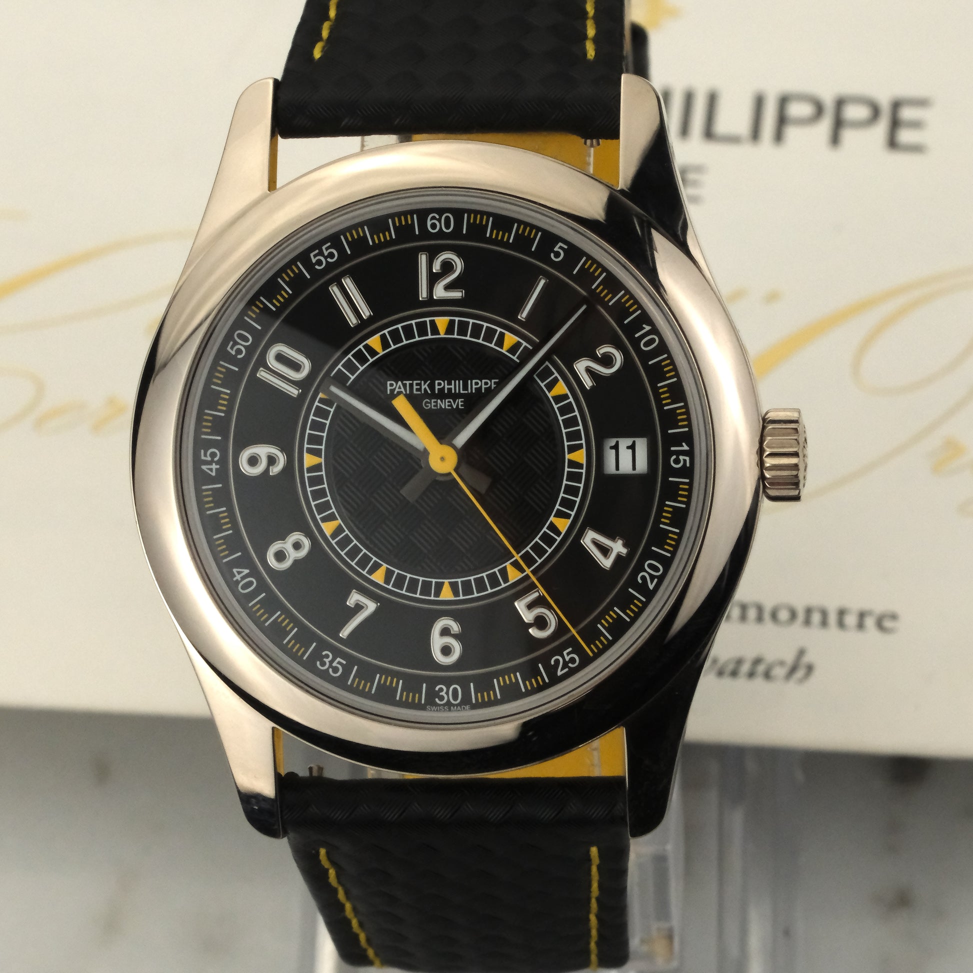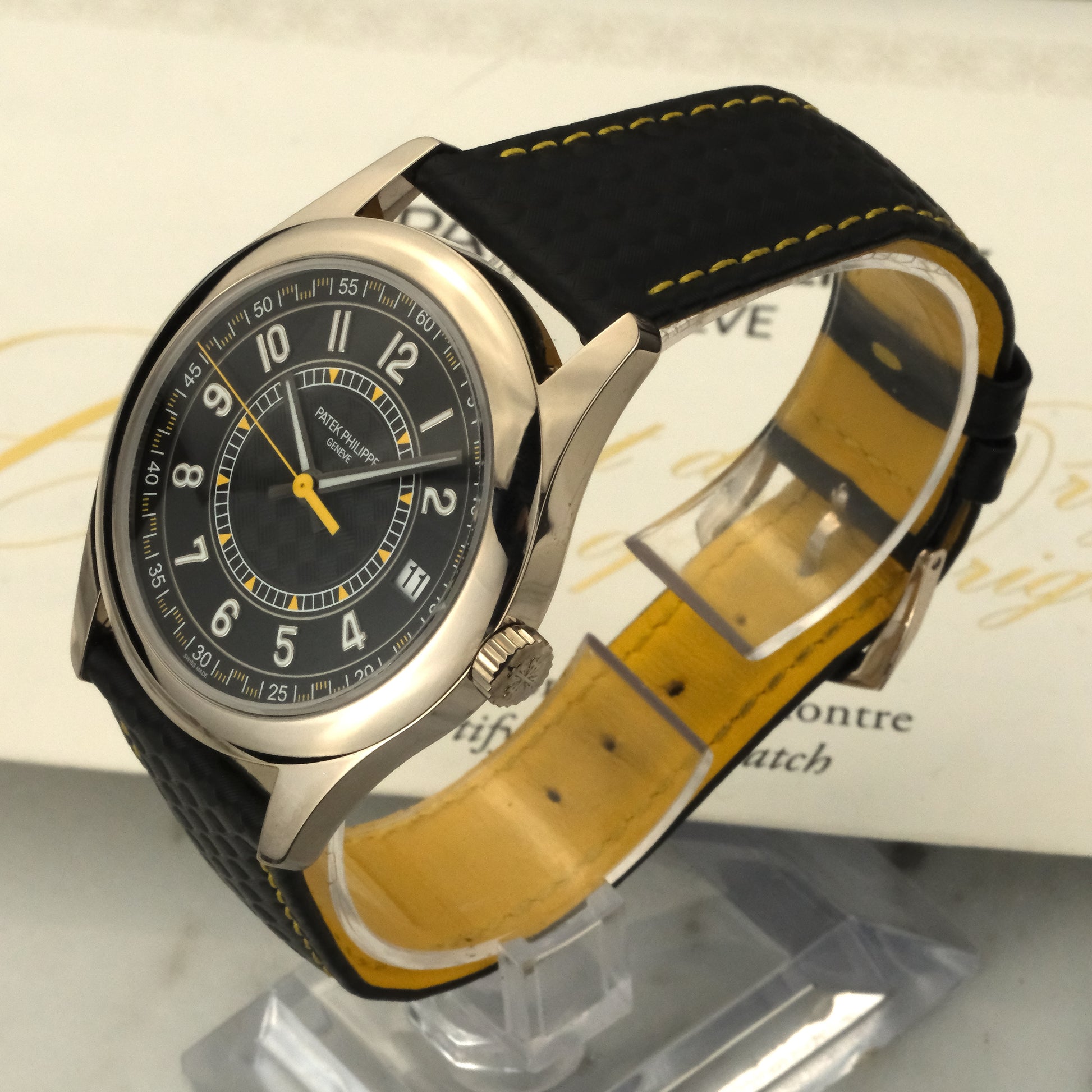 The 6007G-001 houses the manufacture in a 40mm white gold case. This example is the yellow variant. The textured pattern catches light differently across its surface, giving the dial depth. The carbon cross-hatch pattern is mirrored on the strap, as are the yellow accents. Inside, Patek's caliber 324 S C handles timekeeping duties with the brand's typical over-engineering.
