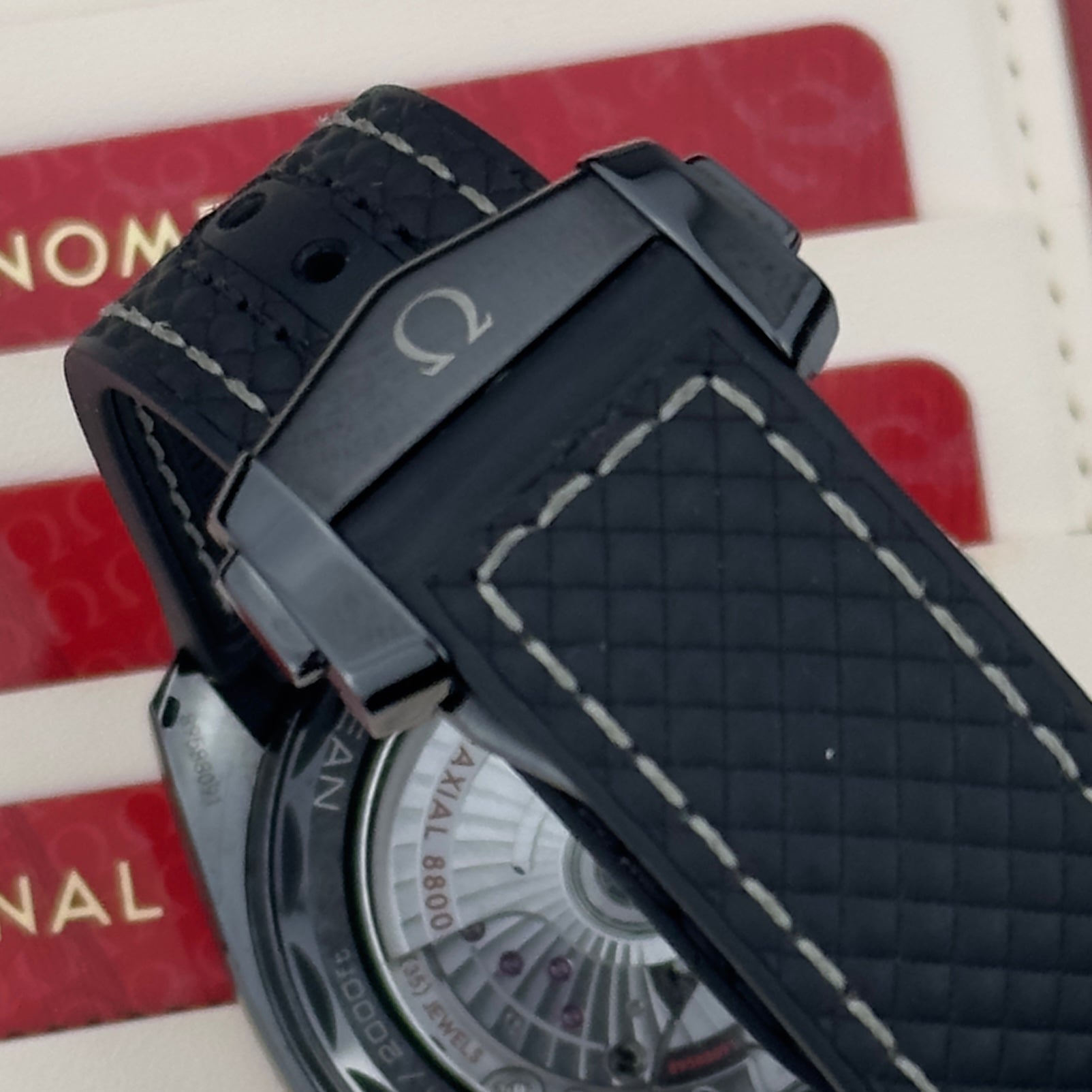 Inside is Omega's caliber 8800, a Master Chronometer certified by METAS. That certification goes beyond COSC chronometer testing: the assembled watch (not just the movement) is tested for magnetic resistance to 15,000 gauss, water resistance, power reserve, and accuracy in six positions. Power reserve is 55 hours at 25,200 vph with 35 jewels. The movement features Omega's Si14 silicon hairspring and co-axial escapement.