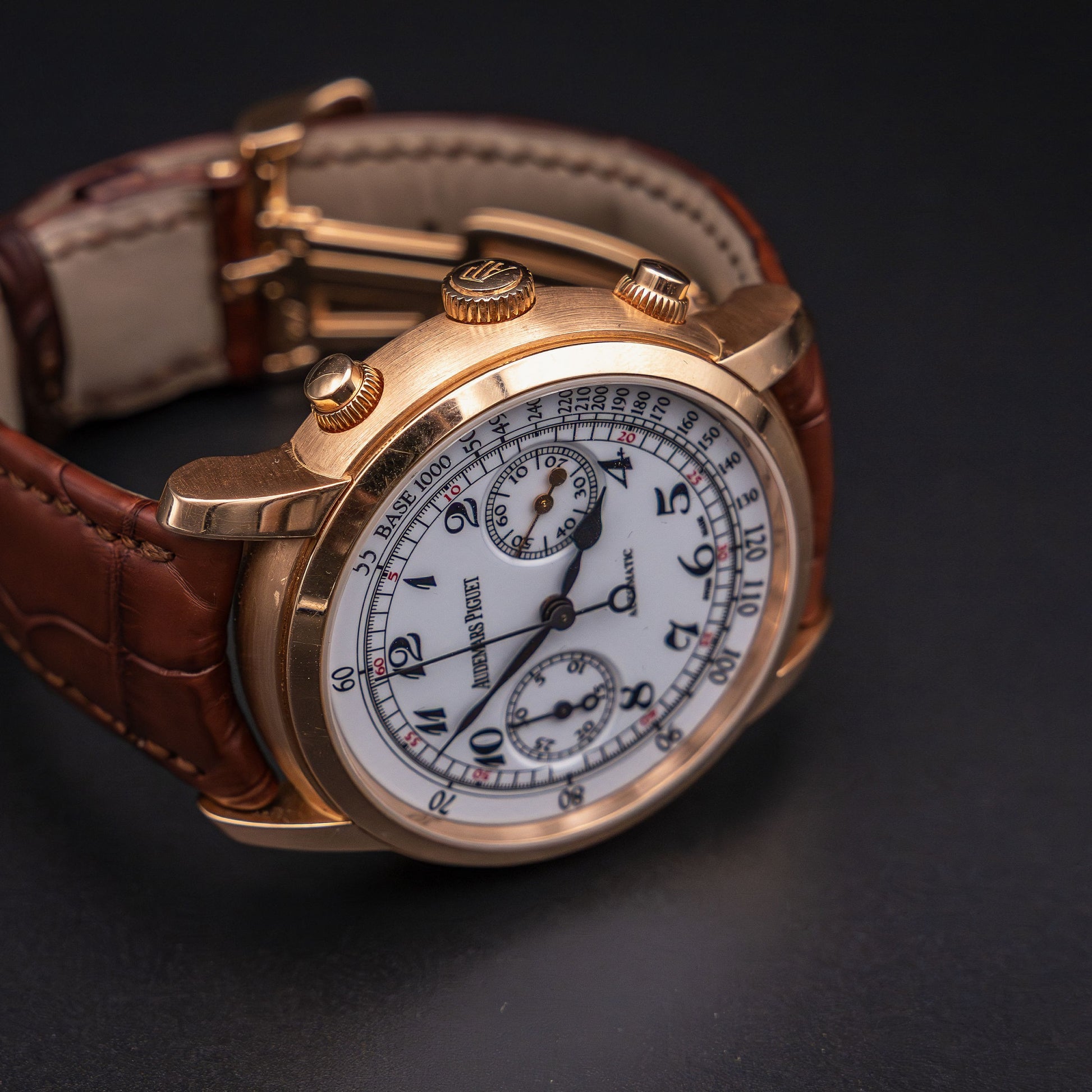 The white lacquered dial organizes the chronograph functions with classical logic: small seconds at three o'clock, 30-minute counter at nine, central chronograph hand, and a tachymeter scale ringing the outer edge. Black Arabic numerals and leaf-shaped hands, including a contrasting gold seconds hand complete the layout. Inside, AP's caliber 3124/3841 provides 60 hours of power reserve, with a solid gold rotor bearing the AP family crest visible through the caseback.