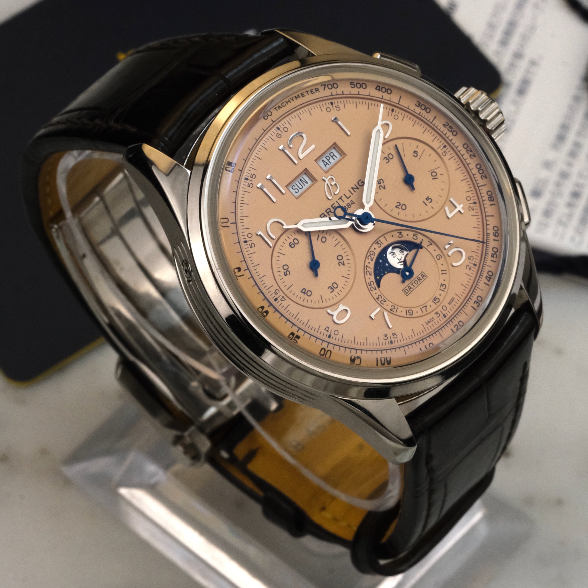 The Watch: The B25 Datora is Breitling reaching back to its more refined roots—before Navitimers ruled the skies, it was building calendar chronographs for the ground-bound gentleman. At 42mm, it’s a lot of dial, but it makes good use of the real estate: day, date, month, moonphase, and a column-wheel chronograph all laid out across a warm copper backdrop.