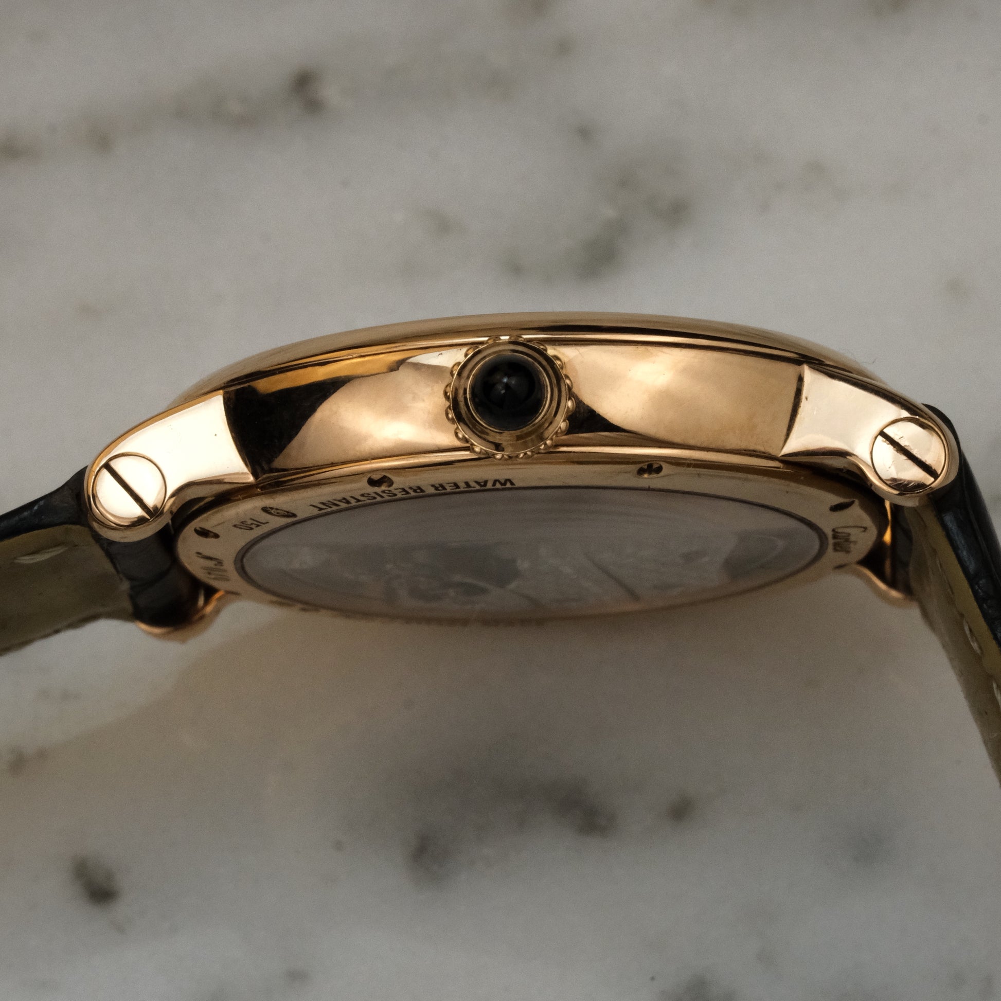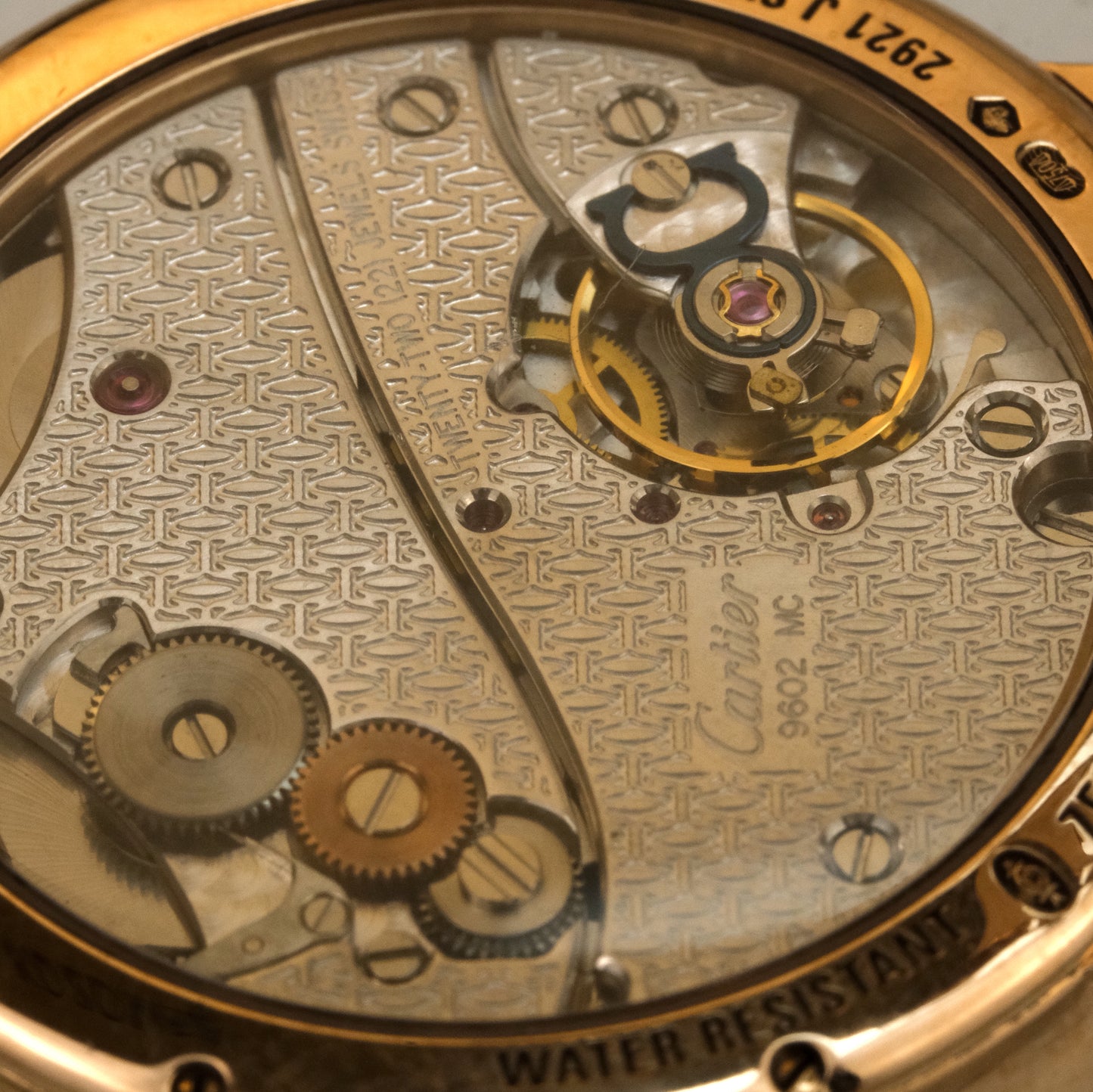 Inside beats the Caliber 9602 MC, an ultra-thin, hand-wound movement developed in-house by Cartier, featuring twin barrels and thoughtful finishing visible through the sapphire caseback.