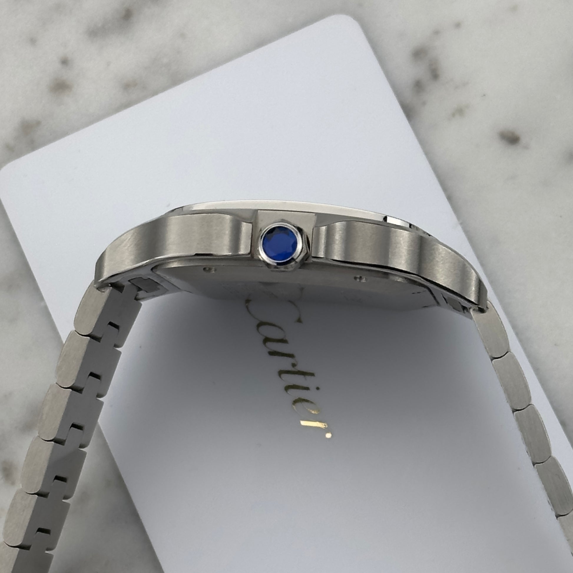Reference WSSA0030 presents the large model in steel with a graduated blue dial that shifts from lighter at the center to darker at the edges. The chemin de fer minute track, sword-shaped hands, and Roman numerals maintain the design language Cartier established over a century ago. The current generation includes QuickSwitch lugs for tool-free strap changes and SmartLink bracelet adjustment. Caliber 1847 MC handles timekeeping with approximately 42 hours of power reserve.