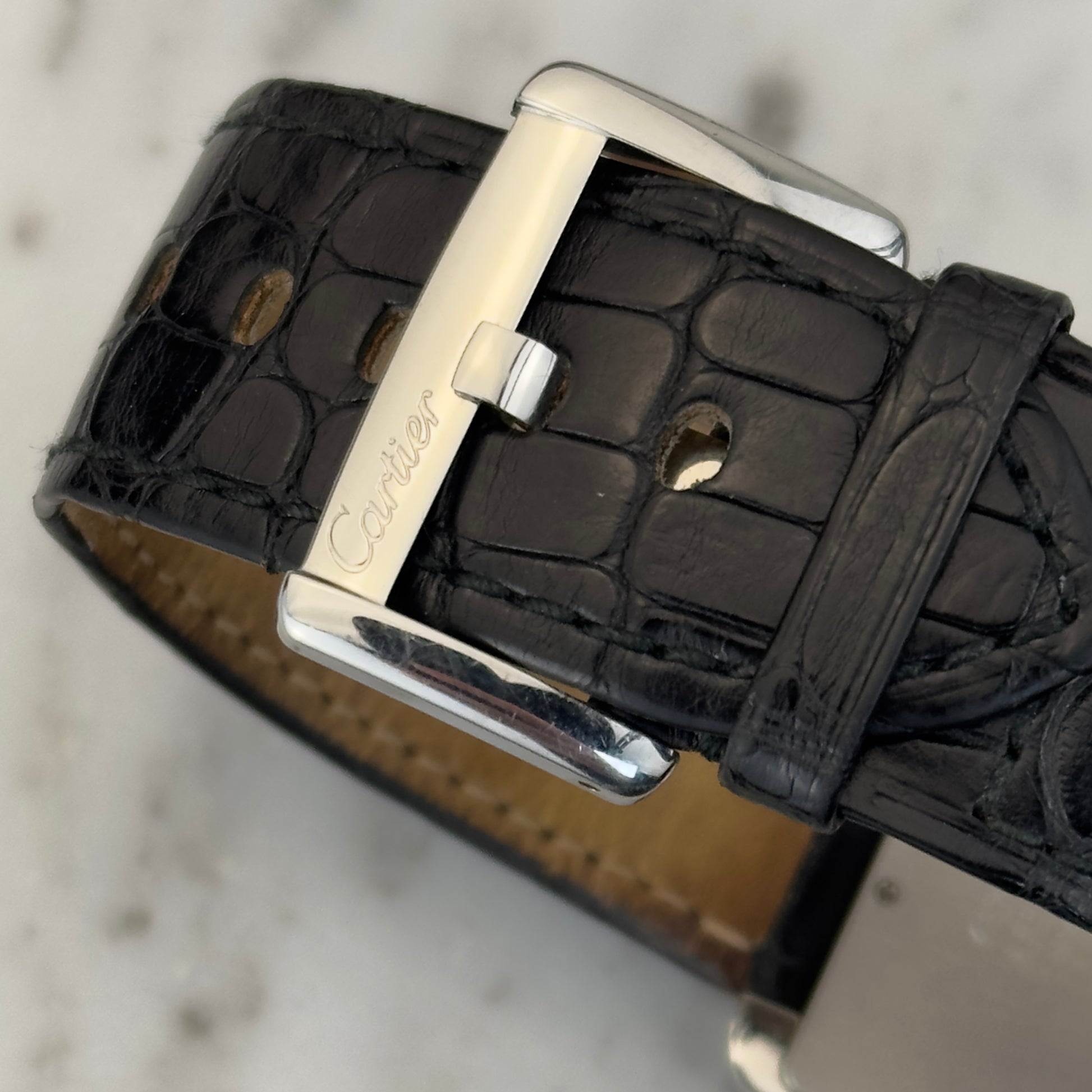 Reference W6300755 is the automatic version in steel, produced during the Divan's short run from 2002 to 2007. The 38mm x 30mm case houses Cartier's caliber 120, a 20-jewel automatic movement visible through the eight-screw caseback. The dial retains the Cartier essentials: guilloché silver finish, radial Roman numerals that stretch toward the case edges, blued steel sword hands, and the hidden signature at VII. A blue spinel cabochon crowns the winding stem.