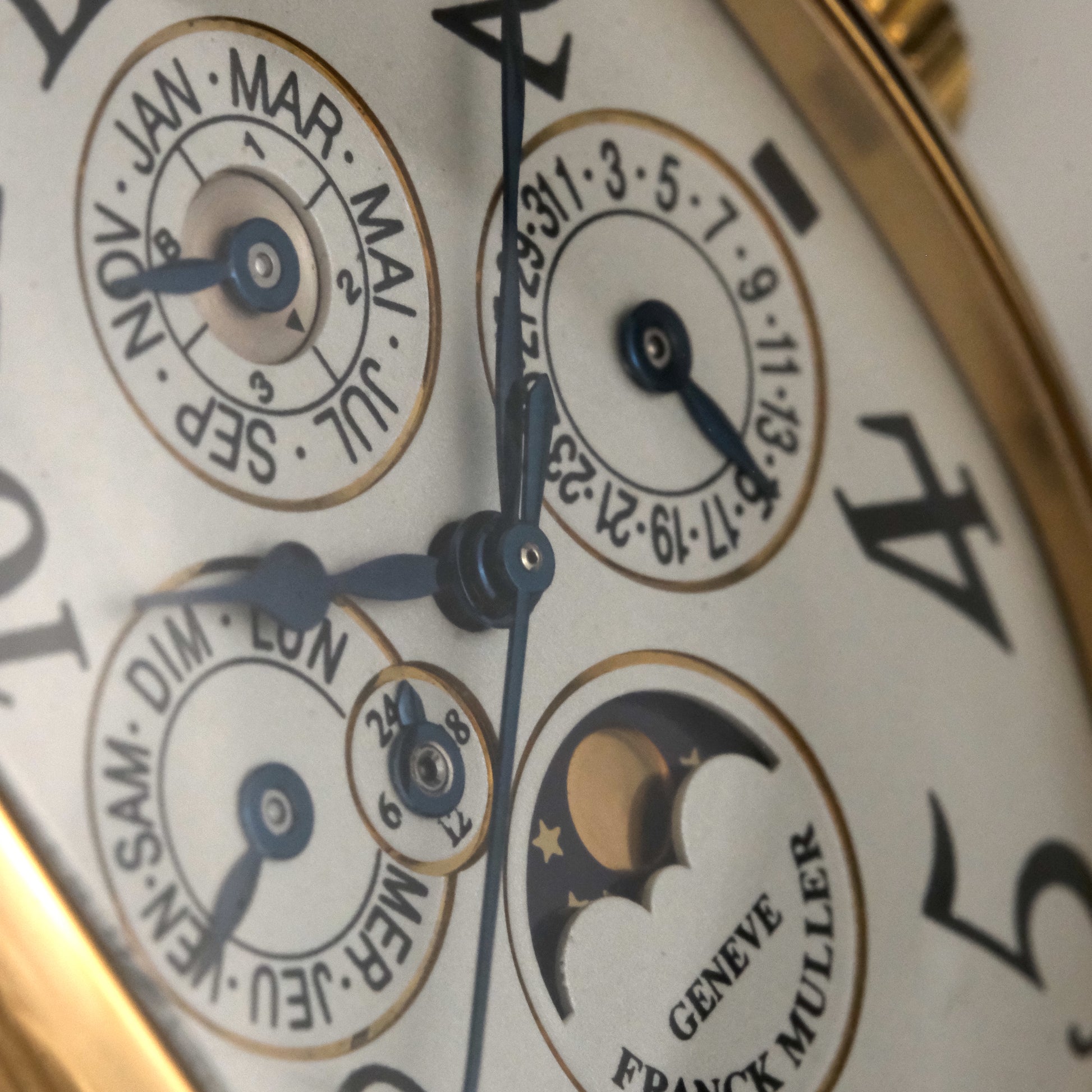 The Watch: Franck Muller has long been known as the “Master of Complications,” and the 5850 Quantième Perpétuel exemplifies why. Housed in the brand’s signature Cintrée Curvex case, this perpetual calendar displays the full measure of Muller’s technical and aesthetic vision. The 18k yellow gold case measures 32mm x 45mm, curved for ergonomic comfort and striking presence on the wrist.