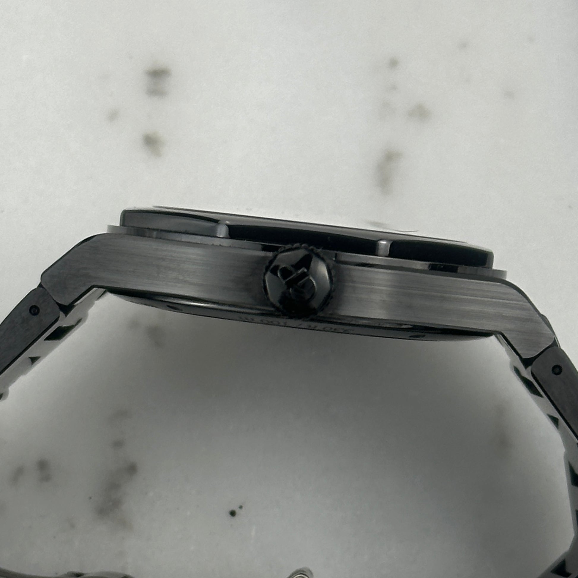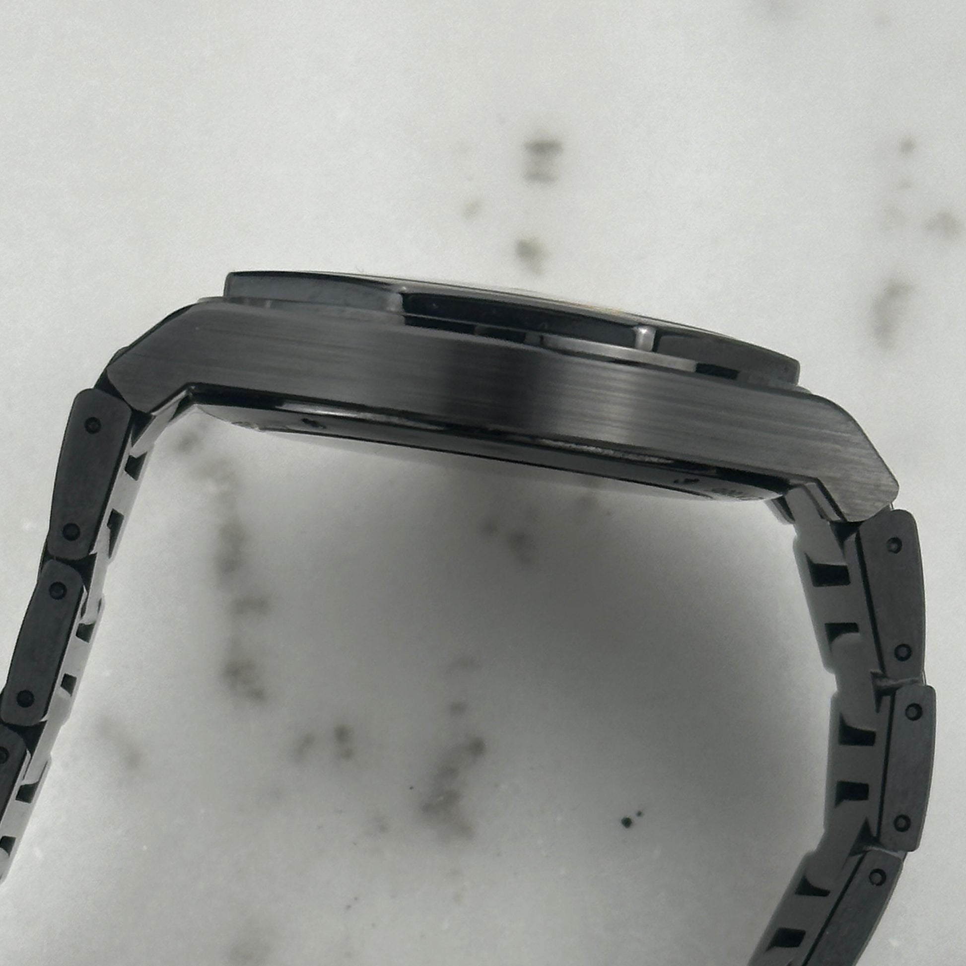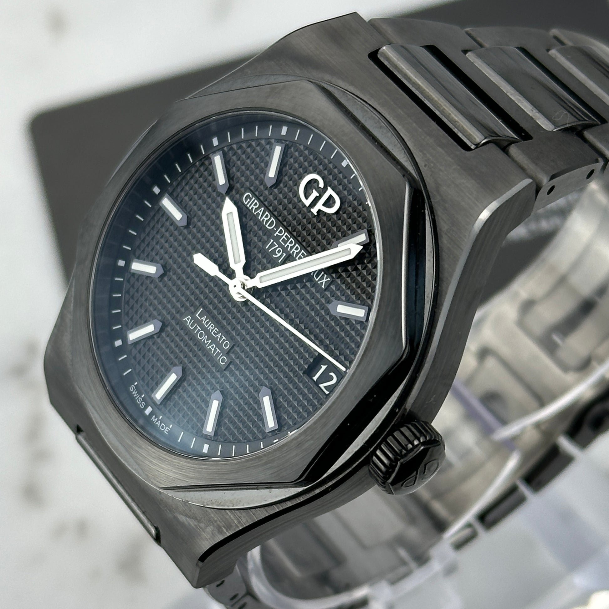 The Watch: The all-black ceramic Laureato is a stealth take on GP’s long-running integrated bracelet design. This version, reference 81010-32-631-32A, features a 42mm case and bracelet entirely in matte black ceramic. The surfaces are brushed with polished bevels along the case and bracelet edges, giving it depth without flash.