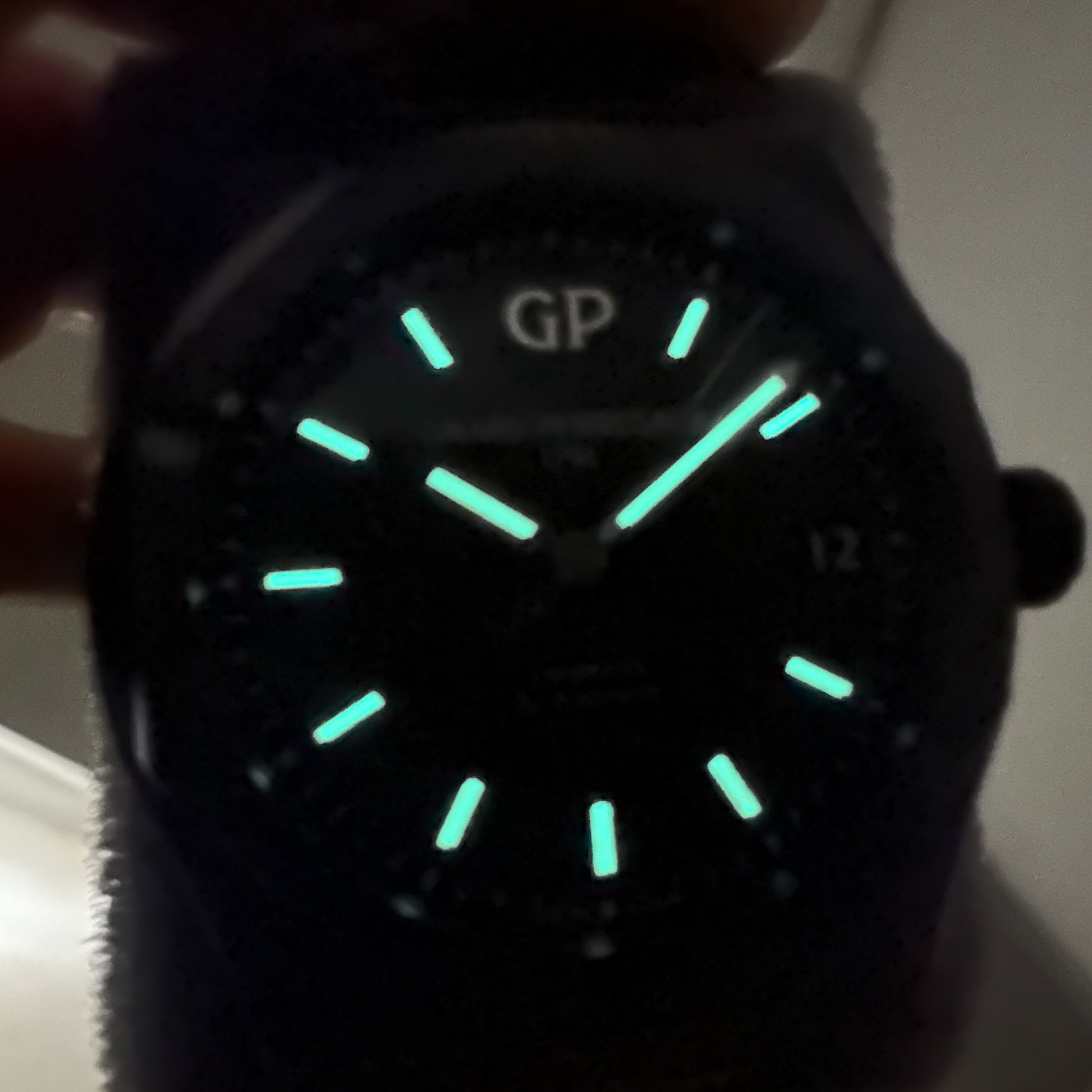 The dial is a black Clous de Paris pattern with applied indices and GP’s signature baton hands. There is a date at 3 o’clock, but otherwise the layout stays clean and symmetrical. Despite the monochrome look, legibility is sharp thanks to the interplay of matte textures and polished details.