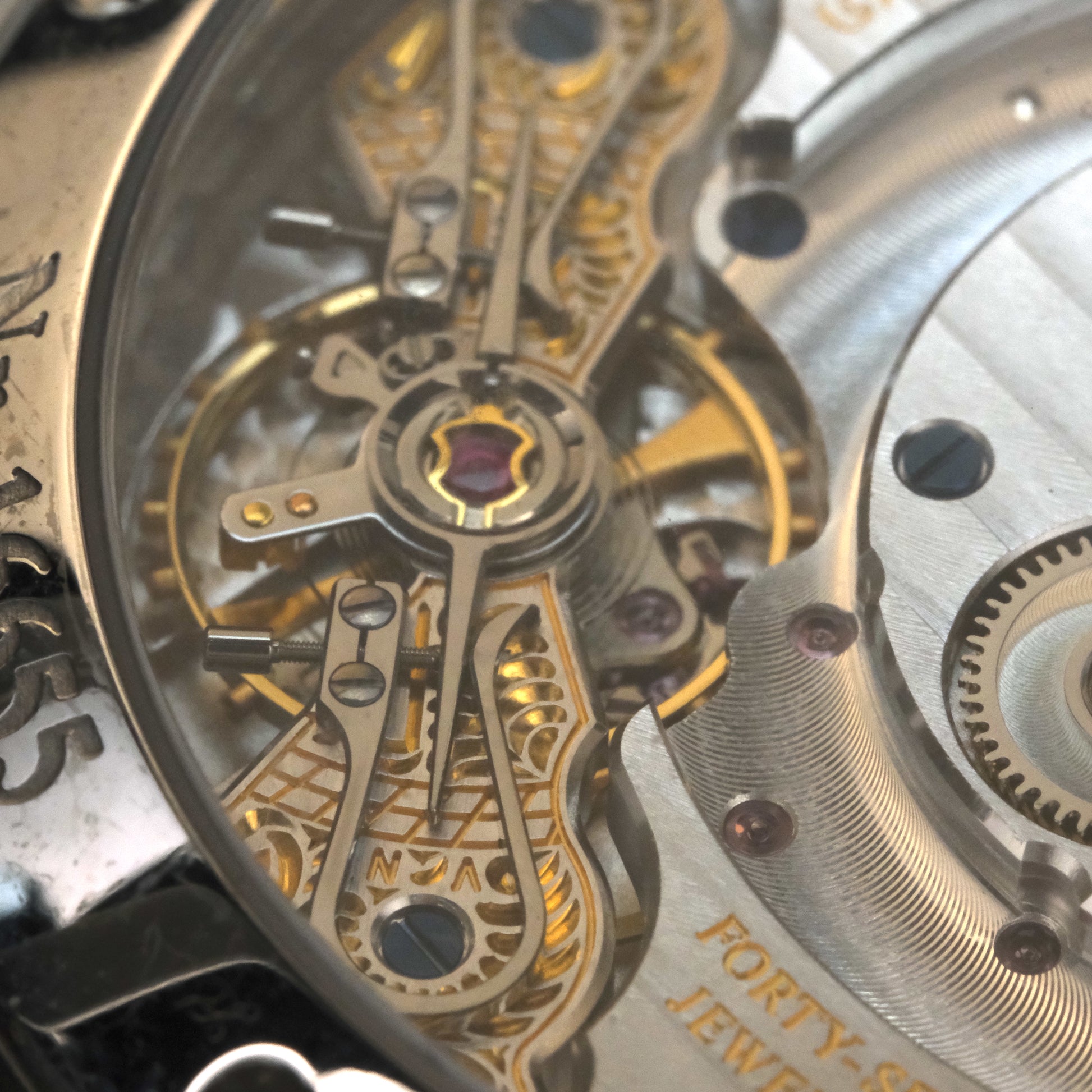 Powering the watch is the in-house caliber 90-02, visible through the sapphire caseback. The movement boasts a 42-hour power reserve, off-center rotor with 21k gold weight, and traditional Glashütte details: hand-engraved balance bridge, and swan-neck fine adjustment.