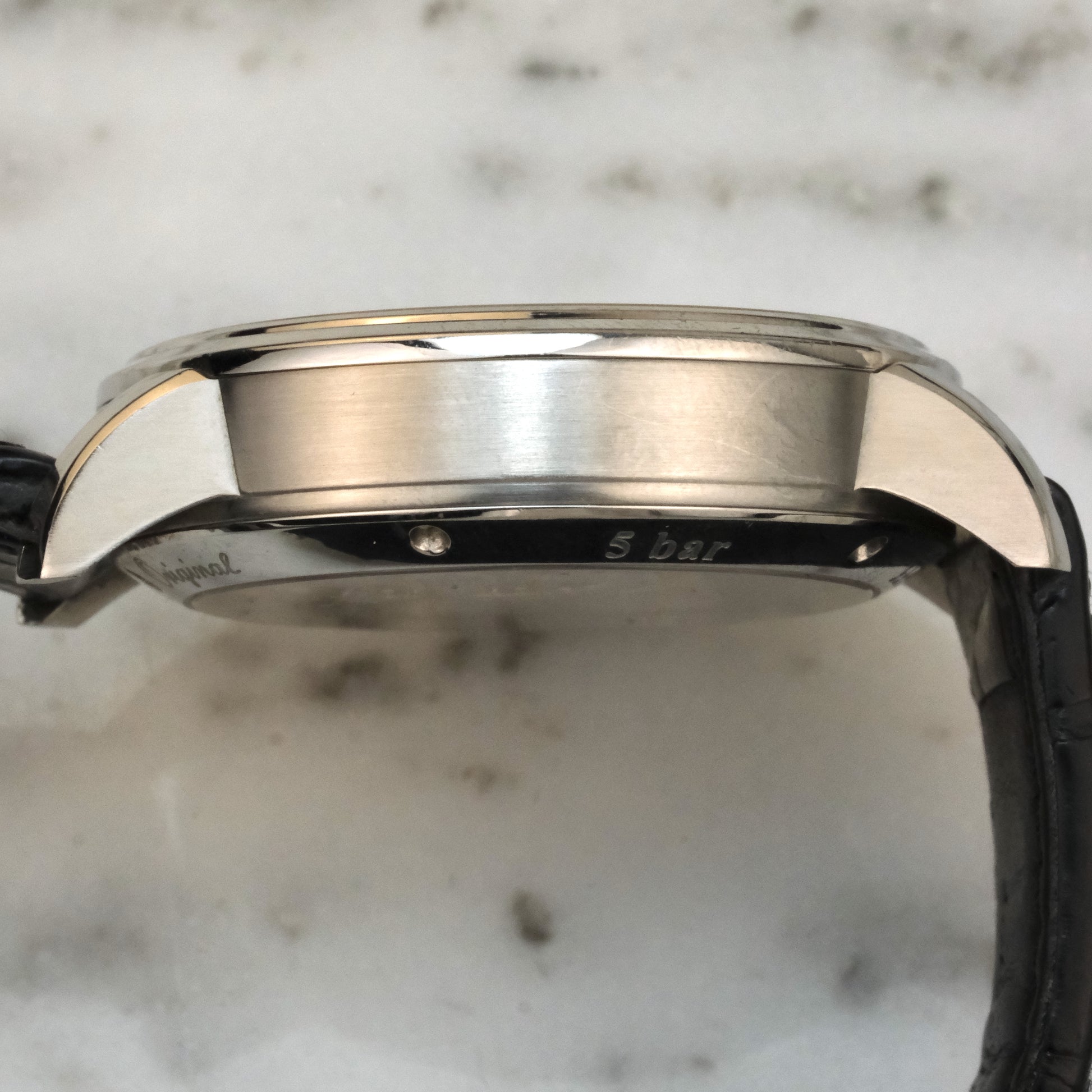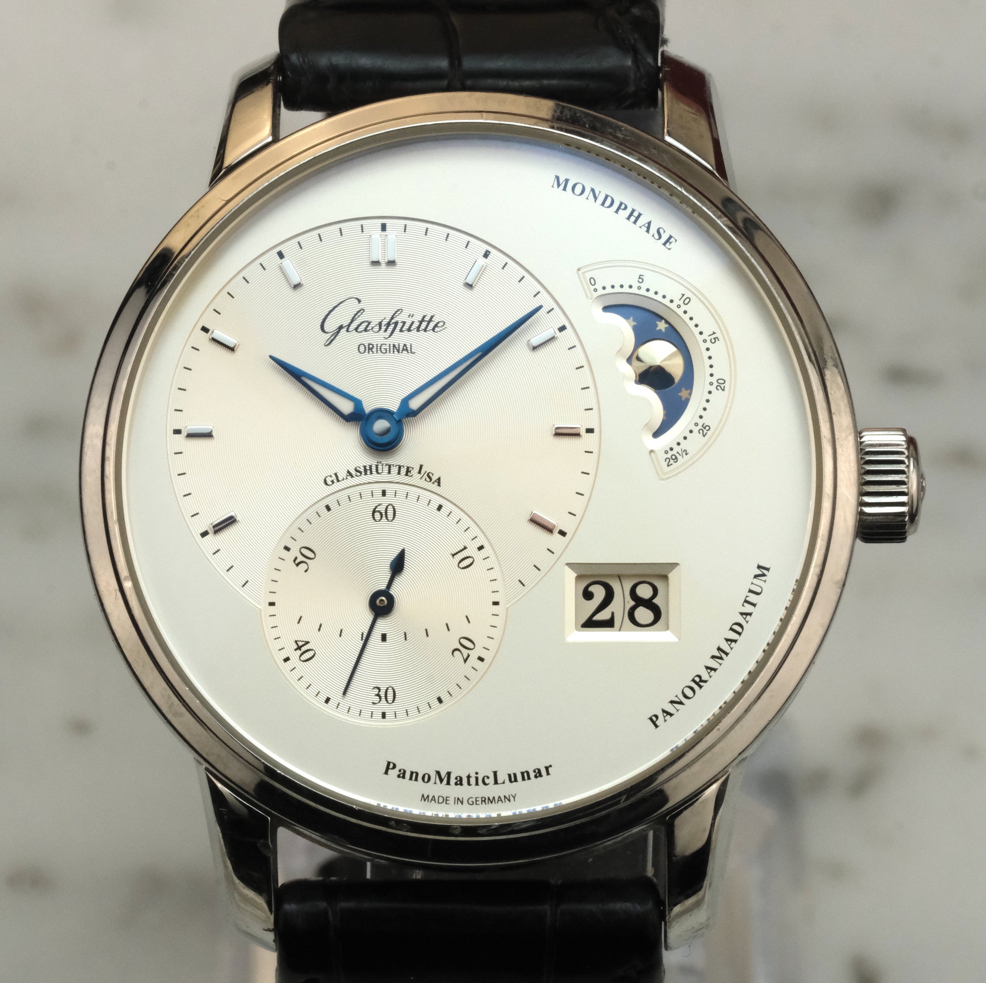 The Watch: The Glashütte Original PanoMaticLunar (Ref. 1-90-02-43-32-62) offers sharply designed Saxon watchmaking with its off-center dial layout and matte ivory dial. Housed in a 40mm stainless steel case, this piece balances asymmetry and elegance in true Glashütte fashion.