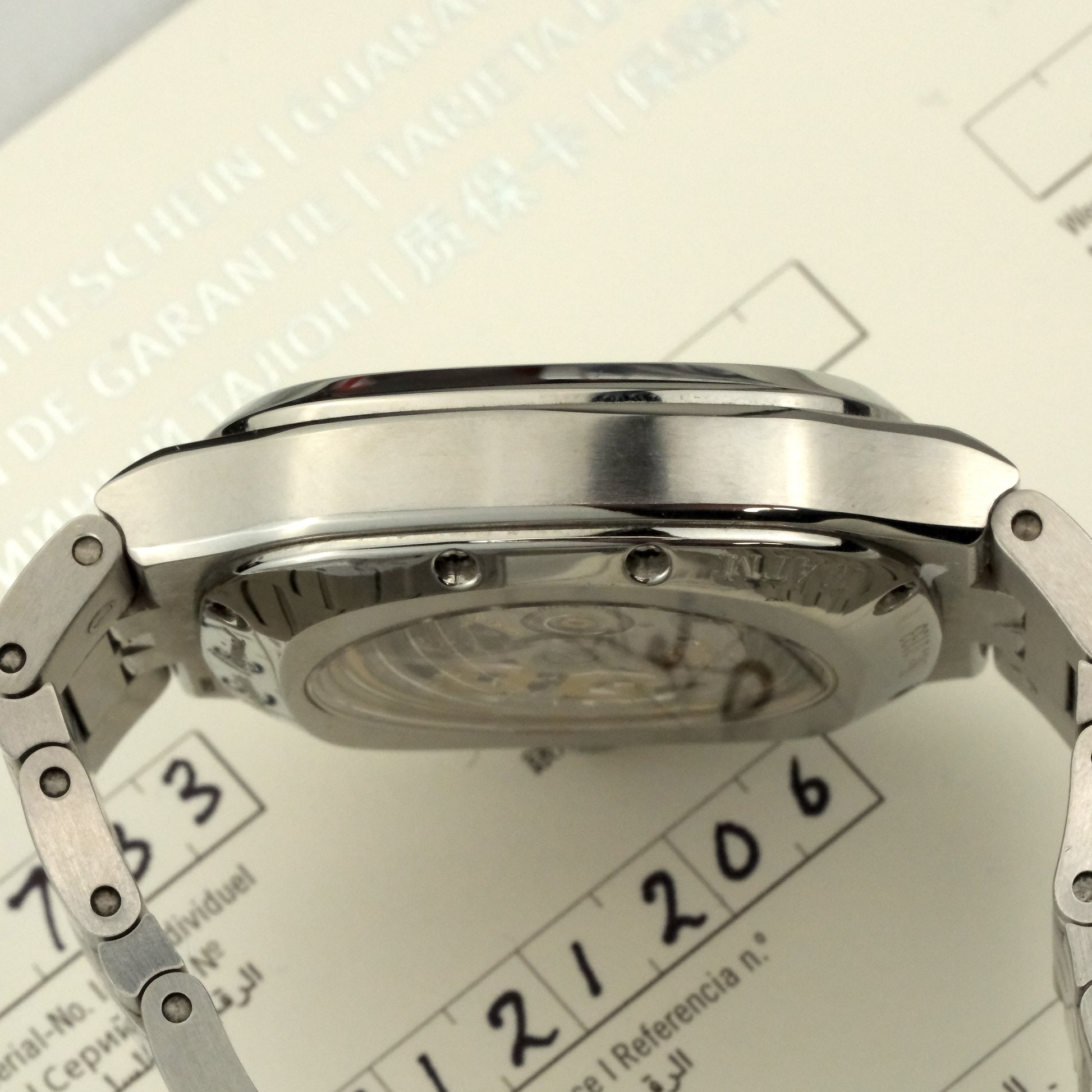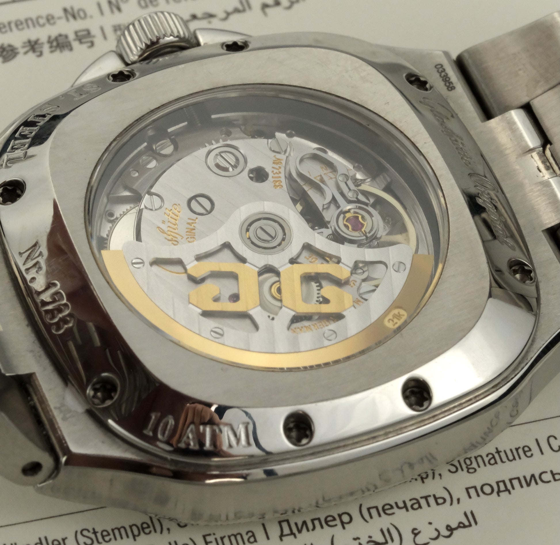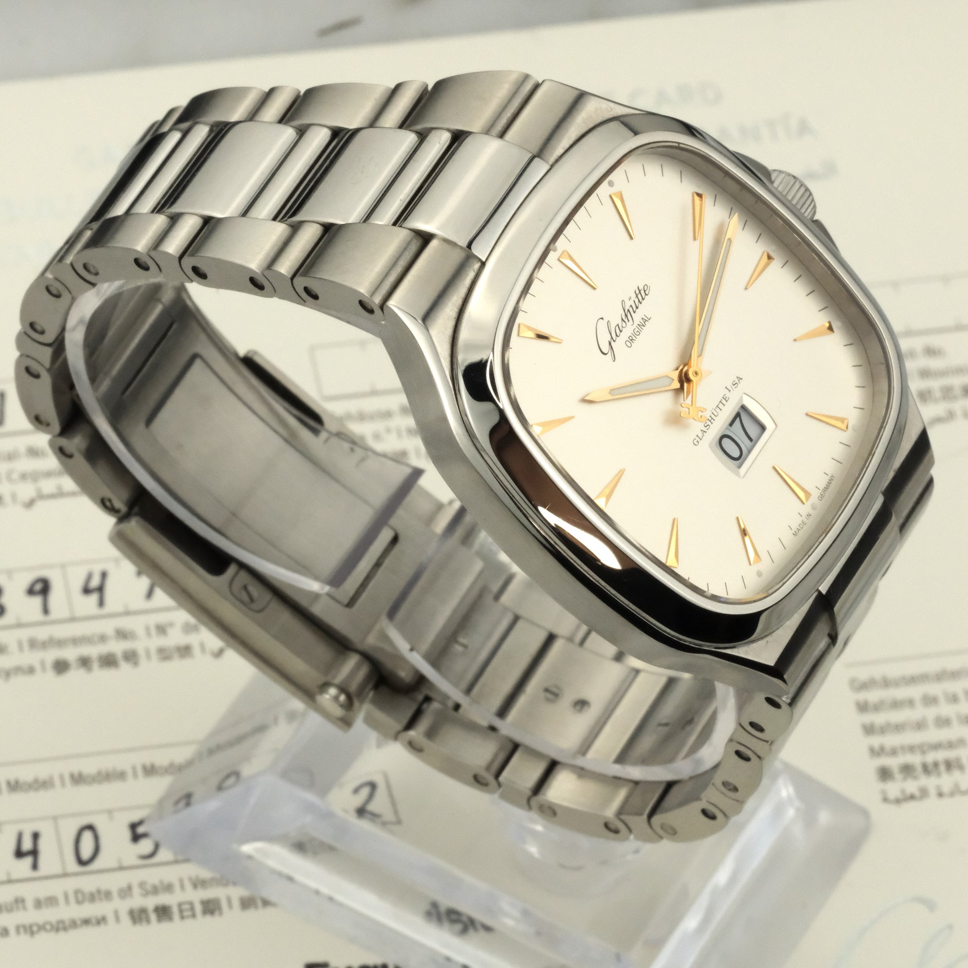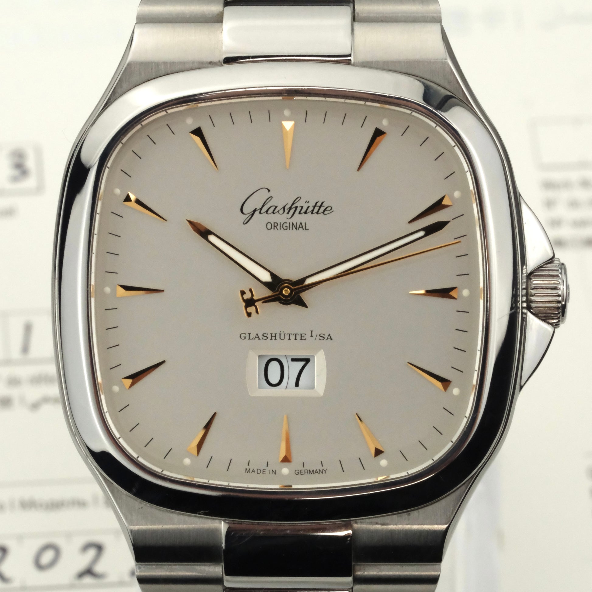 The Watch: The Glashütte Original Seventies Panorama Date explicitly calls back to the classic watch designs of the 1970's (Royal Oak, Nautilus, Ingenieur), this time in modern German watchmaking. Its distinctive 40mm x 40mm stainless steel case, with a brushed finish and polished edges, reflects the play with case shapes so common in the era.