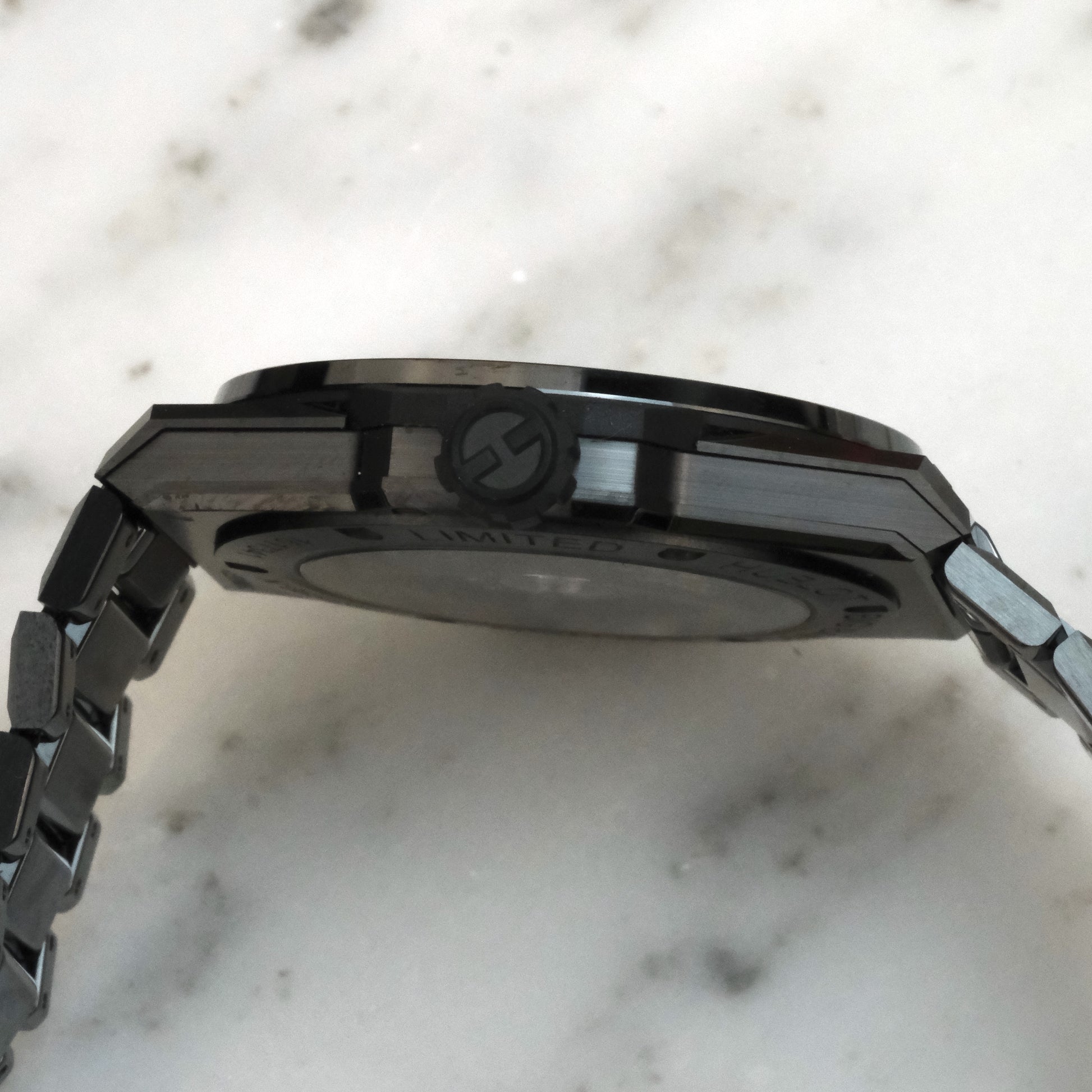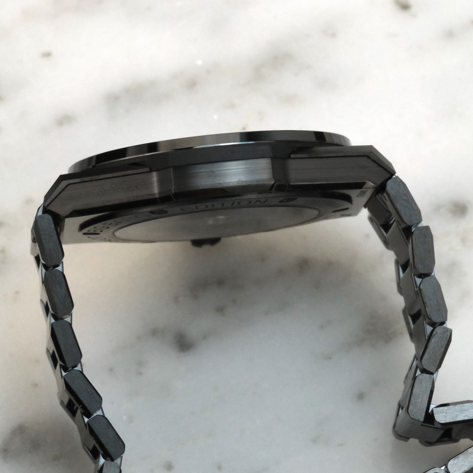 With its short lugs and integrated bracelet, the watch wears comfortably while maintaining a strong, modern wrist presence. The “All Black” design plays with contrasts of light and shadow rather than color, making it understated but striking.
