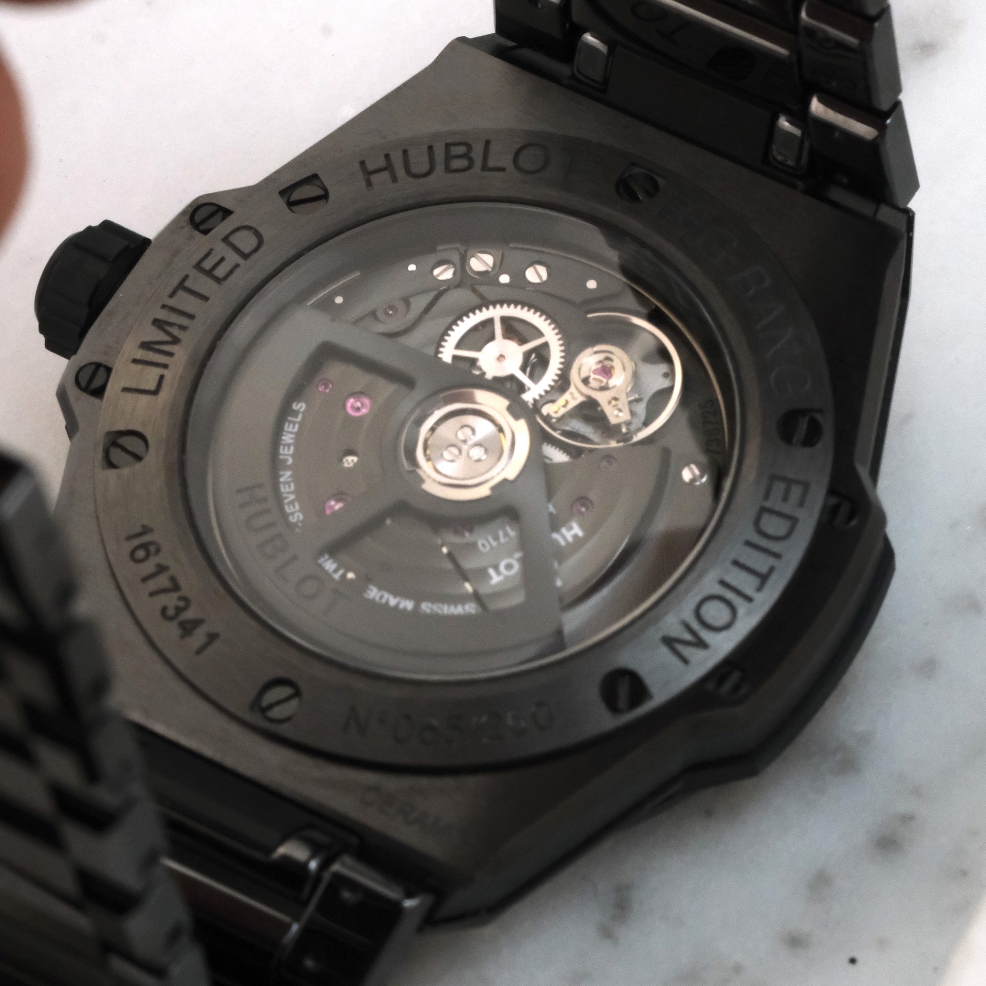 The Watch: The Hublot Big Bang Integrated Time Only Ref. 456.CX.0140.CX distills the brand’s bold, architectural design language into a sleek, three-hand format. Crafted in black ceramic, the 40mm case and fully integrated bracelet offer a stealthy, monochrome presence on the wrist. The material is lightweight, highly scratch-resistant, and given a mix of polished and satin finishes for visual depth.