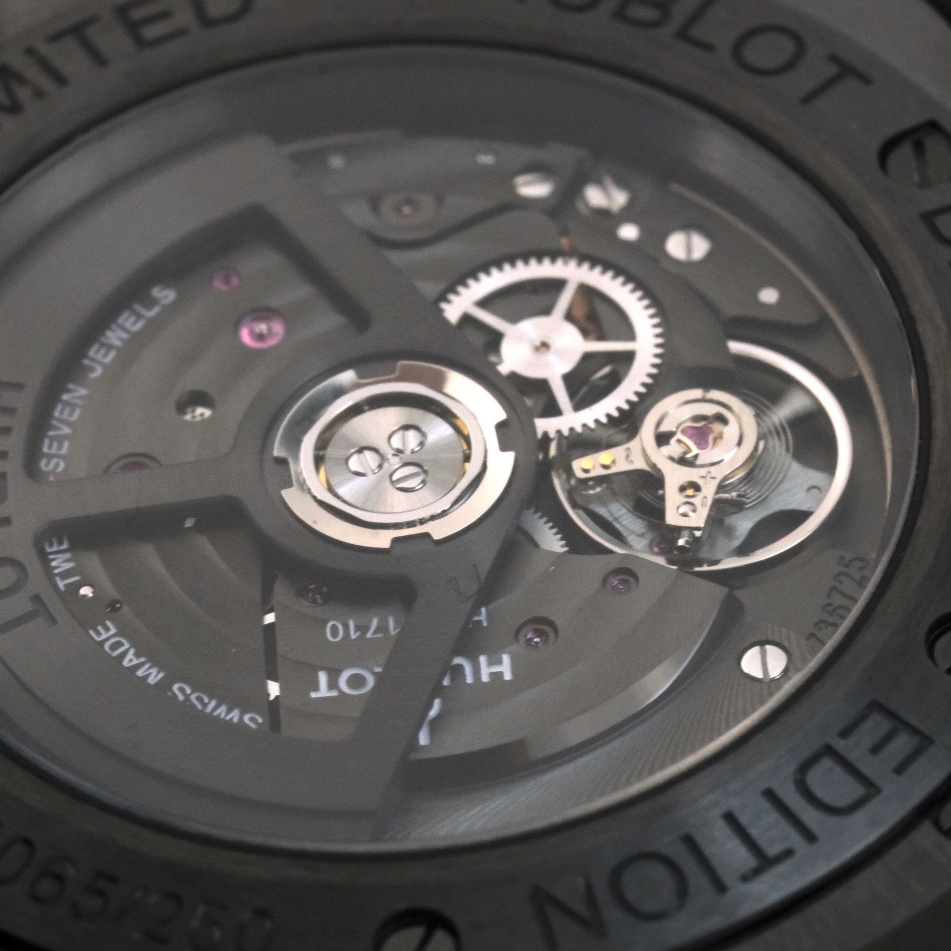 The skeletonized dial maintains Hublot’s layered, technical aesthetic, revealing the in-house automatic Caliber HUB1710 beneath. This movement offers a 50-hour power reserve, beats at 4Hz, and is visible through both the open dial and sapphire caseback.
