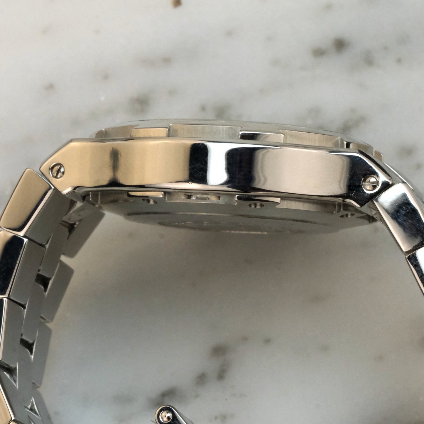 The bracelet on this model is particularly noteworthy: a multi-faceted design with twin polished channels and finely finished internal surfaces, secured with screws rather than pins. The double-deployant clasp includes a ceramic snap system to ensure longevity, as well as a Maltese cross motif locking system. The case and bracelet are mounted with solid screw bars rather than spring bars, underscoring the robust construction throughout.