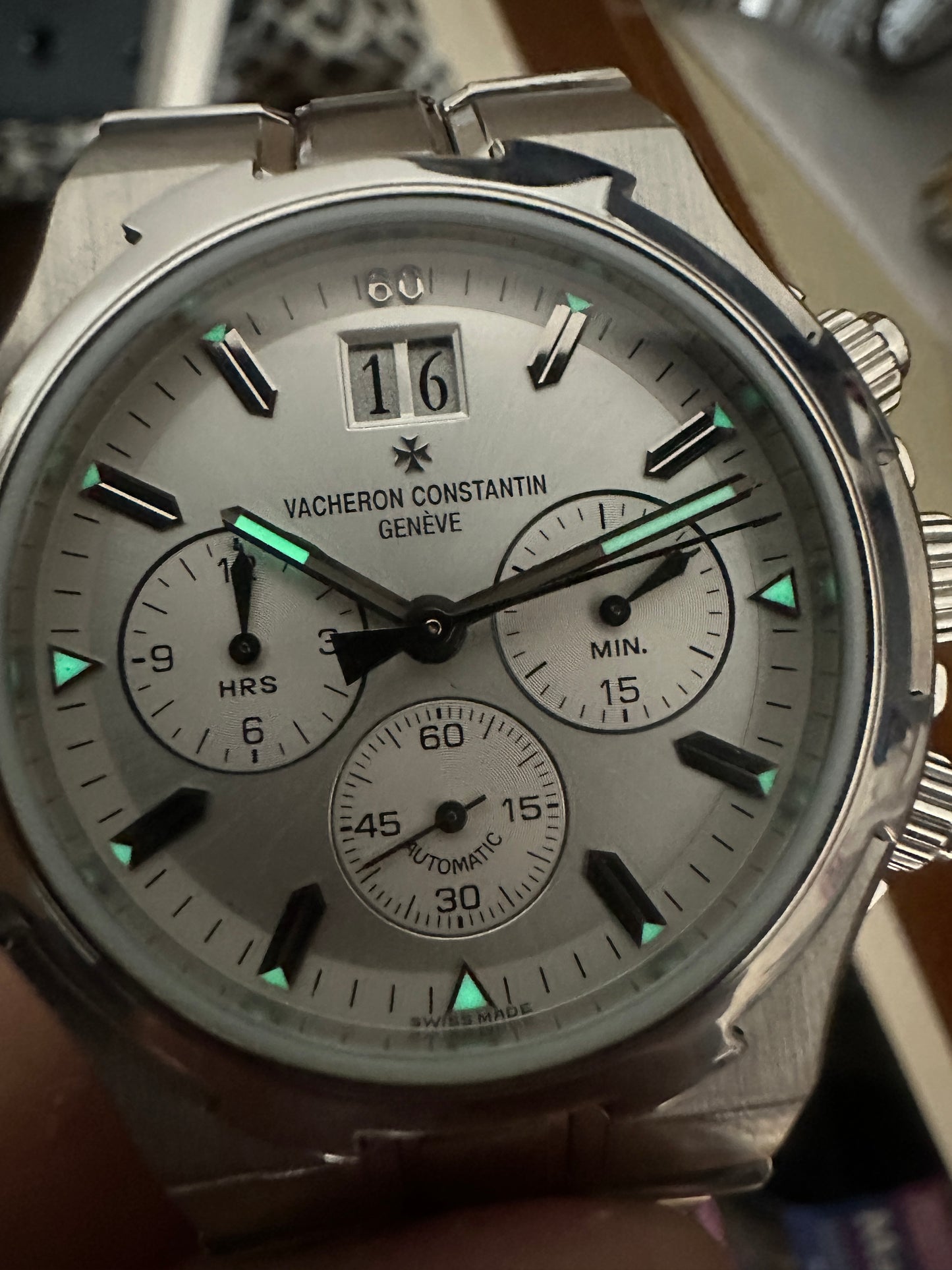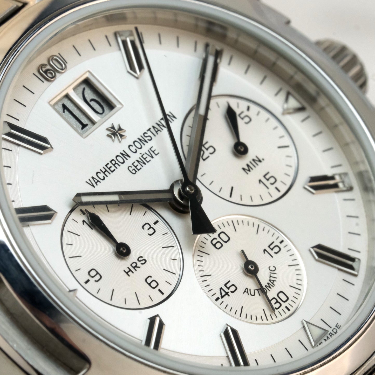 The movement inside is the Vacheron Caliber 1137, based on the Frederic Piguet 1185, with the addition of a big date module. It is a fully integrated column wheel chronograph with a vertical clutch for smooth starts and stops, a 40-hour power reserve, bidirectional automatic winding, and excellent finishing throughout.