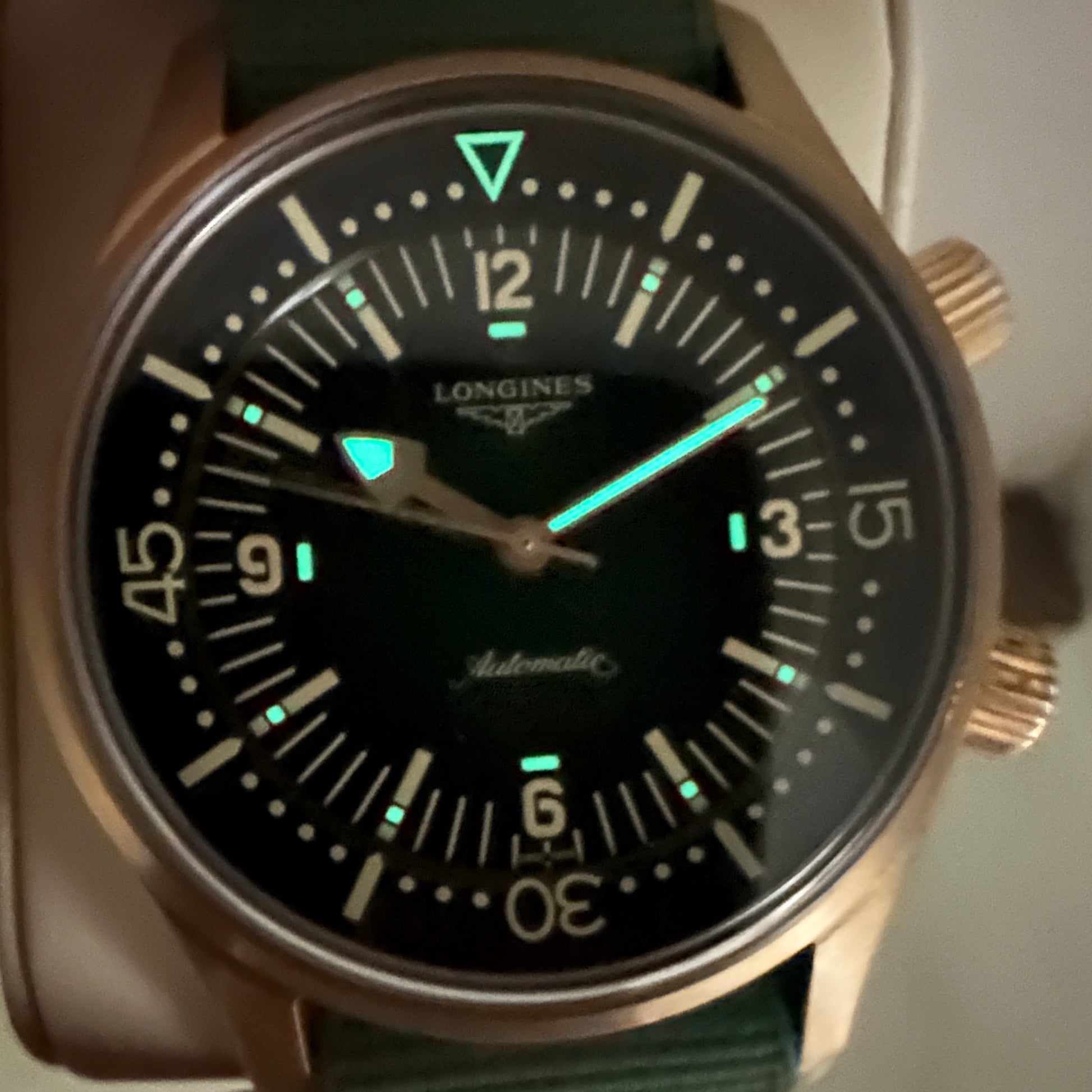 The Watch: The Longines Legend Diver in bronze is a modern reimagining of the brand’s 1960s compressor-style dive watches—updated with contemporary materials and refined finishing. Reference L3.774.1.50.2 features a 42mm bronze case that develops a warm patina over time, giving each piece its own unique character. The green fumé lacquer dial features gilt details, luminous markers, and the distinctive dual-crown configuration for operating the internal rotating bezel.
